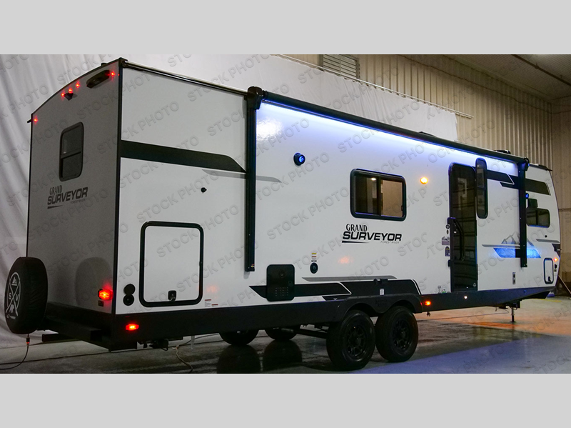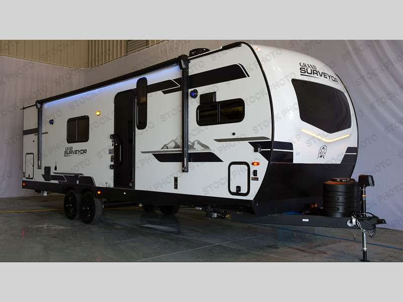 With any Grand Surveyor travel trailer by Forest River you will enjoy turn-key ready-to-go features and quality construction! Each model includes Azdel composite walls and a gel coated fiberglass front cap with an automotive style tinted windshield for a sleek look. There are friction hinge black glass entry door(s), an adjustable platform step with a night light, plus Goodyear tires and a power tongue jack for easy towing. The interior will have you feeling right at home with roller shades, residential faucets, sinks, and bathroom vanity, plus Surf(x) seamless countertops throughout. You can also plan for adventure with a 2" rear accessory and exterior spray port, and there are slam latch baggage doors throughout to keep all your gear secure. Other stand-out features include a central vacuum system, a 200 watt solar panel with a 30 amp controller, a tankless water heater, carpet-free interiors, and the list goes on!