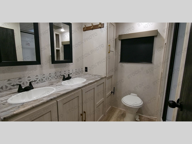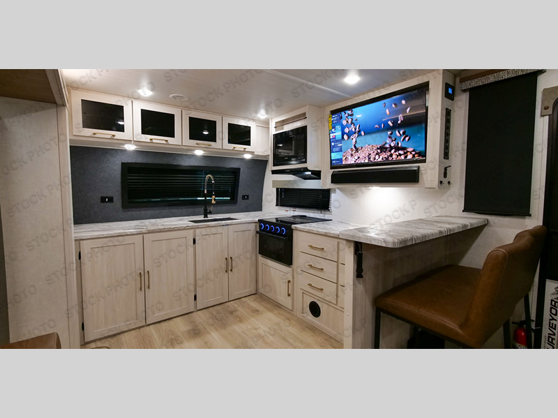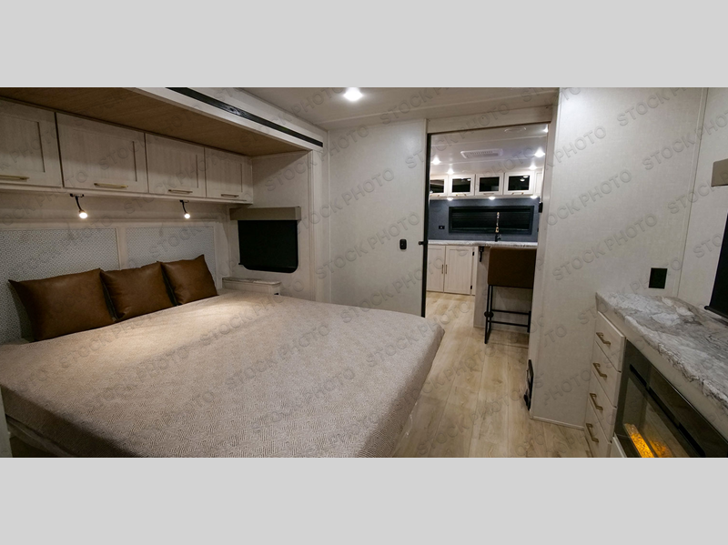This couple's trailer will be giving you all the glamping vibes! There is a front kitchen with ample counter space, along with a counter with two bar stools, a central vacuum to easily clean up, and a slide out for more space! The second slide out is found in the middle master bedroom where you'll also enjoy a custom king bed across from a bedroom fireplace, a wardrobe, and a dresser with TV prep. Head towards the back and you'll be wowed by the full bath with dual bath sinks, an upgraded slow-close shower door, and a closet with washer and dryer prep. The exterior is just as impressive as the interior with its outside kitchen, 20' power awning with LED lights, pass-through storage, TV coax, and so much more!