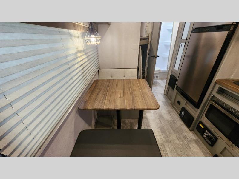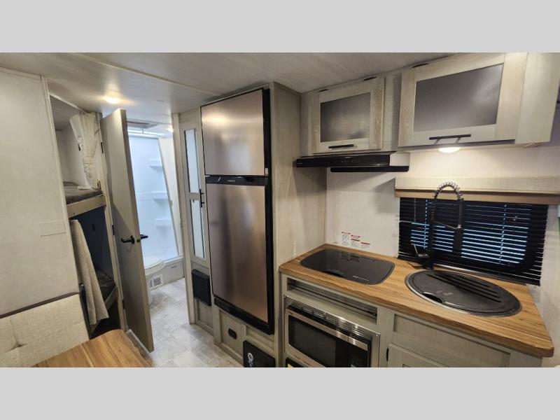 Once at camp, you can head out to explore to return to a versatile front area that offers a sofa during the daytime and a Murphy bed at night. There is a dinette for two to dine at as well as one to sleep on if needed, plus the galley kitchen provides the cook everything they need to feed one to several. There is a pantry as well. The 44" x 74" bunks will sleep two and maybe four kiddos, and the full bathroom will keep everyone refreshed. There is a pass-through compartment for the larger items like fishing poles and outdoor tables and a 14' awning for some sun protection. And you might like to add the optional Unplugged Package that comes with premium lithium-ion batteries, an easy view control panel, a high efficiency A/C, and more!