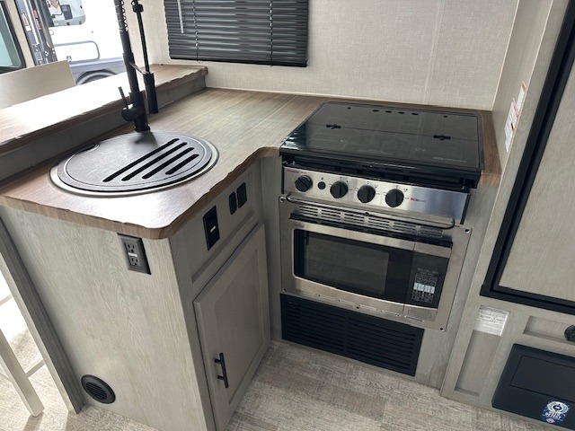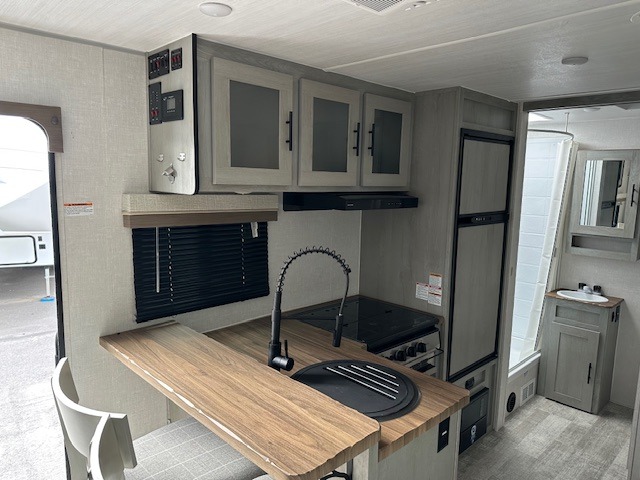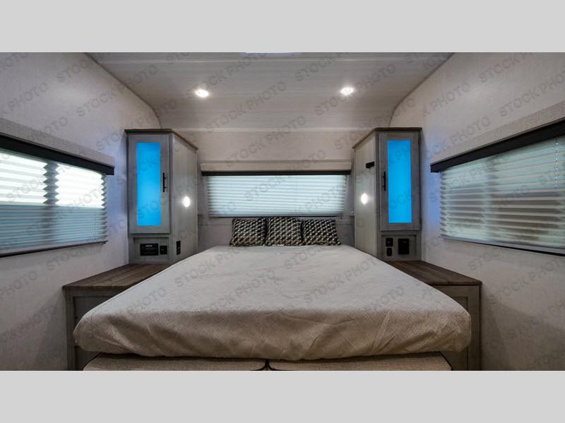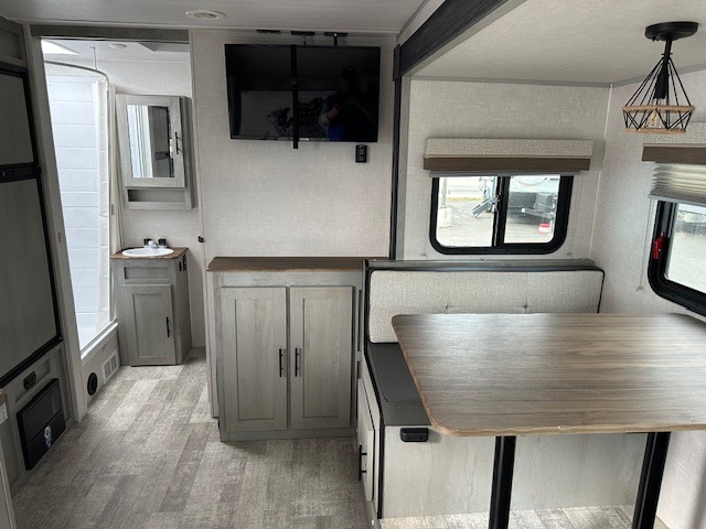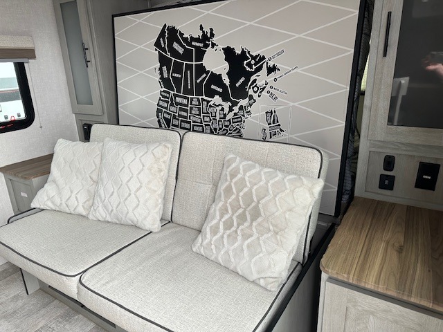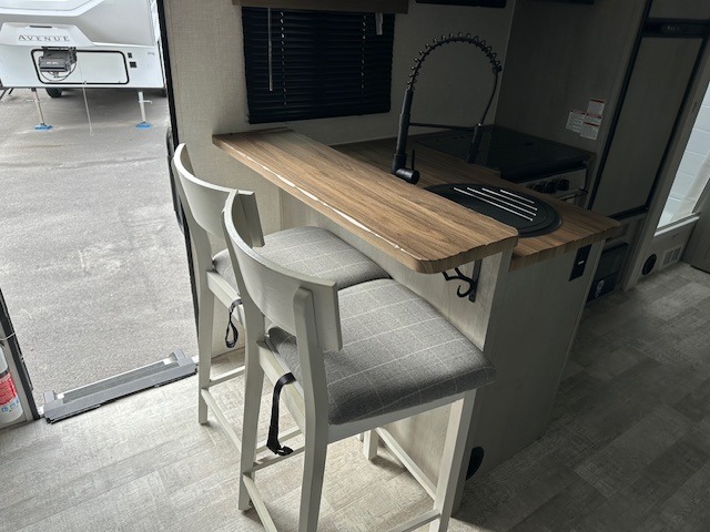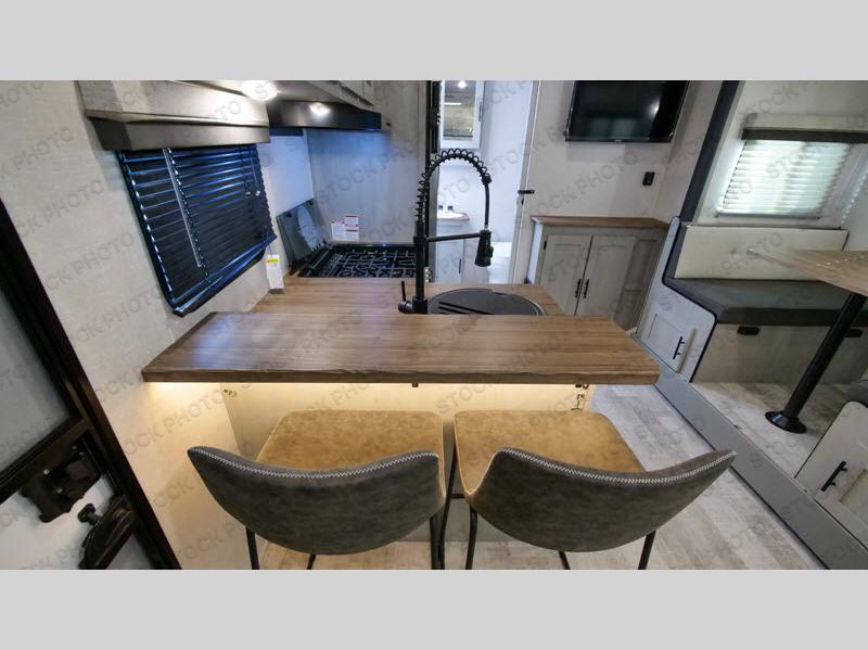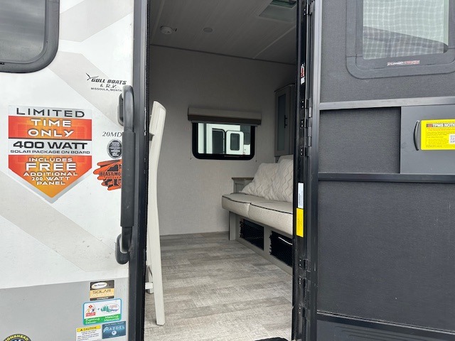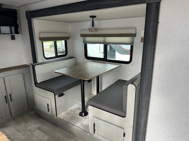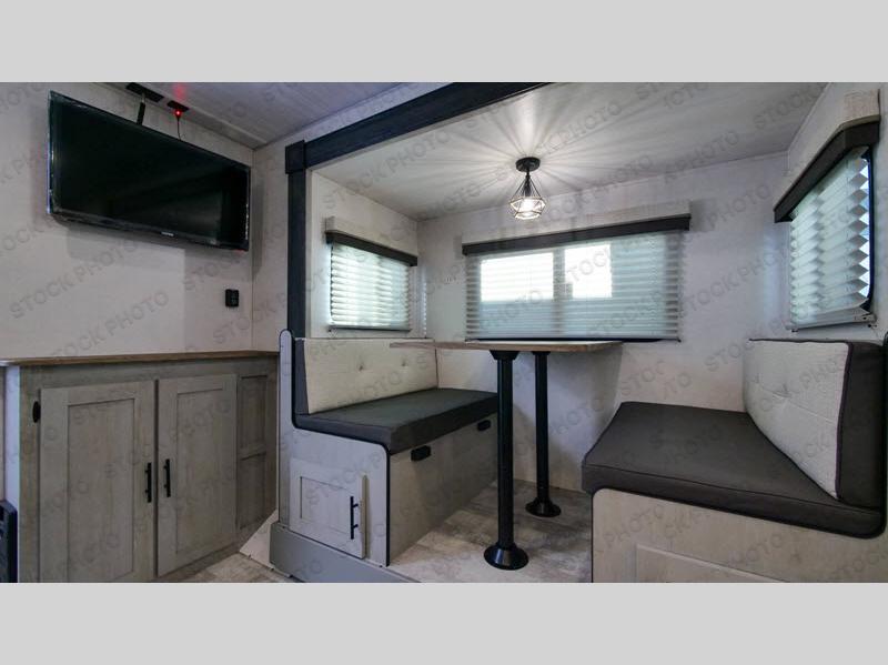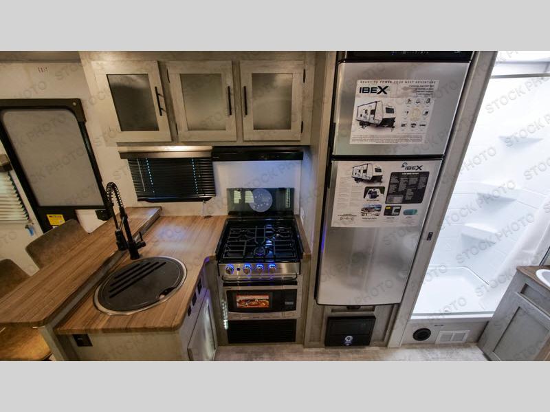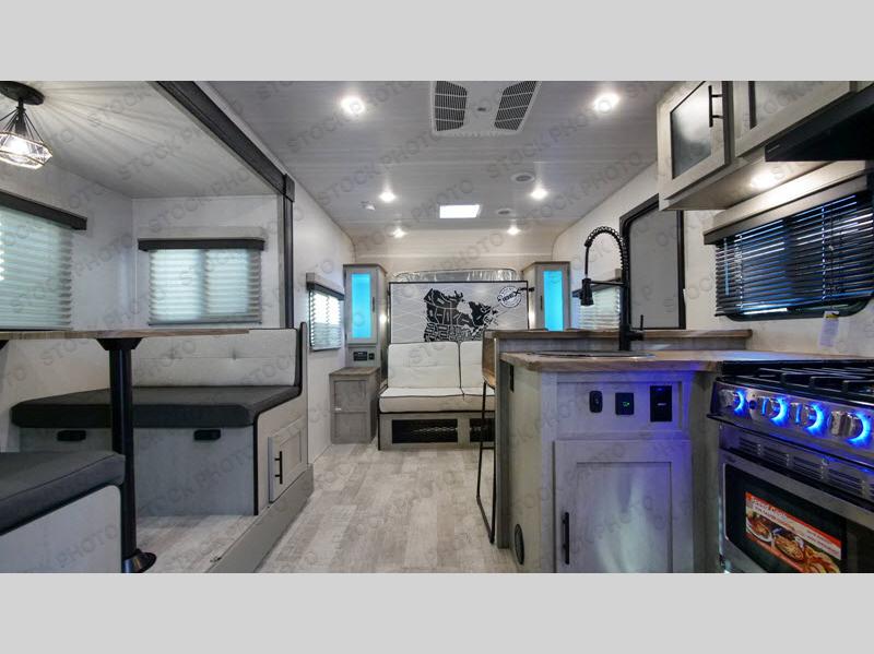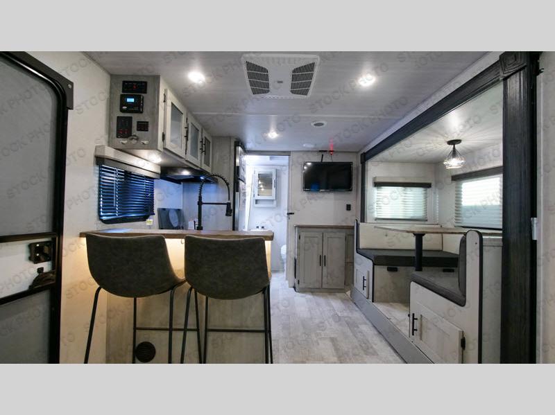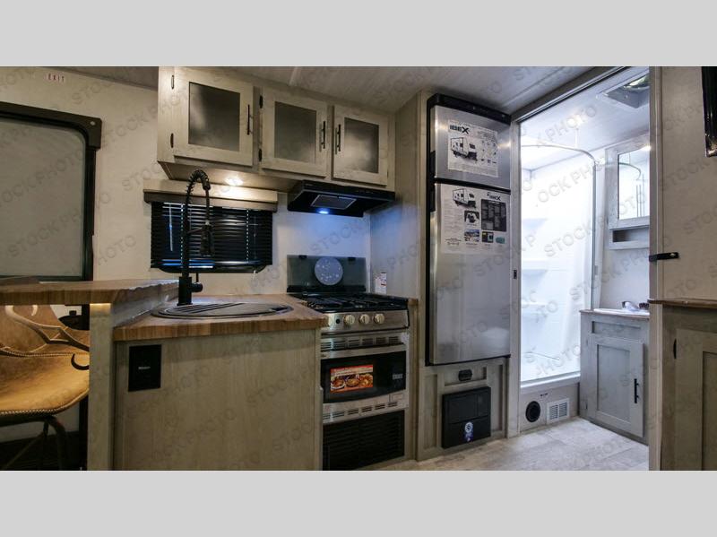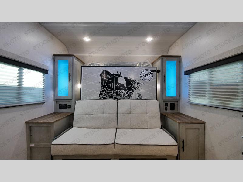 This Forest River IBEX travel trailer has a clever use of space that gives you a lot of options. The kitchen features a seamless L-shaped countertop with bar stool seats, or you can eat at the booth dinette that is tucked into its own slide out so there's plenty of floor space. The sofa is across from the entertainment center, so you can watch the 12V TV or relax. When it's time for bed, there's a 60" x 80" Murphy bed which will be super comfortable for a good night's sleep! The rear bath has a roomy shower and a wardrobe to store all your things. And you might like to add the optional Unplugged Package that comes with premium lithium-ion batteries, an easy view control panel, a high efficiency A/C, and more!