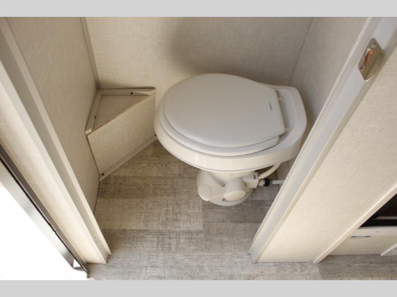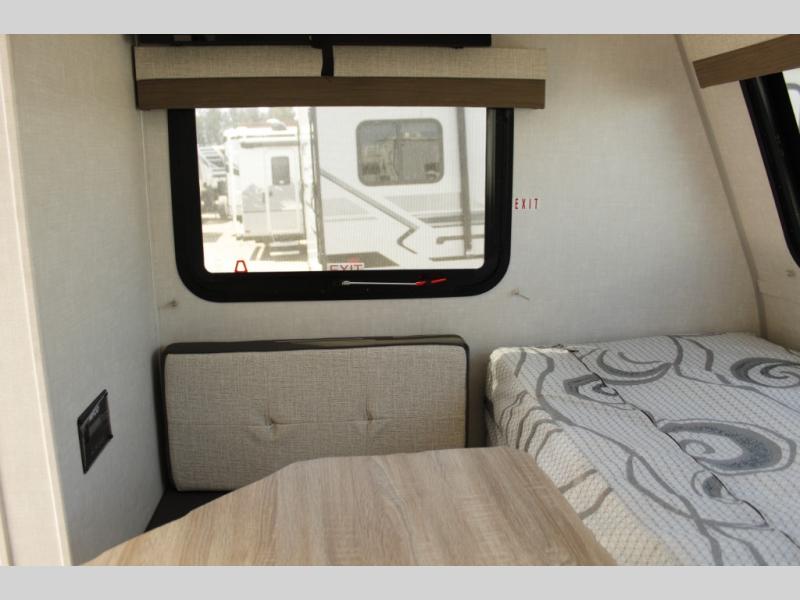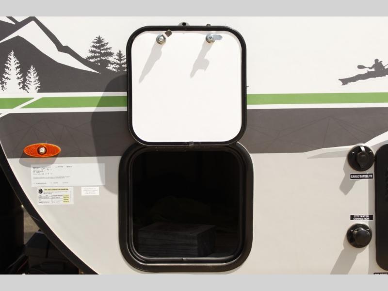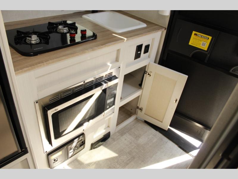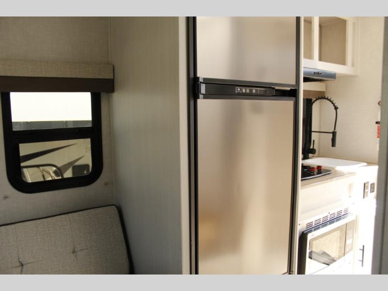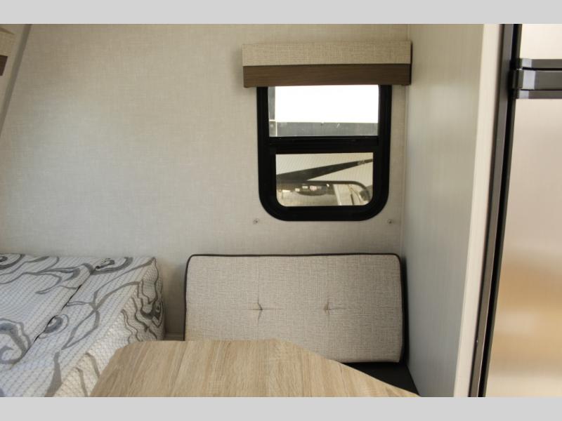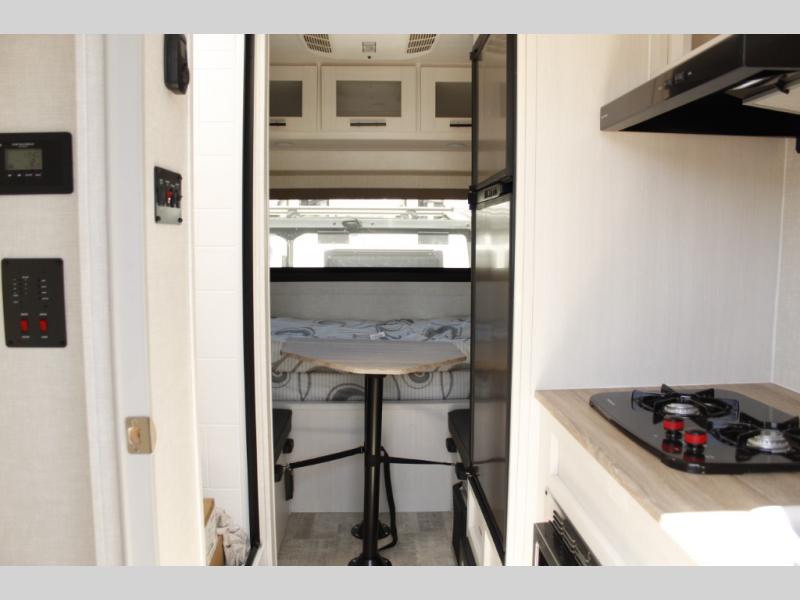 This is the perfect couples unit that features everything that you need to enjoy traveling and exploring yet keeping your tow length and weight down. The unique rear entry makes this unit easy to access, and just inside the rear door there is a private toilet area for quick access when you are outside and you need the bathroom. A front queen bed that is 60" x 74" provides a great night's rest, and can easily convert to a booth dinette when needed for inside seating and meals. The two burner cooktop, sink, and refrigerator allow you to make easy camp meals inside if you'd like.