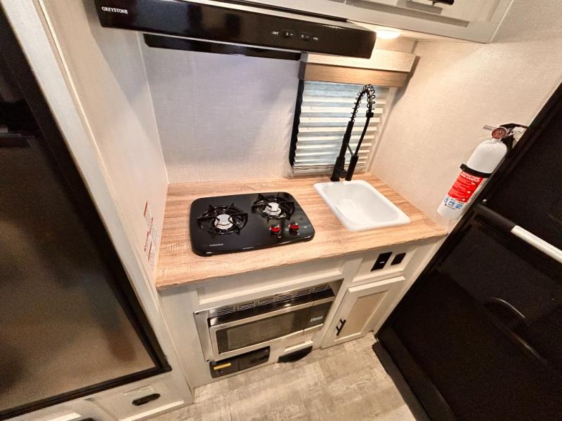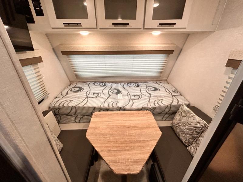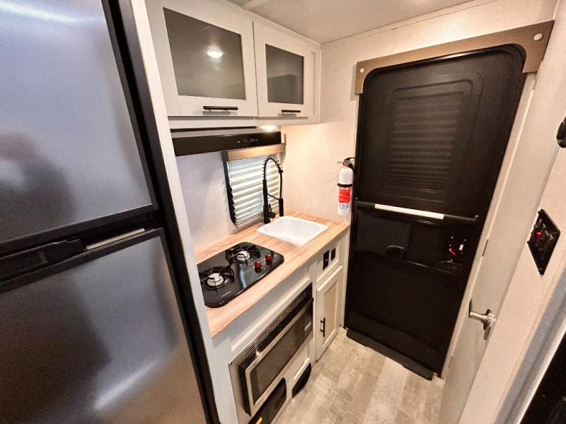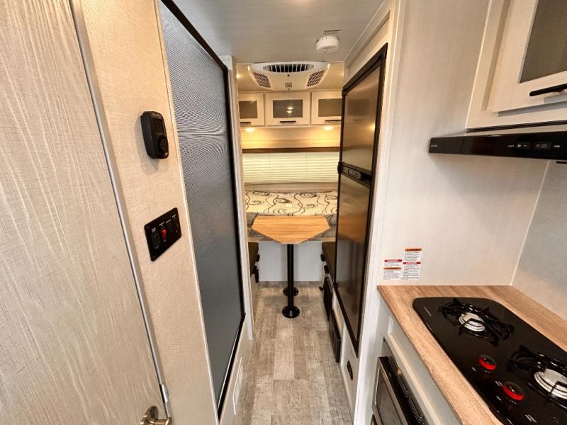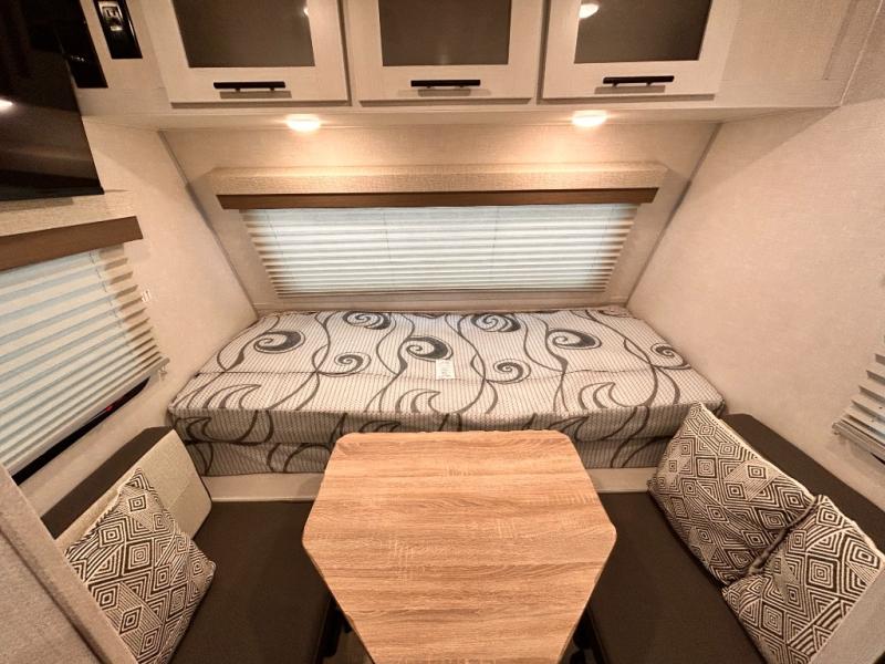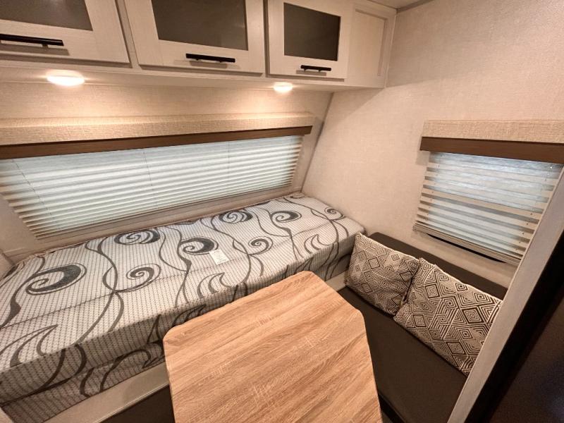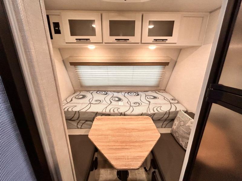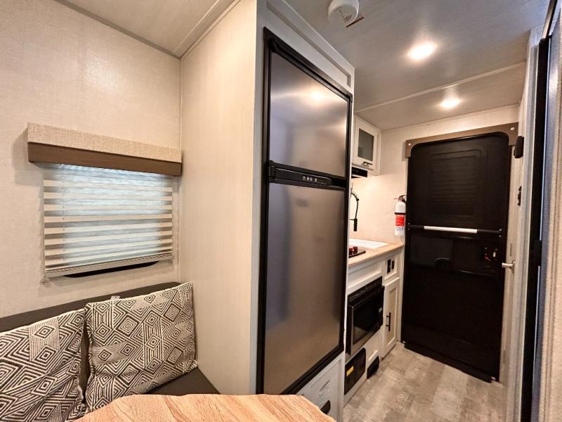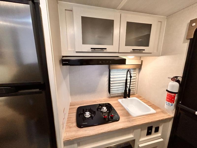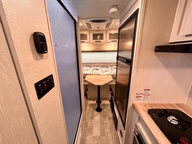 This is the perfect couples unit that features everything that you need to enjoy traveling and exploring yet keeping your tow length and weight down. The unique rear entry makes this unit easy to access, and just inside the rear door there is a private toilet area for quick access when you are outside and you need the bathroom. A front queen bed that is 60" x 74" provides a great night's rest, and can easily convert to a booth dinette when needed for inside seating and meals. The two burner cooktop, sink, and refrigerator allow you to make easy camp meals inside if you'd like.