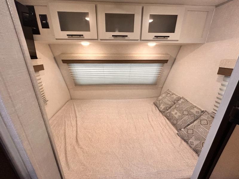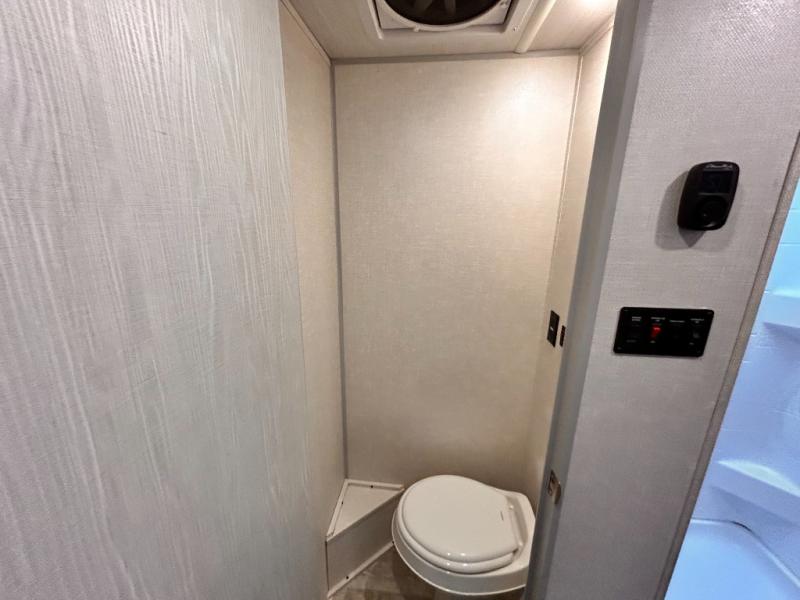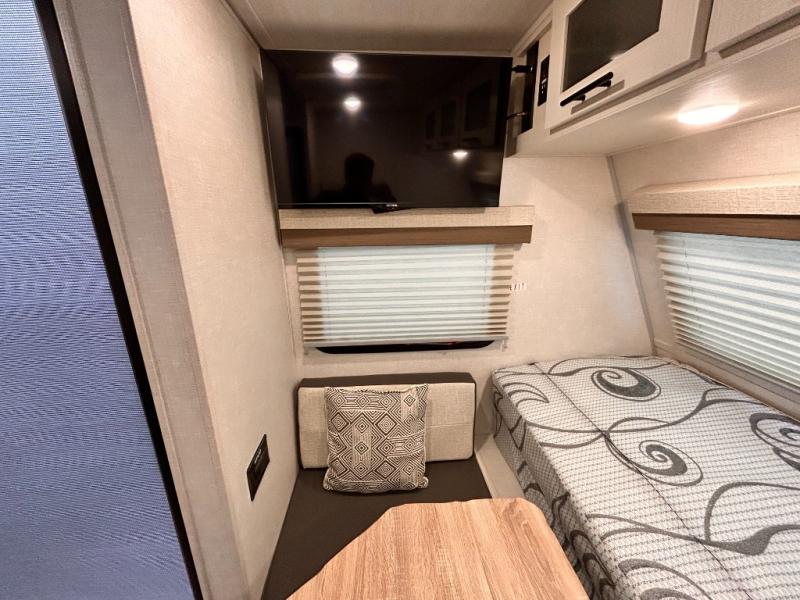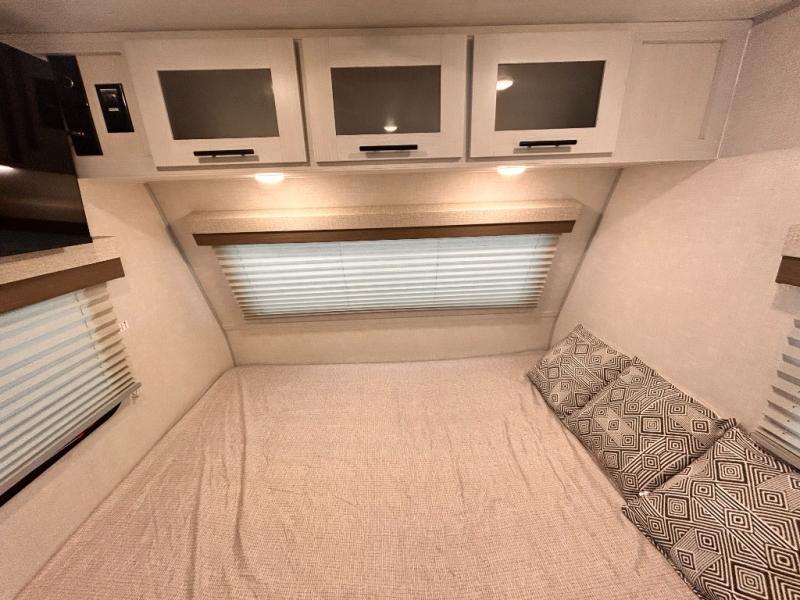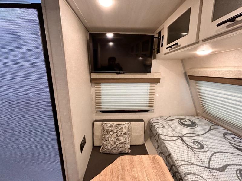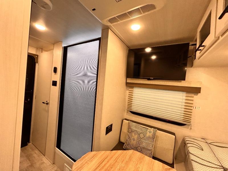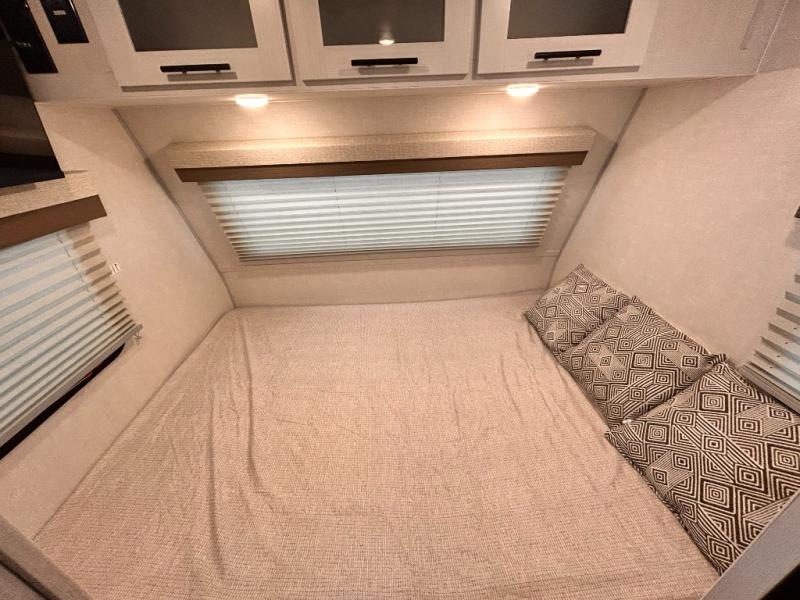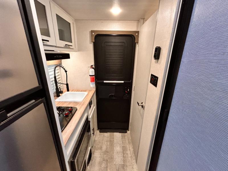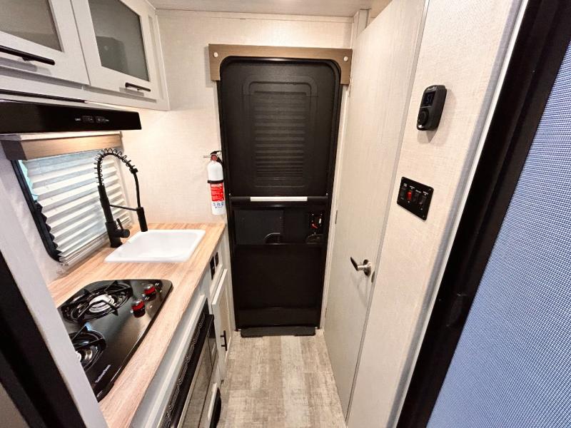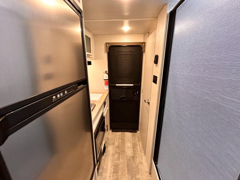 This is the perfect couples unit that features everything that you need to enjoy traveling and exploring yet keeping your tow length and weight down. The unique rear entry makes this unit easy to access, and just inside the rear door there is a private toilet area for quick access when you are outside and you need the bathroom. A front queen bed that is 60" x 74" provides a great night's rest, and can easily convert to a booth dinette when needed for inside seating and meals. The two burner cooktop, sink, and refrigerator allow you to make easy camp meals inside if you'd like.