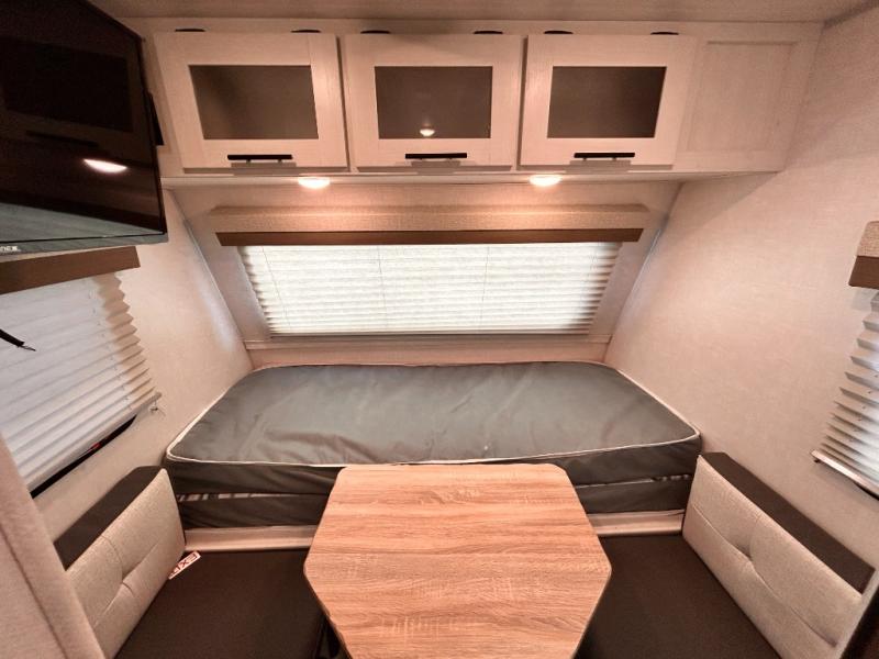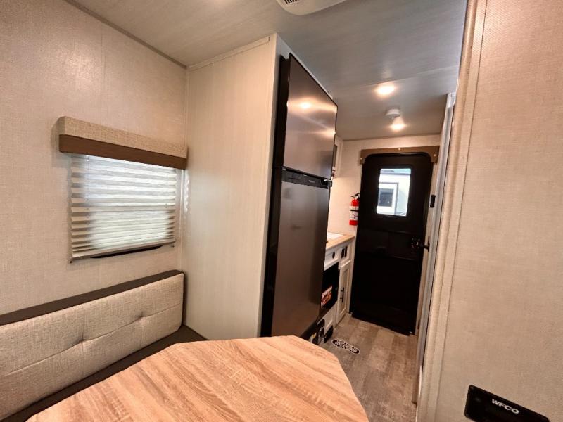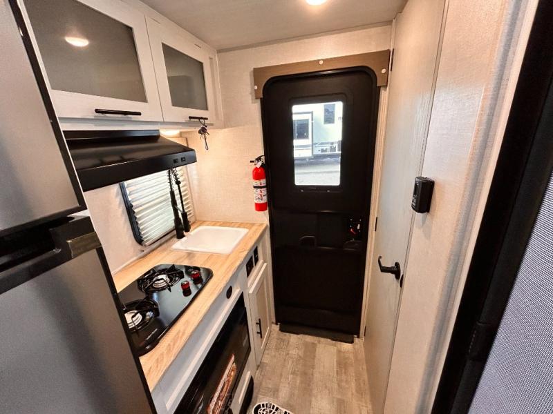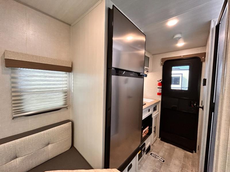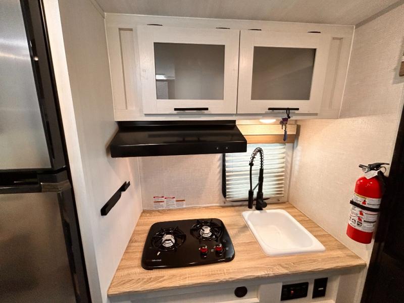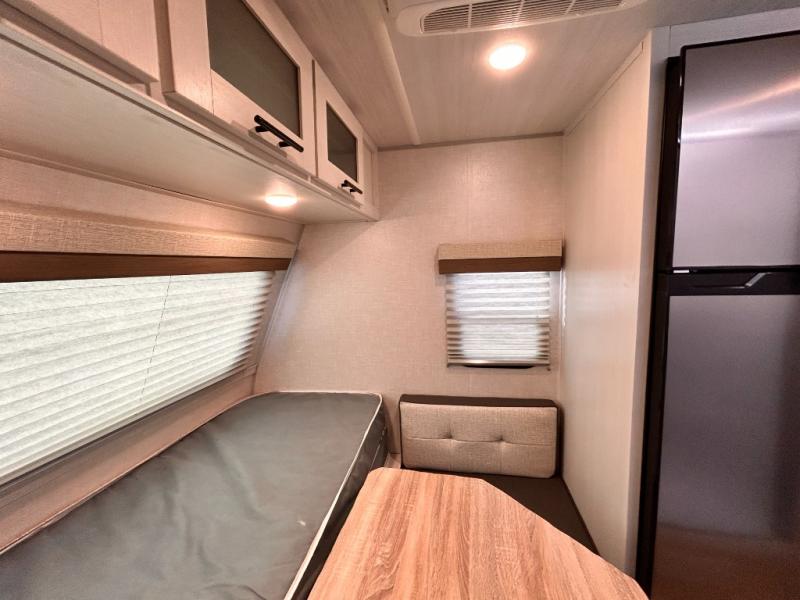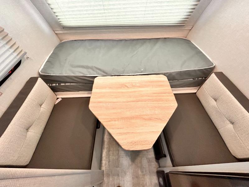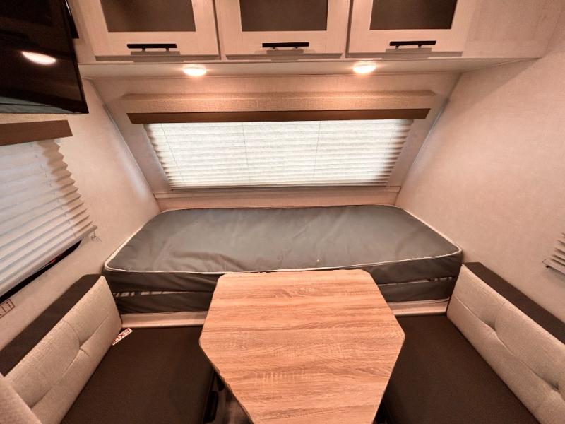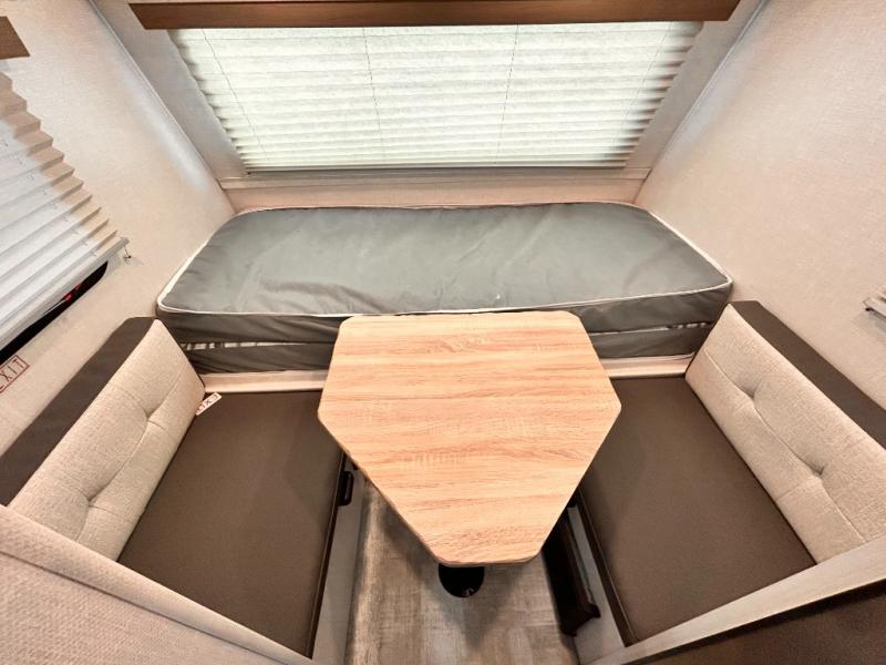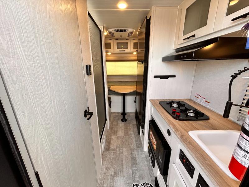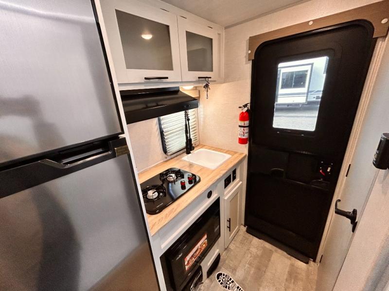 This is the perfect couples unit that features everything that you need to enjoy traveling and exploring yet keeping your tow length and weight down. The unique rear entry makes this unit easy to access, and just inside the rear door there is a private toilet area for quick access when you are outside and you need the bathroom. A front queen bed that is 60" x 74" provides a great night's rest, and can easily convert to a booth dinette when needed for inside seating and meals. The two burner cooktop, sink, and refrigerator allow you to make easy camp meals inside if you'd like.