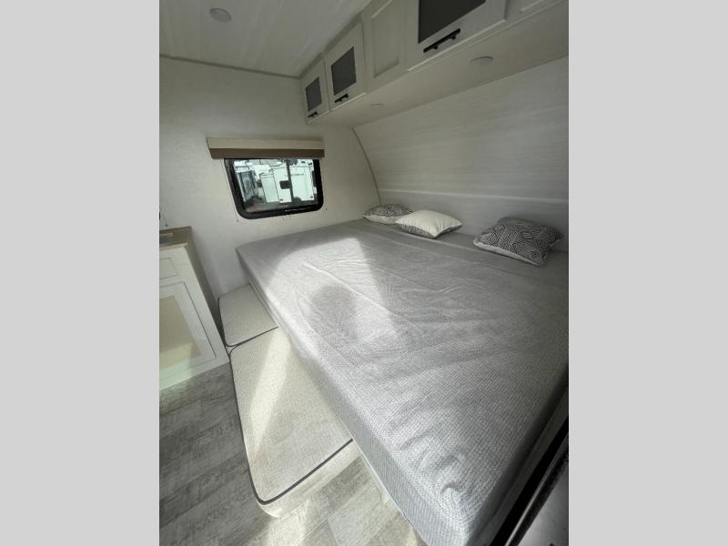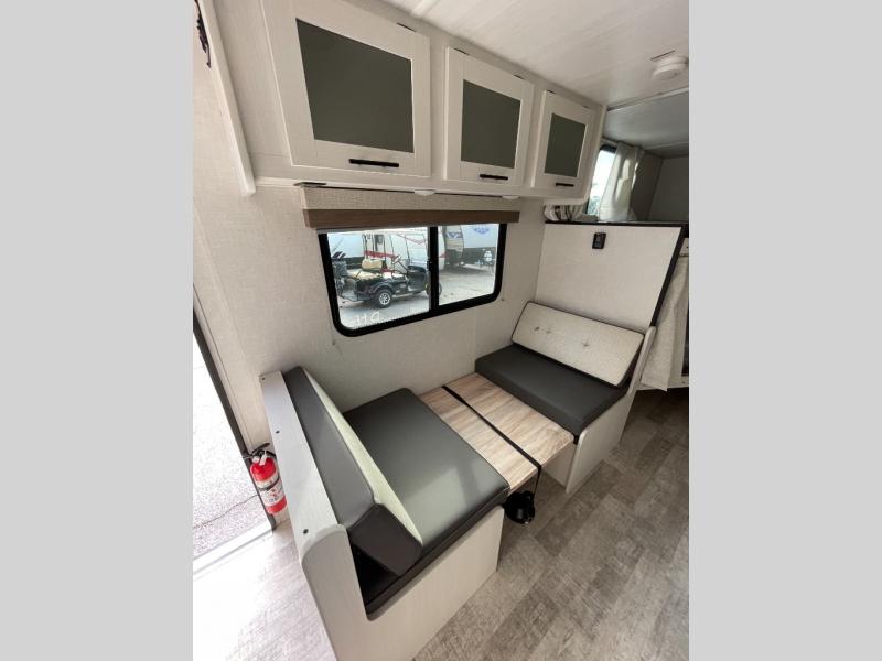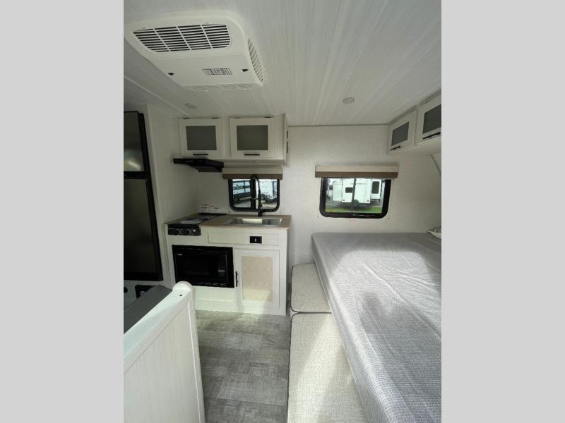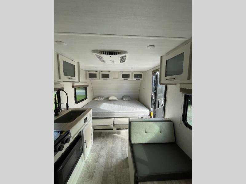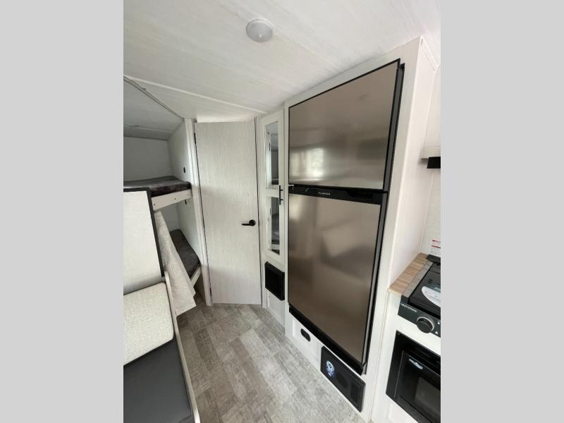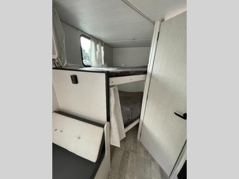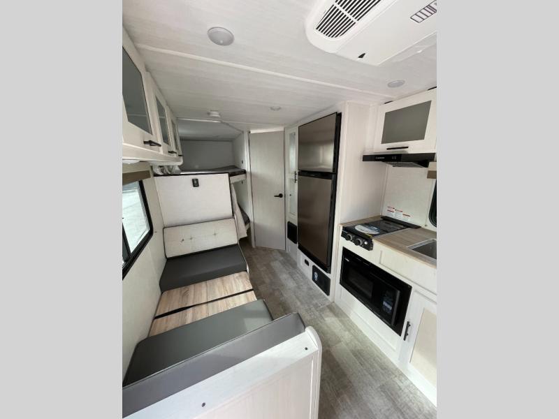 You'll have everything you need in this travel trailer and nothing you don't! Each day you can make meals on the cooktop, store food in the refrigerator and pantry, and dine at the 30" x 75" booth dinette. There is also a counter with stools the little ones will enjoy their breakfast at each morning. You'll enjoy the front queen-sized Murphy bed each night, and in the morning, just fold it away to relax on the sofa. This model also includes a rear corner bathroom with a shower to clean up in each day, a 15K A/C to keep you cool on a hot summer day, plus an awning to enjoy some shade while you're outdoors.