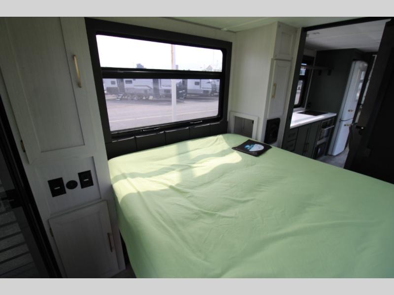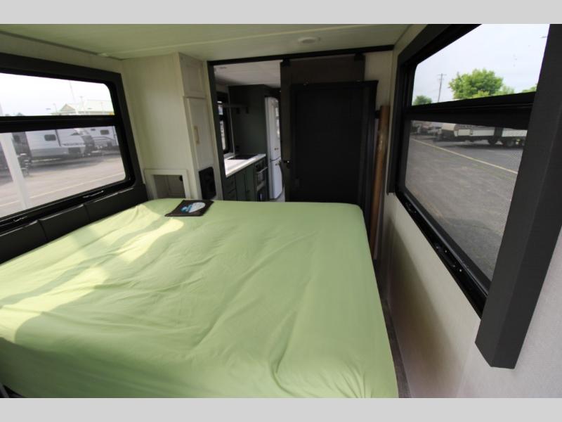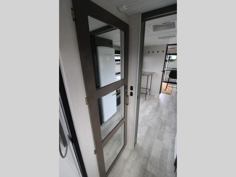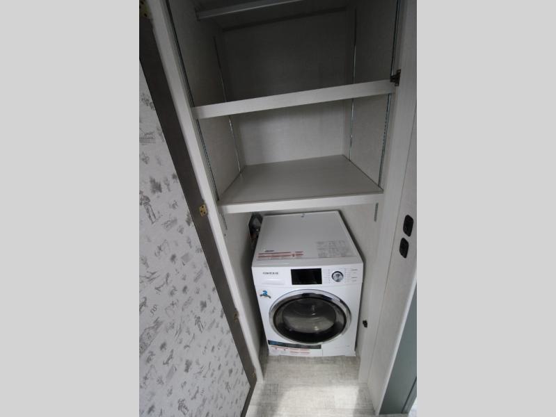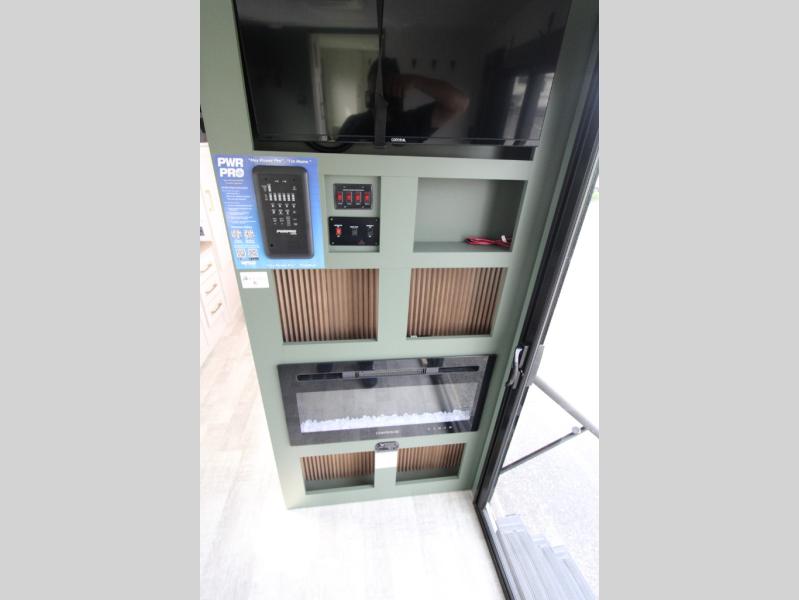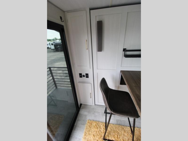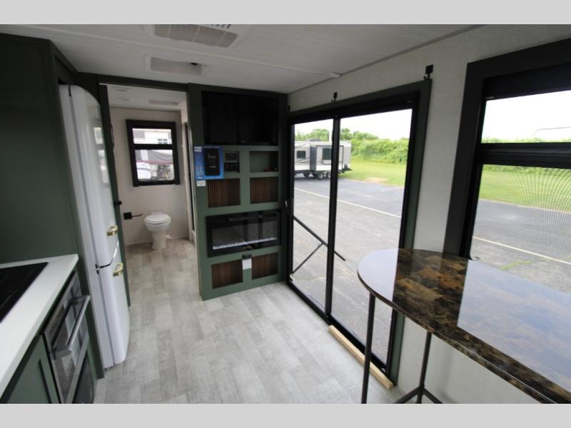 It won't be hard to find comfort in this travel trailer, whether you're camping on the weekends, or going full-time! There is a built-in king suite with a remote work area and standing desk that will allow you to utilize this room as a bedroom or office! There are also dual bedroom wardrobes for your things and rear doors that lead to a cozy sun deck! The middle living room/kitchen includes a luxury lounge, a fireplace, a two burner cooktop, and a 12 cu. ft. icebox refrigerator. You will love the front bath with dual bath sinks, two linen closets, plus a waterfall shower for added luxury. And the optional washer/dryer combo is an added benefit you might want to take advantage of!