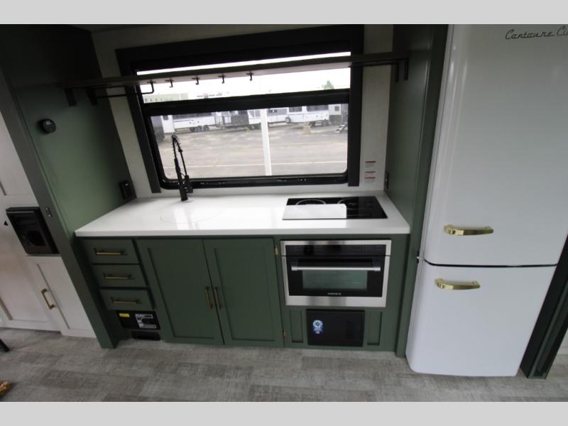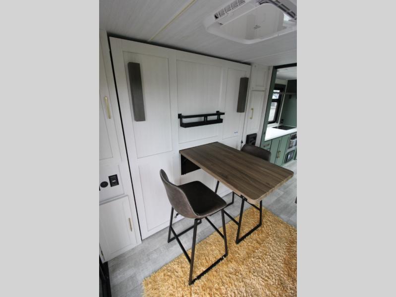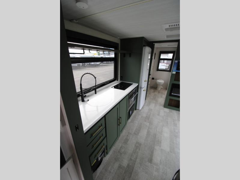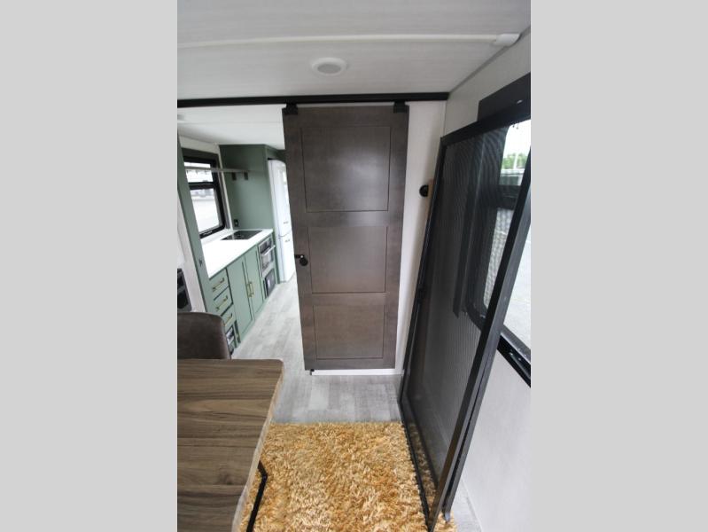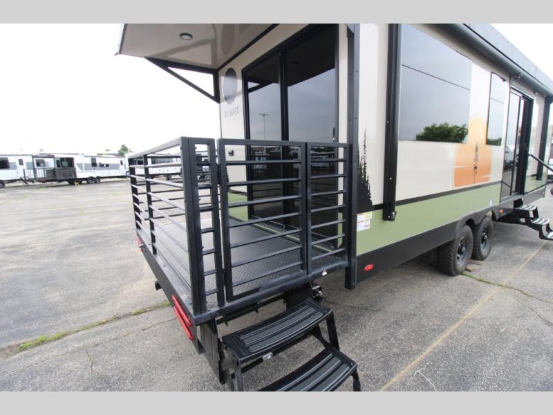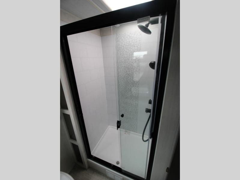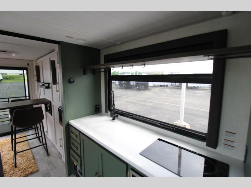It won't be hard to find comfort in this travel trailer, whether you're camping on the weekends, or going full-time! There is a built-in king suite with a remote work area and standing desk that will allow you to utilize this room as a bedroom or office! There are also dual bedroom wardrobes for your things and rear doors that lead to a cozy sun deck! The middle living room/kitchen includes a luxury lounge, a fireplace, a two burner cooktop, and a 12 cu. ft. icebox refrigerator. You will love the front bath with dual bath sinks, two linen closets, plus a waterfall shower for added luxury. And the optional washer/dryer combo is an added benefit you might want to take advantage of!