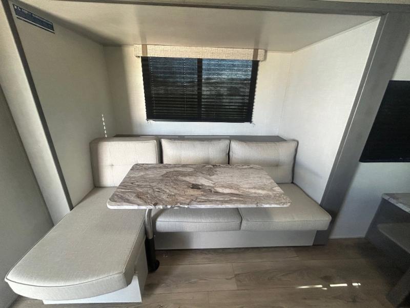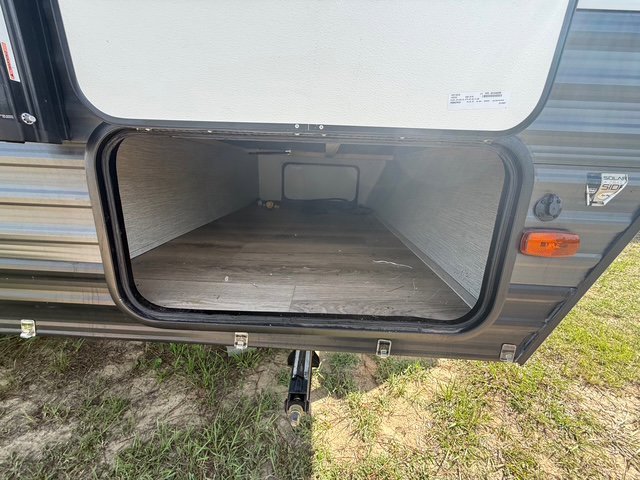 Start camping in this well-equipped travel trailer! The compact kitchen has everything you need to prepare your best home cooked meals and you can enjoy them at the convertible chaise lounge with a folding sofa and a table. Freshen up each morning in the rear corner bathroom with the corner shower and rest each night on the front queen bed with wardrobes on either side and overhead storage. Rinse the mud off your feet with the exterior hot/cold shower to be sure you do not track it all throughout the inside. Don't leave any of your outdoor gear behind; simply store it in the exterior full pass-through storage area!
