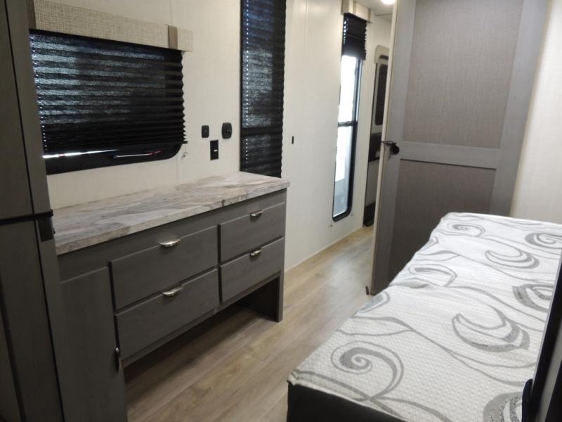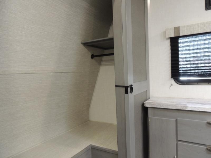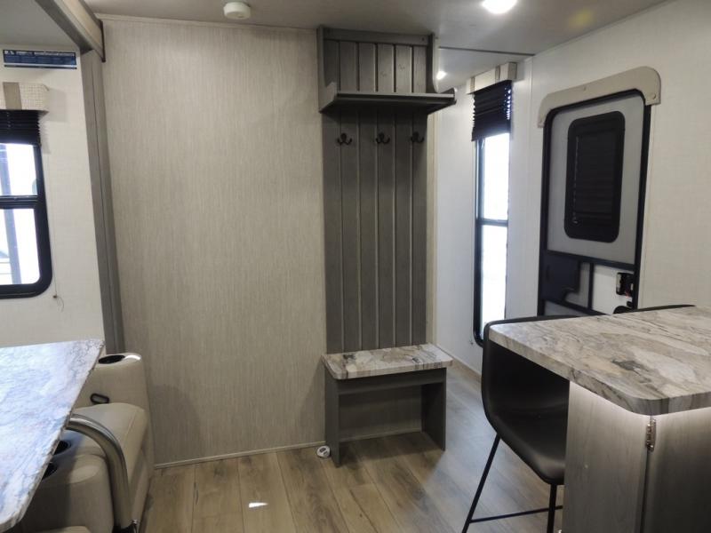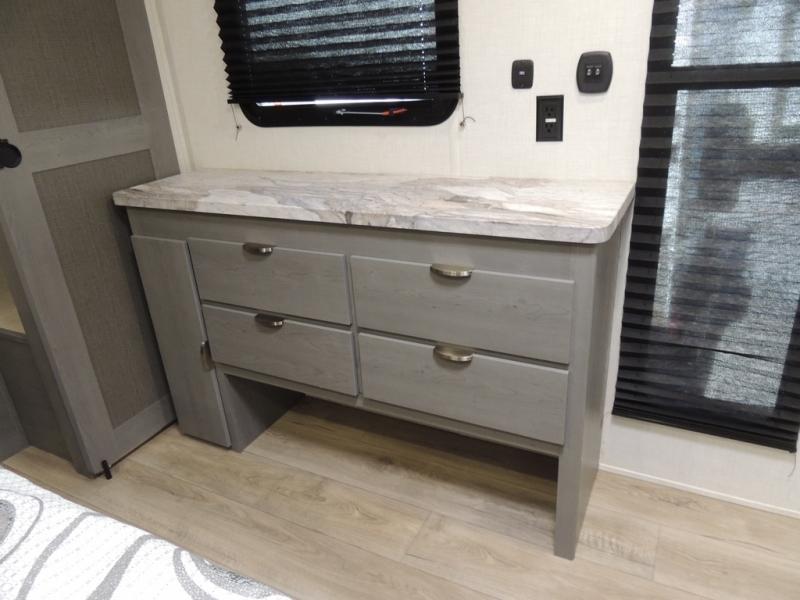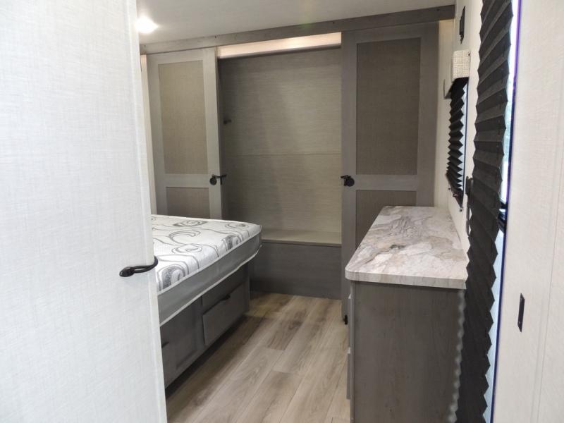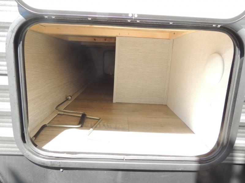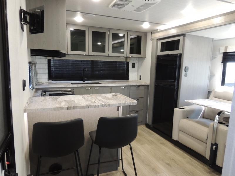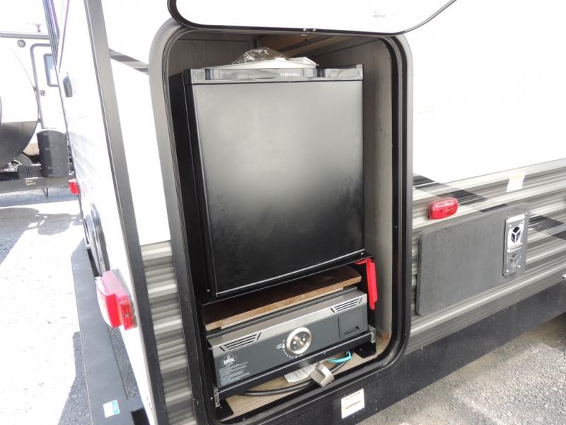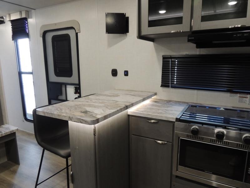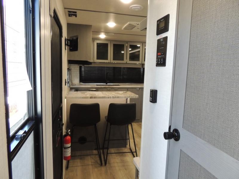This travel trailer provides ample space and amenities just like home! Once you step inside, you'll find a rear kitchen with tons of counter space and the living area with theater seating within a slide with direct TV viewing. There is a bar top with two stools where the little ones can enjoy their breakfast at, and a shoe rack where shoes won't get in the way. Head to the front of the unit to enjoy the private bedroom with a king bed slide out, a dresser with a TV hookup, plus a walk-in wardrobe, complete with washer and dryer prep! And don't overlook the exterior with its outdoor LP griddle and mini refrigerator, Solid Step entry steps, and quick drop stabilizer jacks for maximum stability!