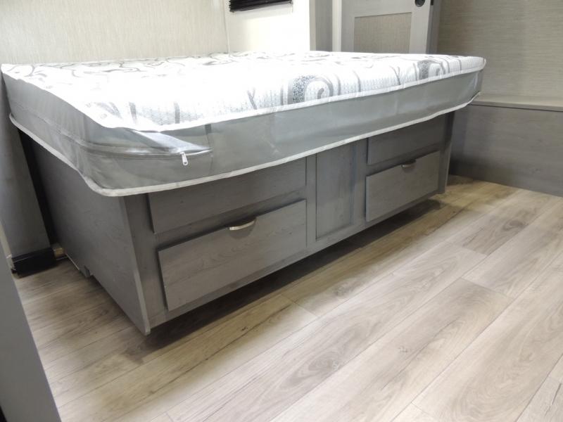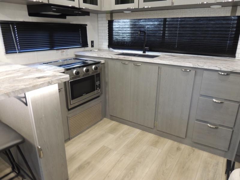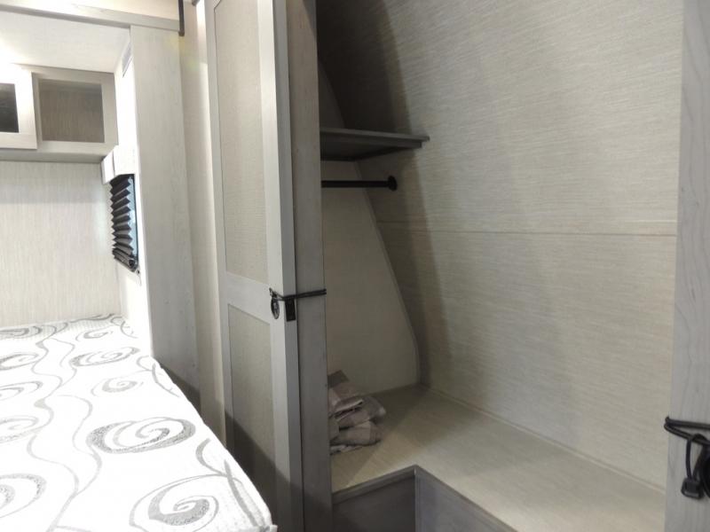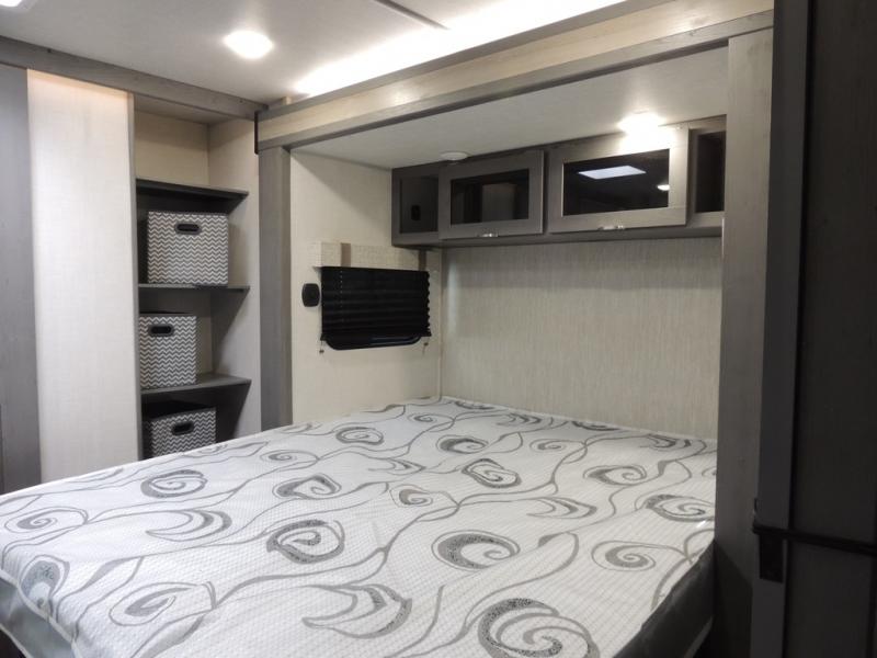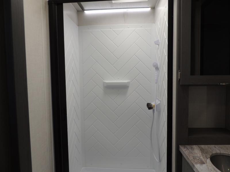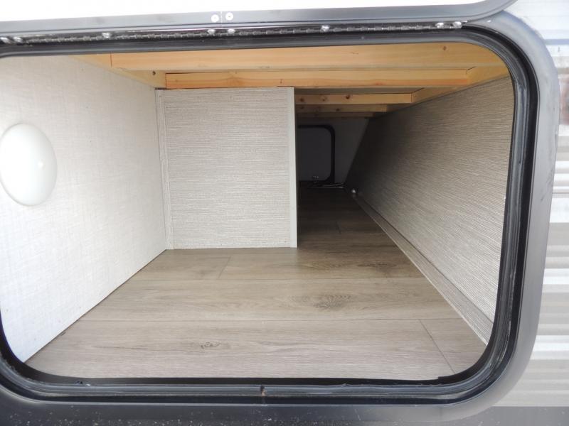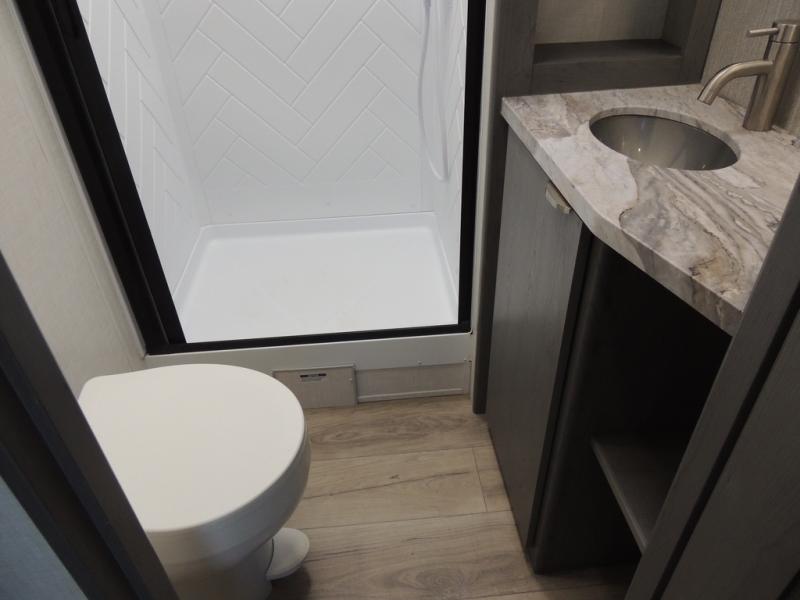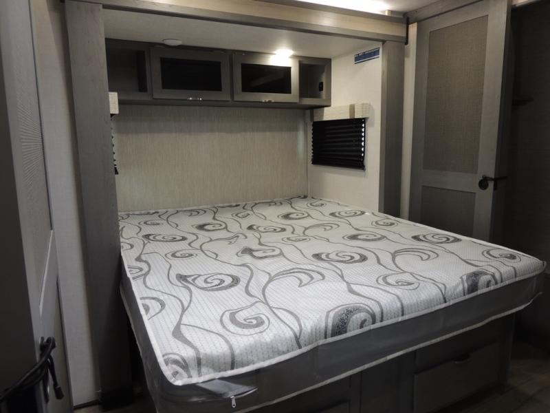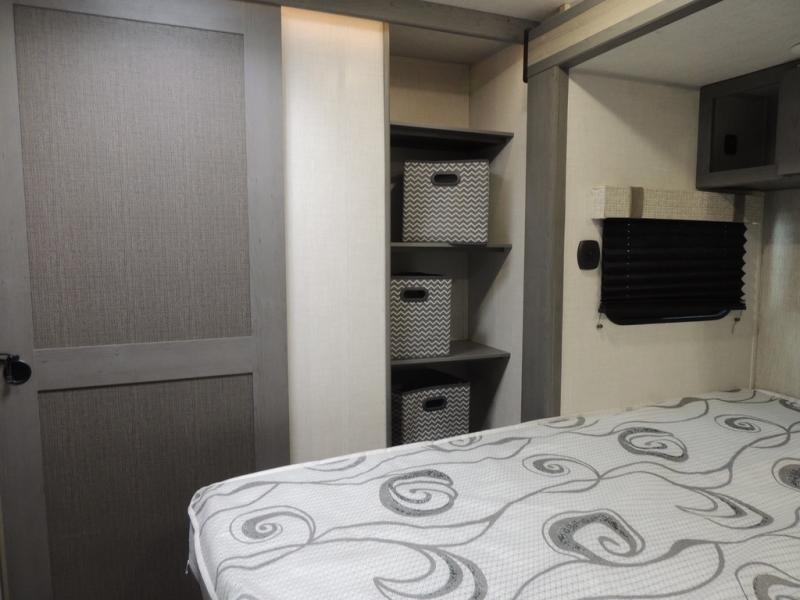This travel trailer provides ample space and amenities just like home! Once you step inside, you'll find a rear kitchen with tons of counter space and the living area with theater seating within a slide with direct TV viewing. There is a bar top with two stools where the little ones can enjoy their breakfast at, and a shoe rack where shoes won't get in the way. Head to the front of the unit to enjoy the private bedroom with a king bed slide out, a dresser with a TV hookup, plus a walk-in wardrobe, complete with washer and dryer prep! And don't overlook the exterior with its outdoor LP griddle and mini refrigerator, Solid Step entry steps, and quick drop stabilizer jacks for maximum stability!