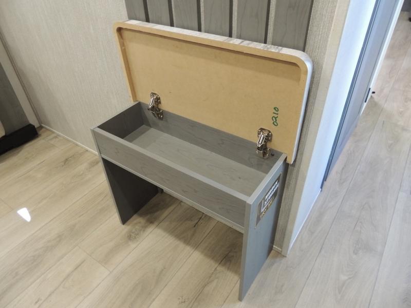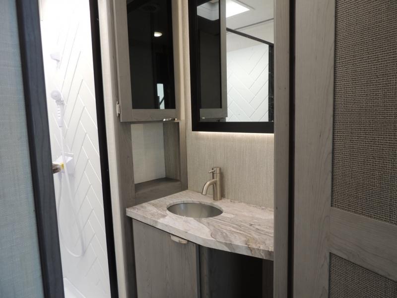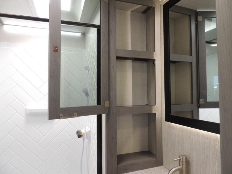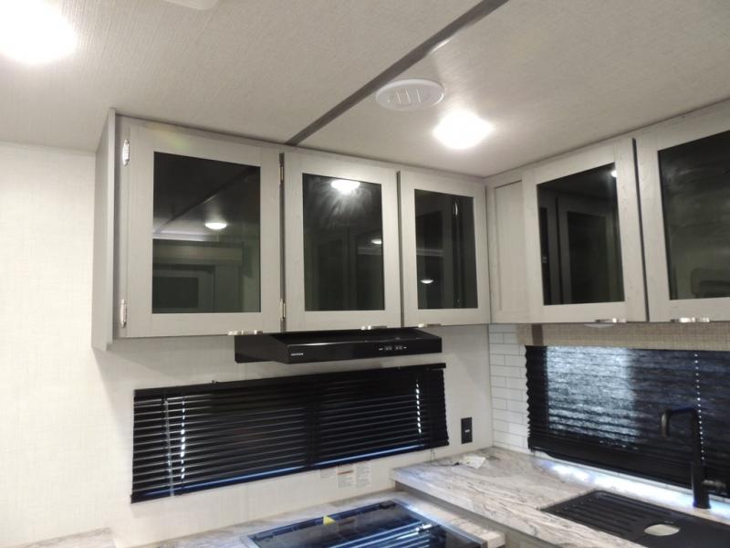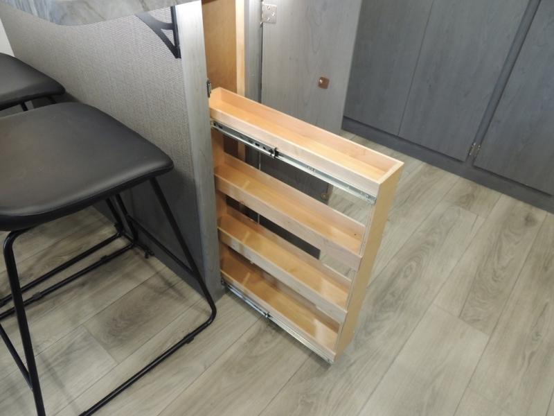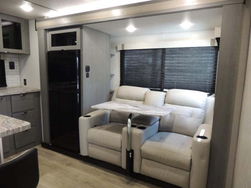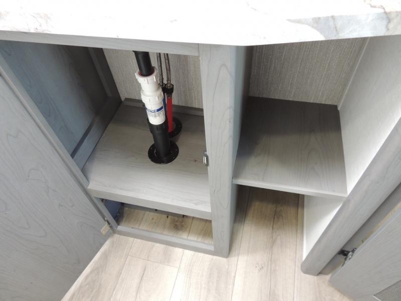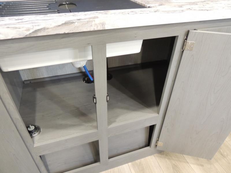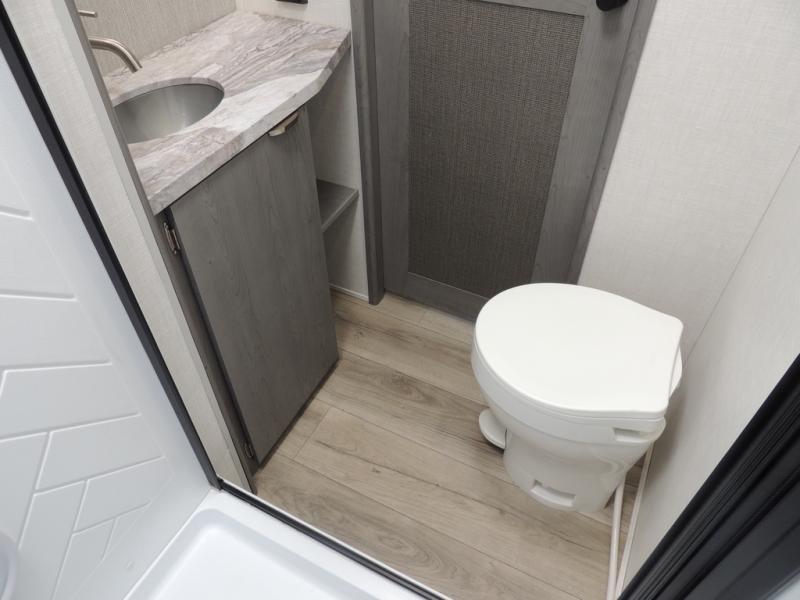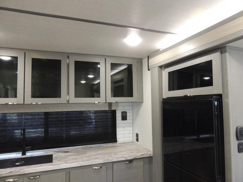 This travel trailer provides ample space and amenities just like home! Once you step inside, you'll find a rear kitchen with tons of counter space and the living area with theater seating within a slide with direct TV viewing. There is a bar top with two stools where the little ones can enjoy their breakfast at, and a shoe rack where shoes won't get in the way. Head to the front of the unit to enjoy the private bedroom with a king bed slide out, a dresser with a TV hookup, plus a walk-in wardrobe, complete with washer and dryer prep! And don't overlook the exterior with its outdoor LP griddle and mini refrigerator, Solid Step entry steps, and quick drop stabilizer jacks for maximum stability!