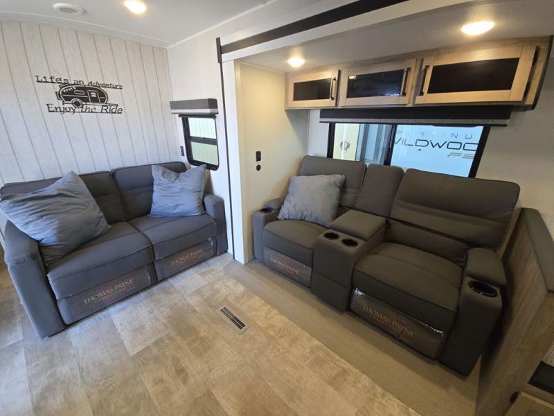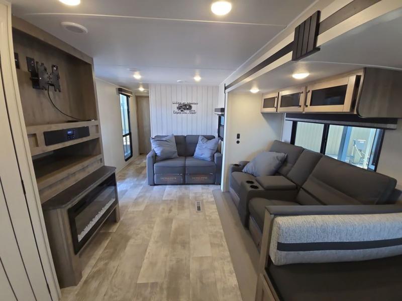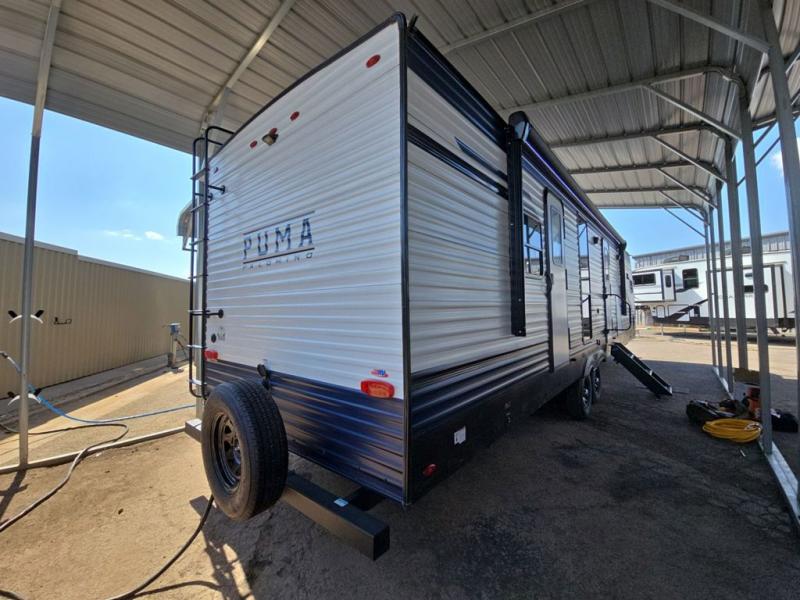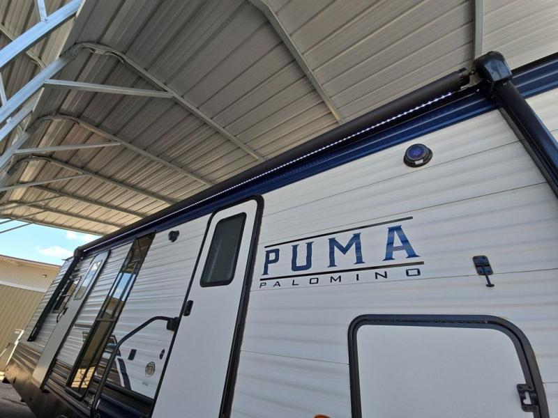 If you're looking for family-fun adventure then you need one of these Palomino Puma fifth wheels or travel trailers! They are built rugged, easy to tow, and jam packed with features. The Darco wrapped underbelly will protect your units vitals through every season and the AlphaPly roofing membrane covers it. They also have super lube axles and a powder coated frame. Their luxurious interiors feature a spice rack and built-in knife rack in the kitchen, USB charging ports to keep your electronics at 100%, and high density foam mattresses for a good night's rest. The required Advantage package comes with night roller shades for privacy at night, two outside speakers to crank up the tunes while you play cornhole, and an outside shower to keep the dirt outside where it belongs, plus so much more!