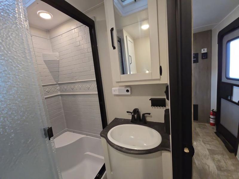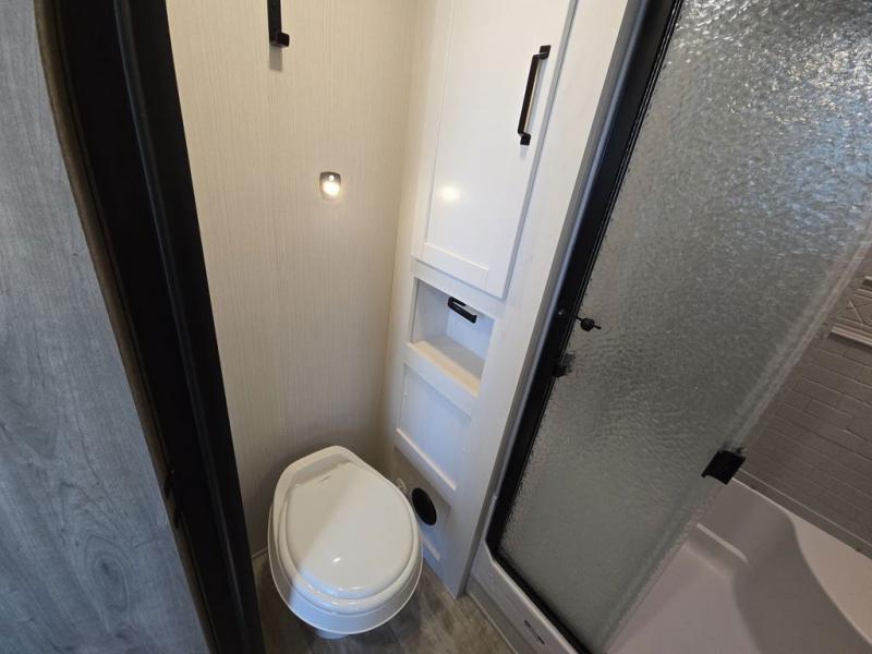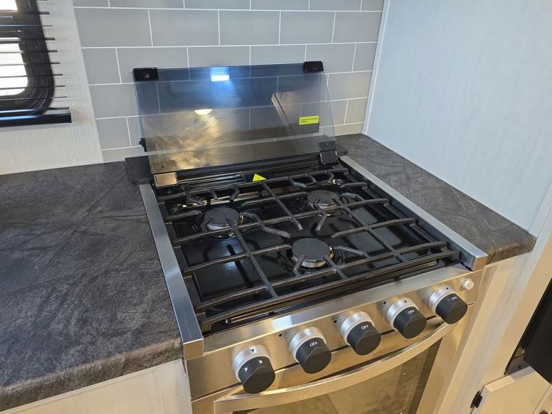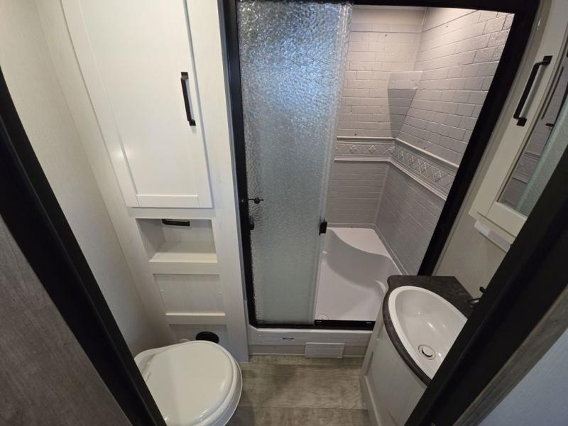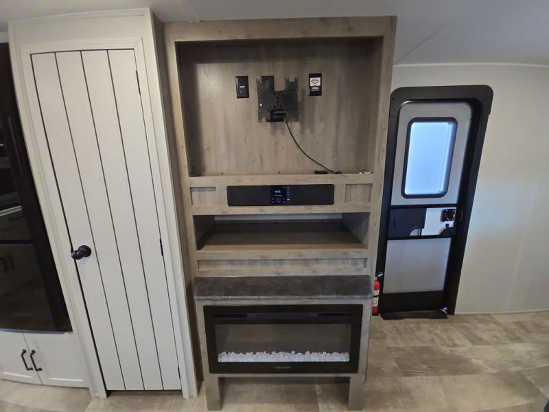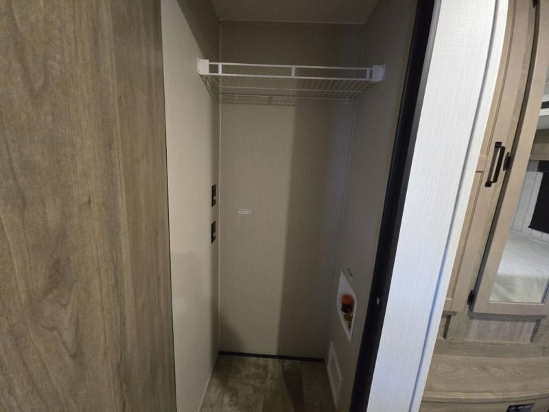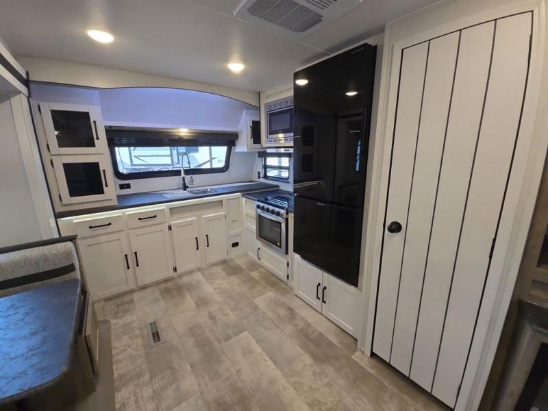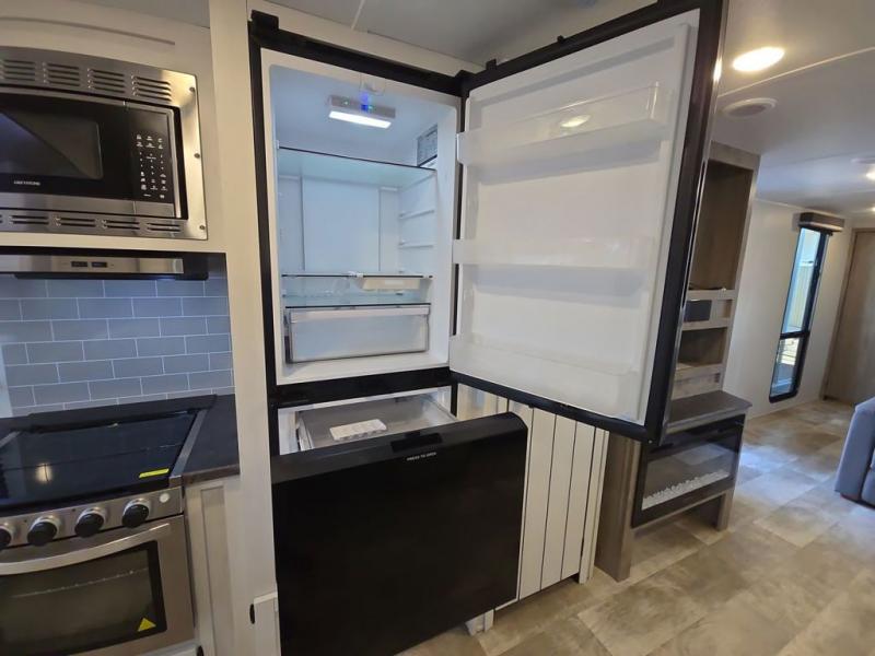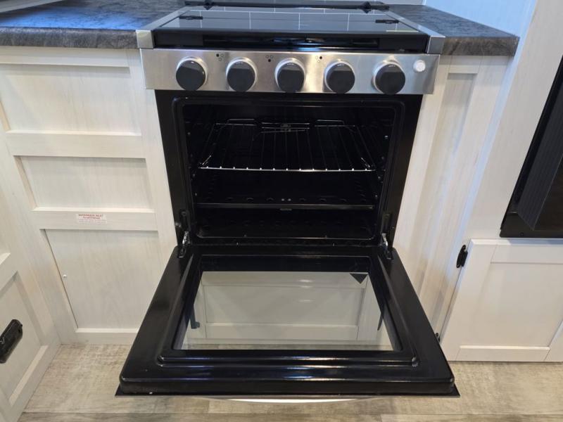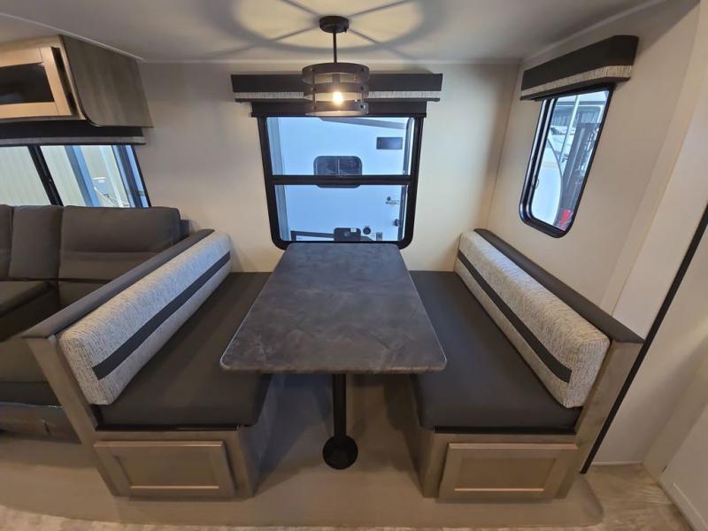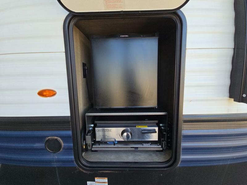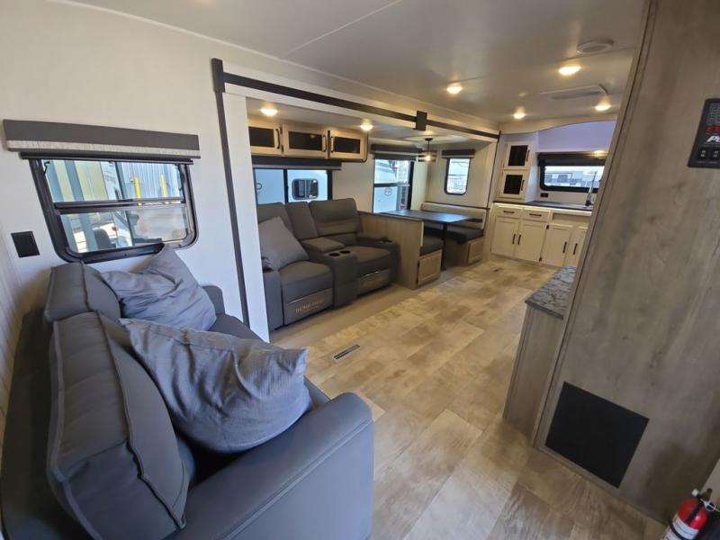 Experience a home away from home with this travel trailer! The front kitchen has everything you will need to prepare your best meals and you can enjoy them at the booth dinette. The rear private bedroom has a 72" x 80" king bed slide across from a dresser, a wardrobe, and a closet with washer and dryer prep. Freshen up in the full bathroom with the 34" x 34" radius shower and then enjoy a cup of coffee relaxing in one of the two recliners or on the sofa! Choose the optional outside micro kitchen with a griddle for even more convenience!