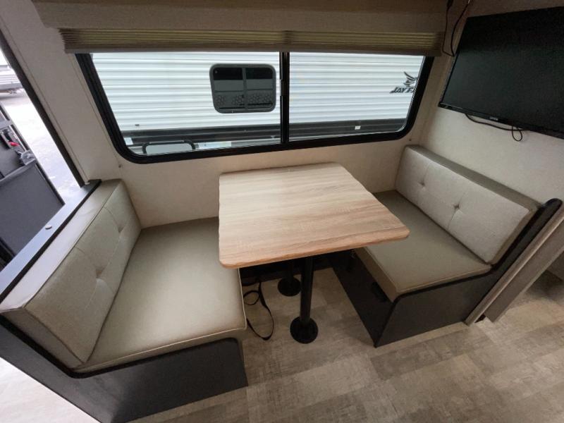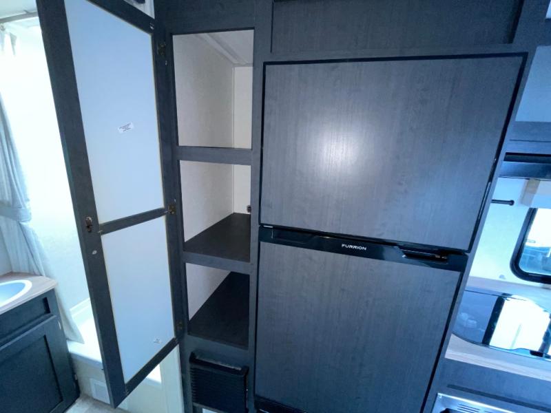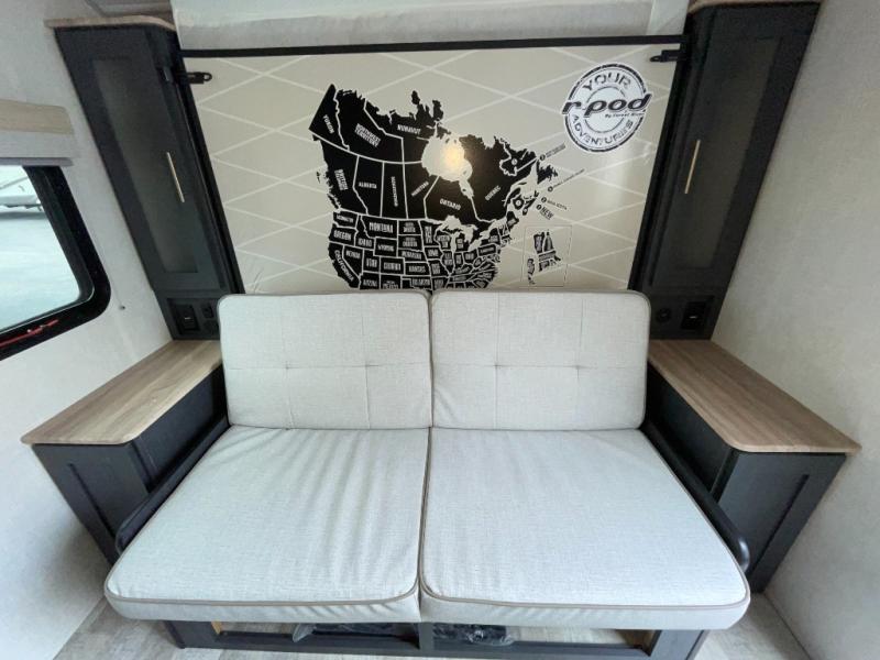 You're going to love all of the conveniences and versatility of this R Pod travel trailer! The front Murphy bed can fold away to reveal a sofa which gives you a comfortable place to sit during the day and to sleep at night too. The rear full bath features everything you will need to get squeaky clean each morning, as well as a large wardrobe for you to store your linens. After you have whipped up your best meal with the two-burner cooktop or convection microwave, you can head to the 30" x 75" booth dinette and enjoy eating it there comfortably. There is plenty of storage space inside, but if you need more space, then you can use the exterior pass-through storage!