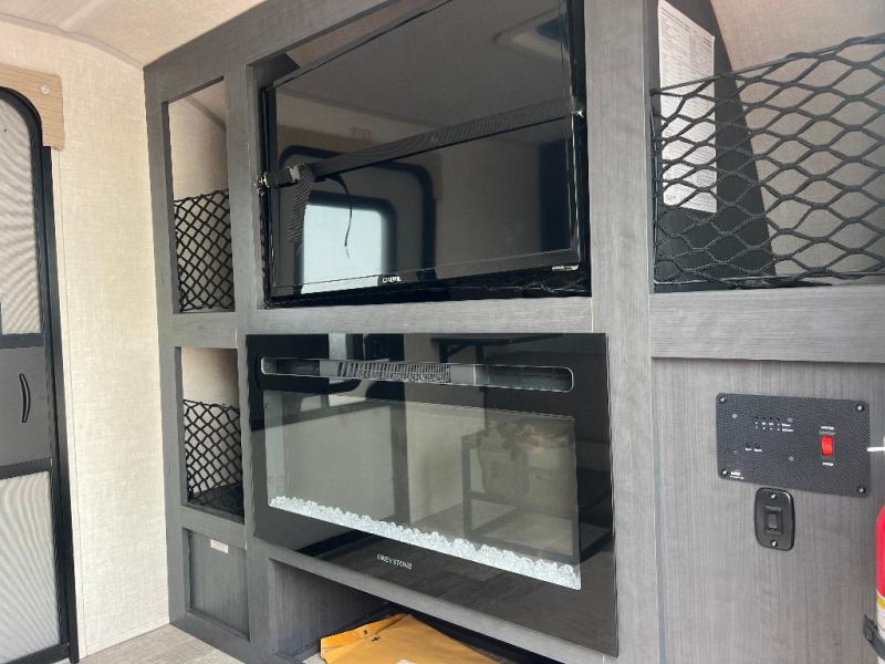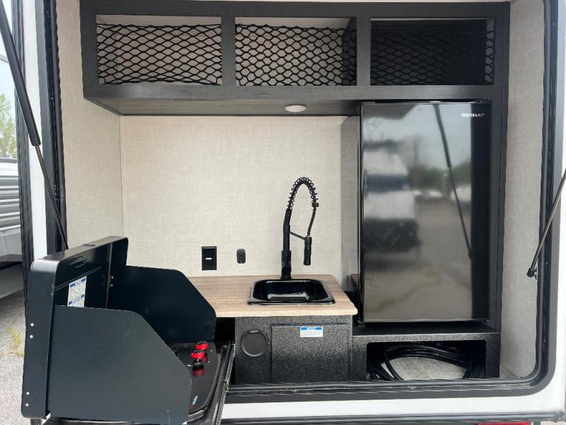 Enjoy lightweight towing and comfort with this dual entry travel trailer! Once you arrive at the campsite, you can grab your hiking boots from the storage and head out to find a trail or two. The queen-sized bed/sofa combo will provide a place to relax and sleep each night, and there is even a fireplace here to make this area more cozy. In the morning you can make breakfast at the rear outside kitchen that includes a refrigerator, a two burner cooktop, and a sink.