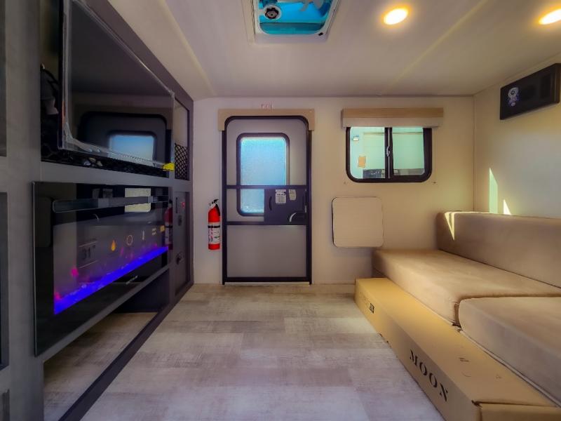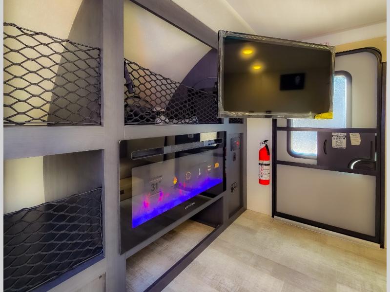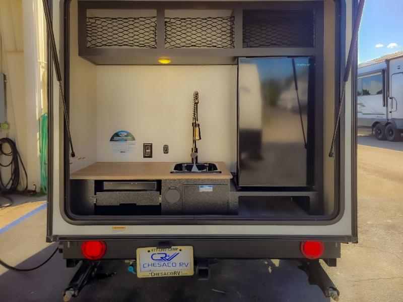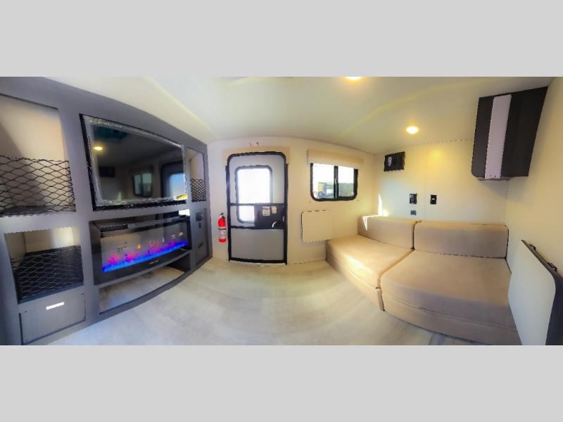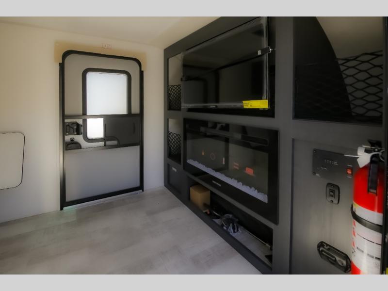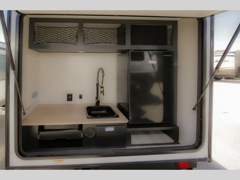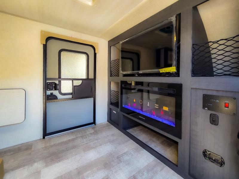 Enjoy lightweight towing and comfort with this dual entry travel trailer! Once you arrive at the campsite, you can grab your hiking boots from the storage and head out to find a trail or two. The queen-sized bed/sofa combo will provide a place to relax and sleep each night, and there is even a fireplace here to make this area more cozy. In the morning you can make breakfast at the rear outside kitchen that includes a refrigerator, a two burner cooktop, and a sink.