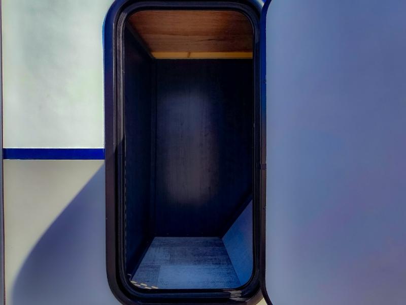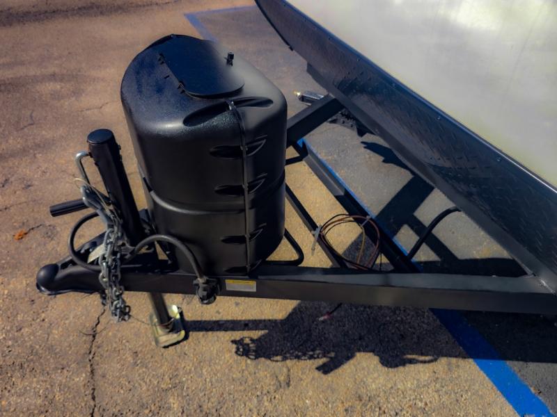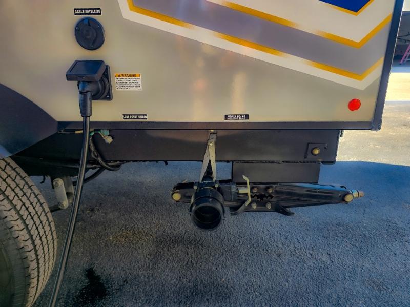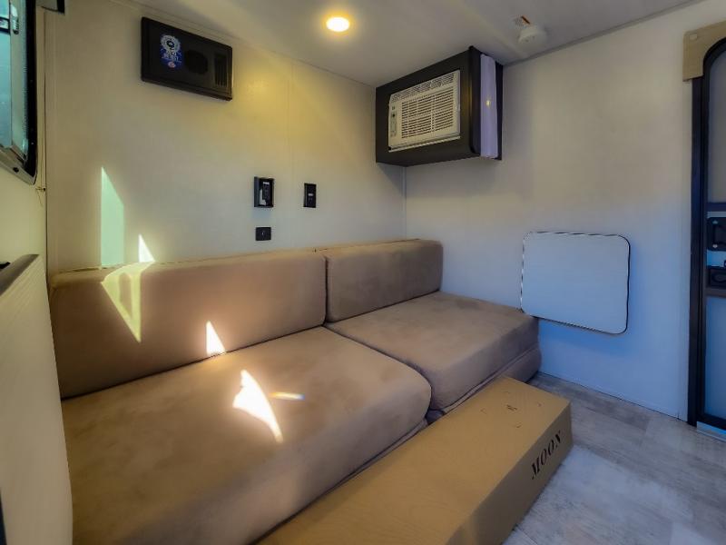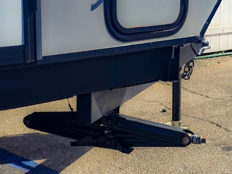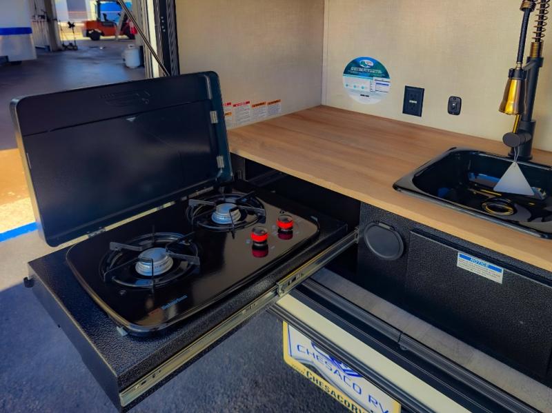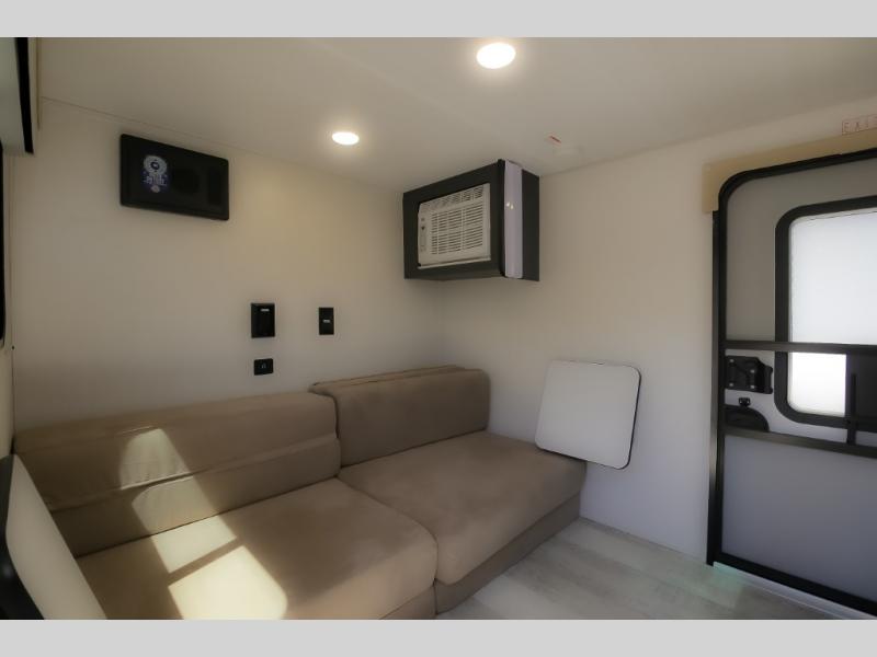 Enjoy lightweight towing and comfort with this dual entry travel trailer! Once you arrive at the campsite, you can grab your hiking boots from the storage and head out to find a trail or two. The queen-sized bed/sofa combo will provide a place to relax and sleep each night, and there is even a fireplace here to make this area more cozy. In the morning you can make breakfast at the rear outside kitchen that includes a refrigerator, a two burner cooktop, and a sink.