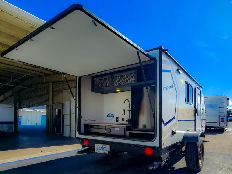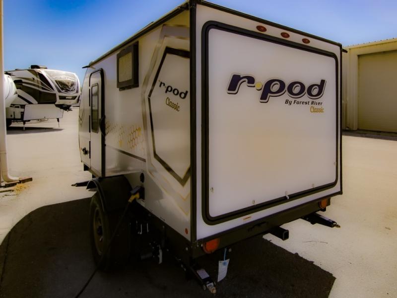 With any R Pod Classic travel trailer by Forest River, you will enjoy at home-comforts and lightweight towing. There are magnetic door catches that will easily keep the door open when you're packing hiking gear or bringing in your luggage. Each model includes 30 Amp service with a detachable power cord, a 20 lb. propane tank with a cover, and a high efficiency roof-mounted air conditioner that will keep you cool during the summer camping months. Inside, you'll find a two burner cooktop, a convection microwave, and new Cosmetic Graphite interior for a modern look you will love.