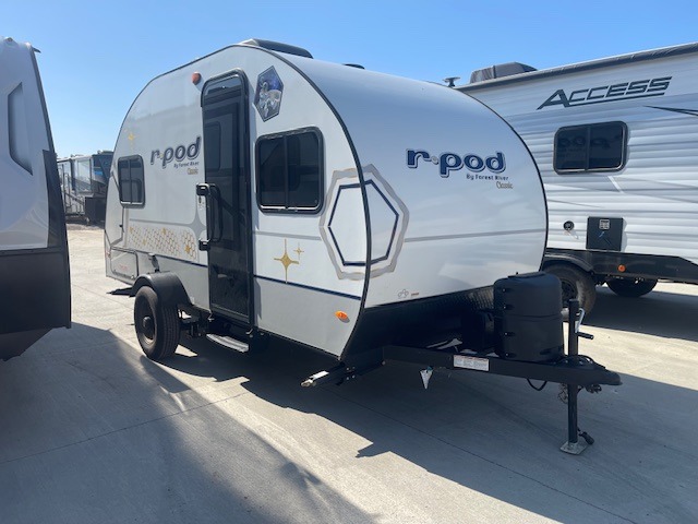 With any R Pod Classic travel trailer by Forest River, you will enjoy at home-comforts and lightweight towing. There are magnetic door catches that will easily keep the door open when you're packing hiking gear or bringing in your luggage. Each model includes 30 Amp service with a detachable power cord, a 20 lb. propane tank with a cover, and a high efficiency roof-mounted air conditioner that will keep you cool during the summer camping months. Inside, you'll find a two burner recessed cooktop with a flush mount glass cover, a convection microwave, and new Cosmetic Graphite interior for a modern look you will love.