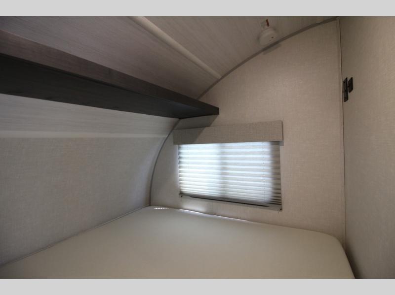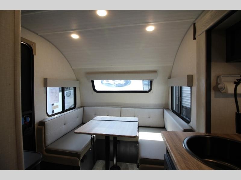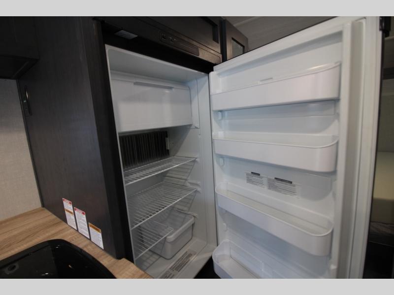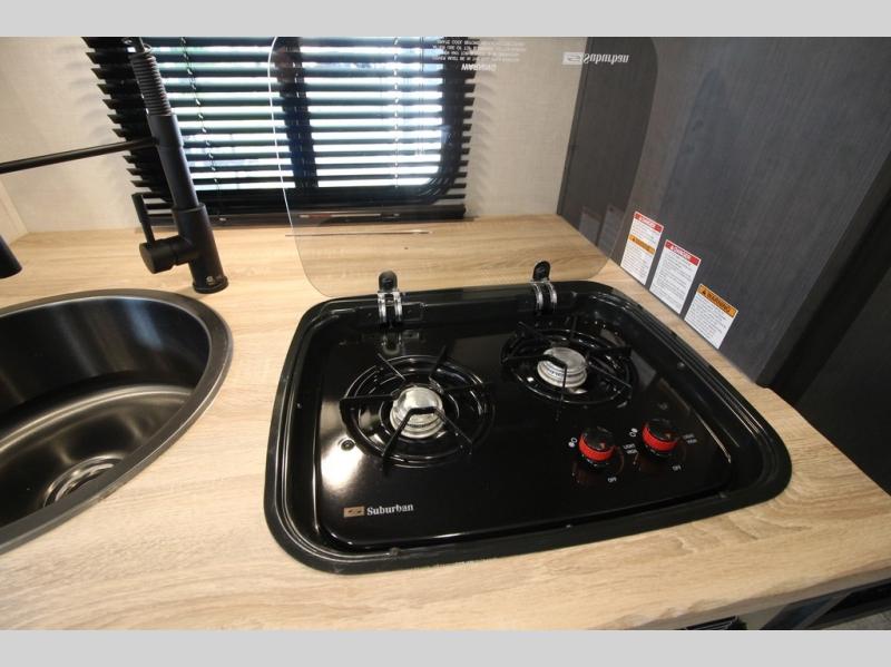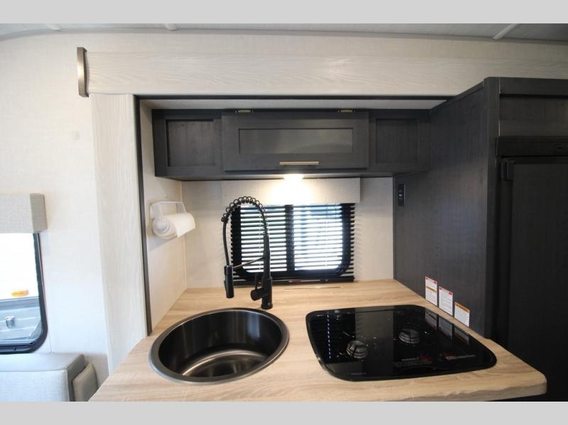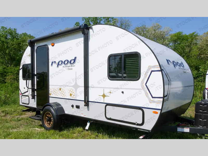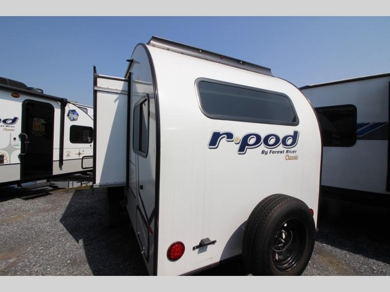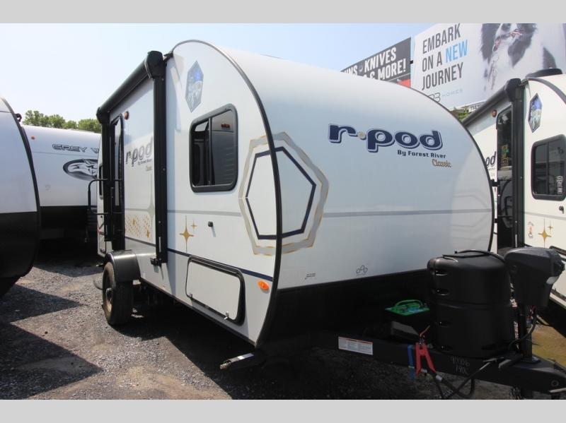 With any R Pod Classic travel trailer by Forest River, you will enjoy at home-comforts and lightweight towing. There are magnetic door catches that will easily keep the door open when you're packing hiking gear or bringing in your luggage. Each model includes 30 Amp service with a detachable power cord, a 20 lb. propane tank with a cover, and a high efficiency roof-mounted air conditioner that will keep you cool during the summer camping months. Inside, you'll find a two burner recessed cooktop with a flush mount glass cover, a convection microwave, and new Cosmetic Graphite interior for a modern look you will love.