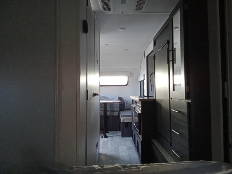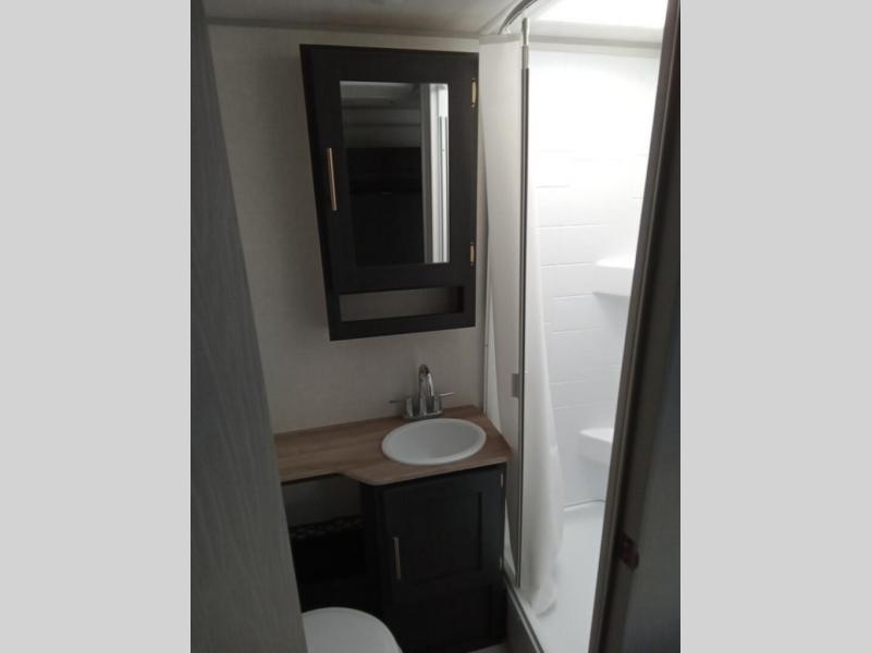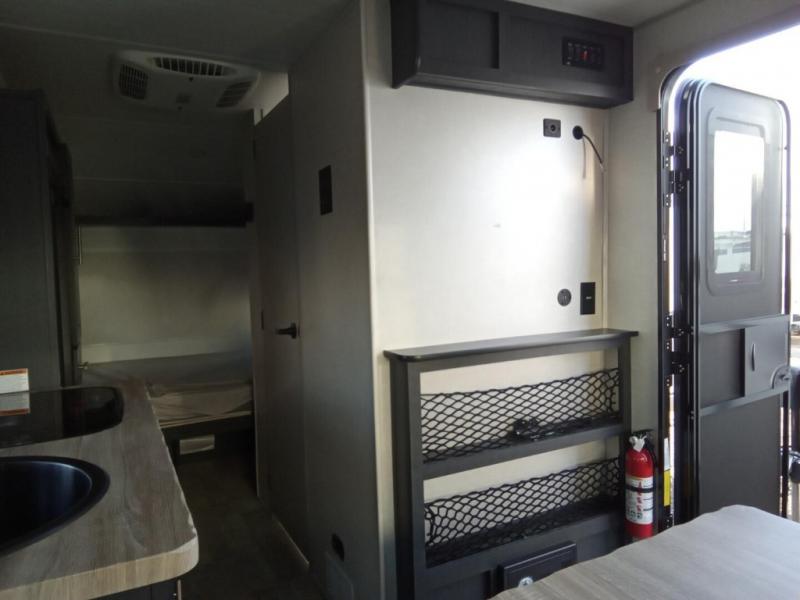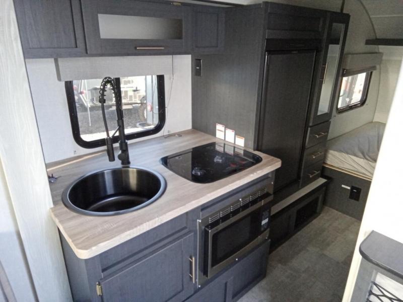 With any R Pod Classic travel trailer by Forest River, you will enjoy at home-comforts and lightweight towing. There are magnetic door catches that will easily keep the door open when you're packing hiking gear or bringing in your luggage. Each model includes 30 Amp service with a detachable power cord, a 20 lb. propane tank with a cover, and a high efficiency roof-mounted air conditioner that will keep you cool during the summer camping months. Inside, you'll find a two burner recessed cooktop with a flush mount glass cover, a convection microwave, and new Cosmetic Graphite interior for a modern look you will love.