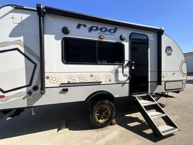 With any R Pod travel trailer by Forest River, you will find affordable luxury and lightweight towing! The Azdel sidewall construction and aluminum framing provide a durable RV made to last, and you'll love the new premium exterior graphics! There is also a tire pressure monitoring system outside, along with a friction hinge entrance door, a power tongue jack, and an exclusive aluminum wheel upgrade. Head inside to enjoy butcher block countertops, multipurpose vinyl furniture, a Showermiser water system, and new Cosmic Graphite decor. The large solar panel will provide off-gird capabilities, plus there is a 2,000W inverter and 30A charge controller for added convenience!