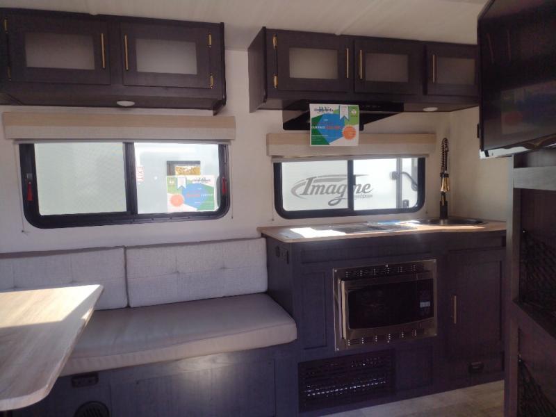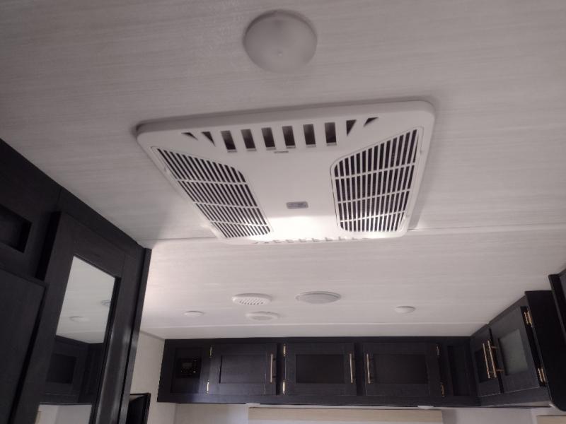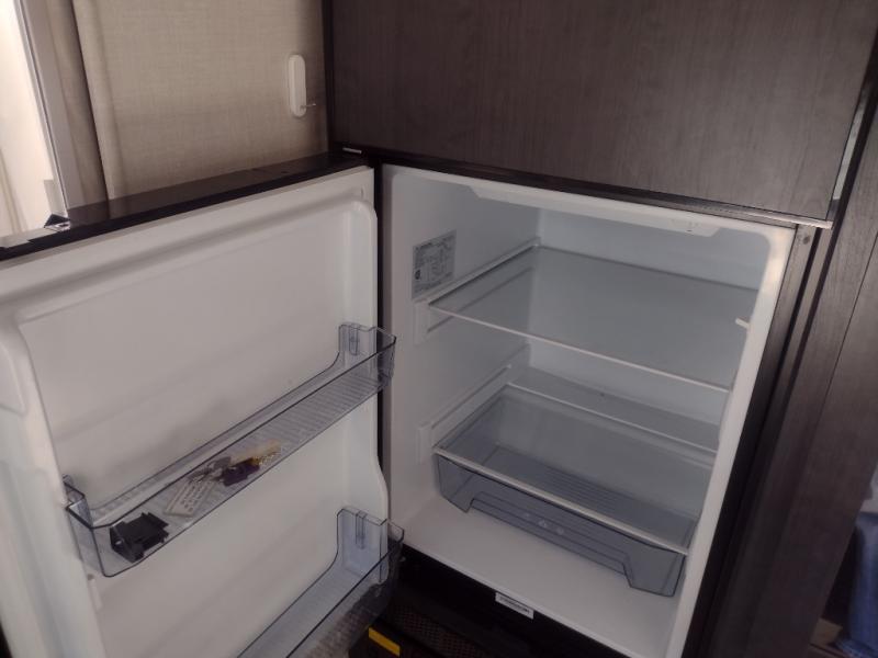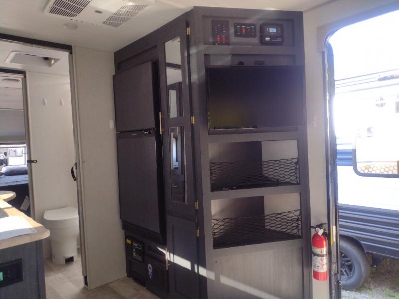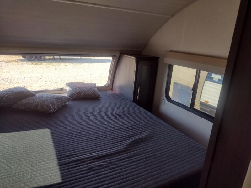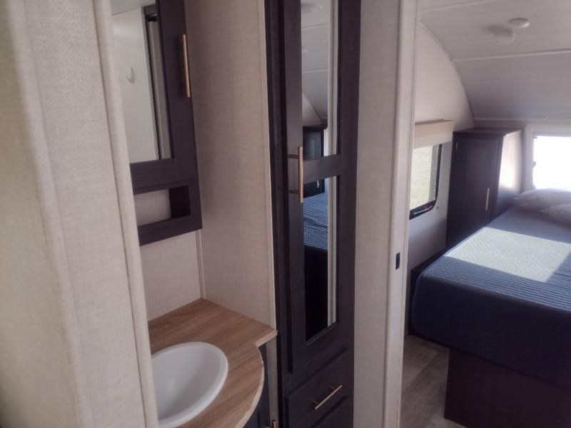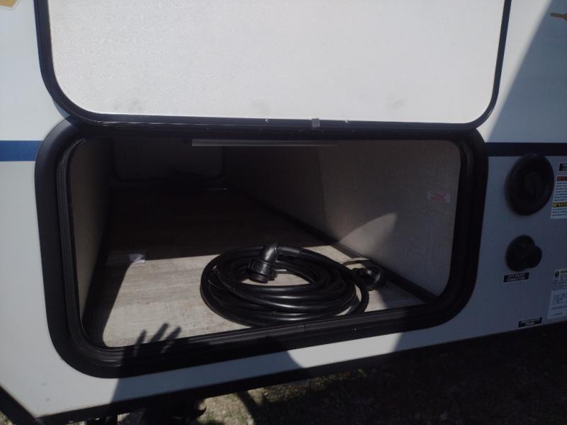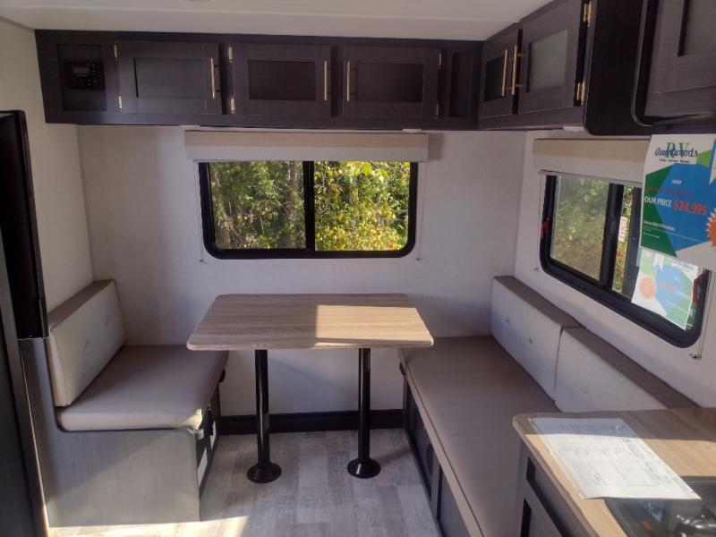 This R Pod travel trailer has quite a few features that will attract your attention! First of all, there booth dinette in front of the LED TV so that you can view your movies in comfort. The walk-through bath gives you an entrance door on both sides, and it also allows you to directly enter the bathroom from the front bedroom. Underneath the RV queen bed in the bedroom, there is under-bed storage so you can keep some sweaters and boots hidden away without taking up any walking space in the bedroom.