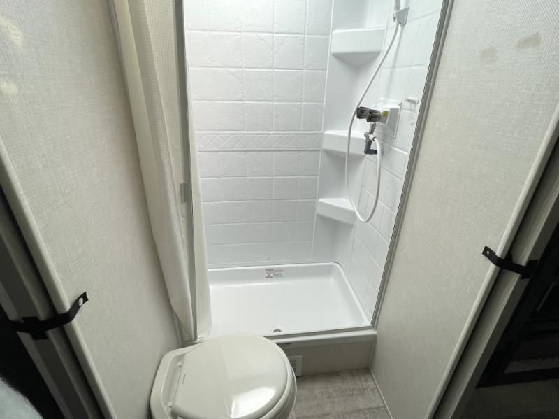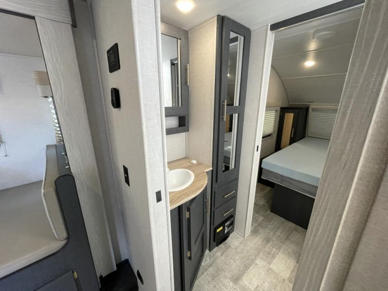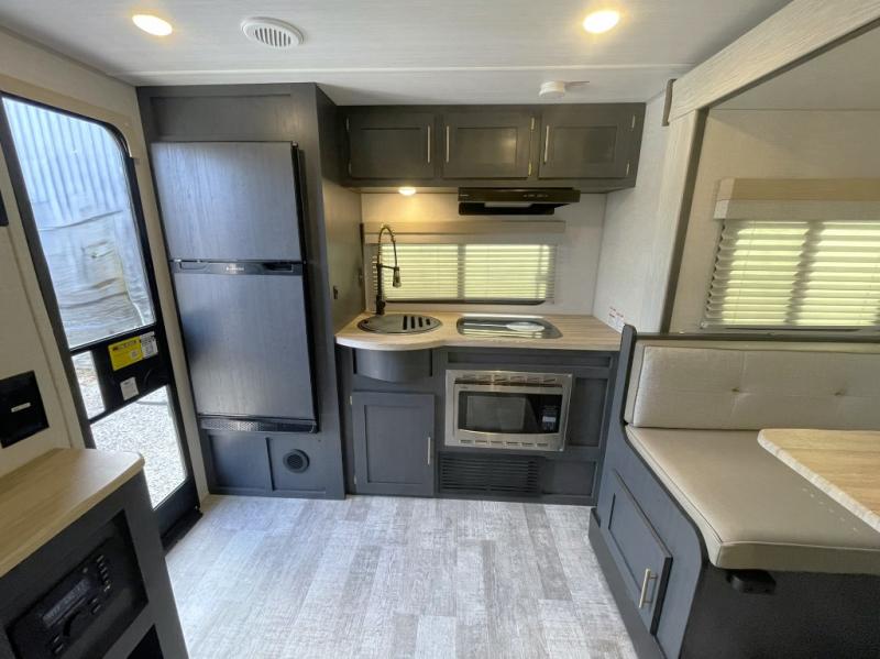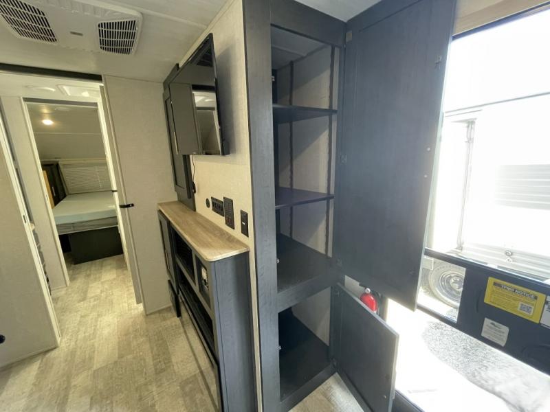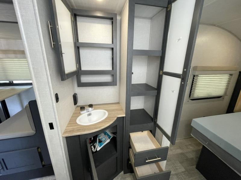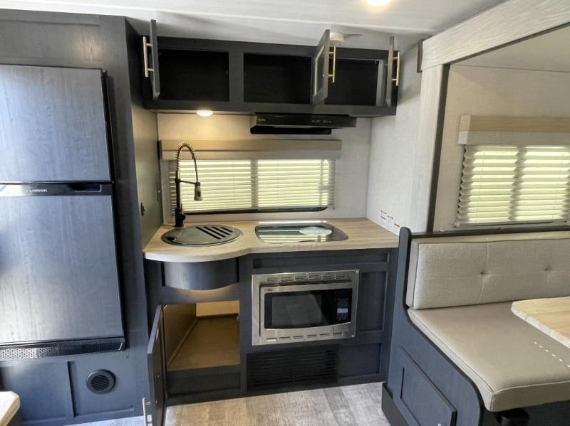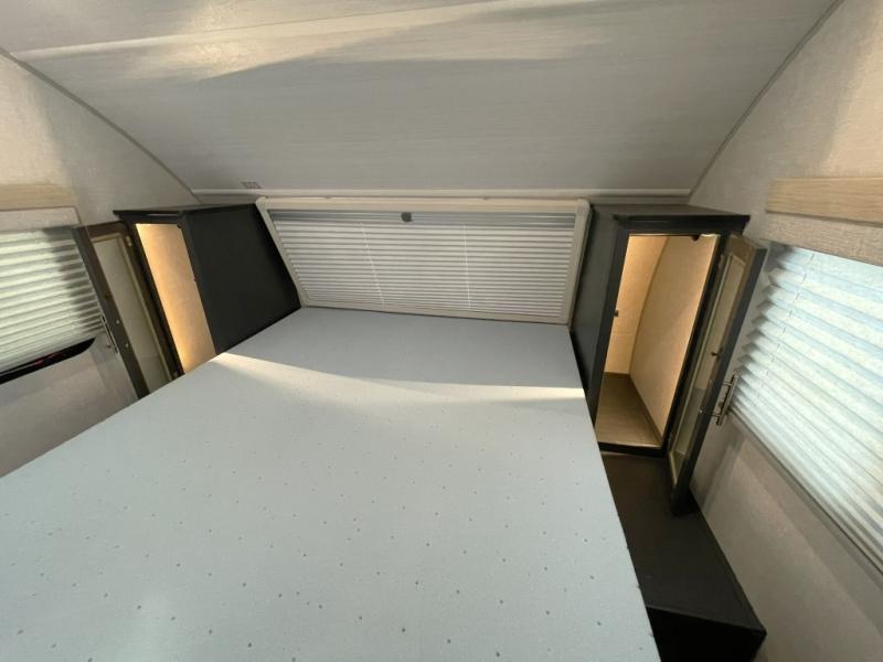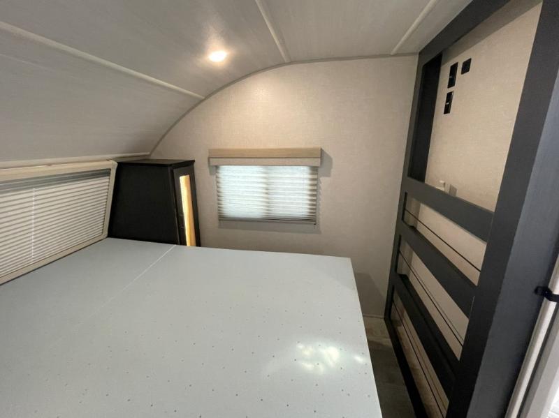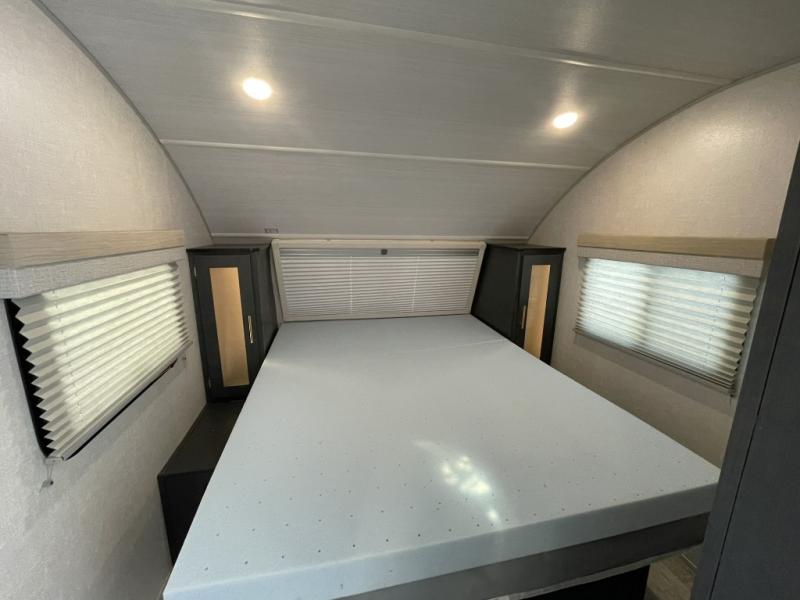 The RP-202 is packed with features that make it a standout in the world of travel trailers. Step inside and you’ll immediately notice the spacious walk-through bathroom, designed for maximum comfort and privacy. The private bedroom features a walk-around RV queen bed, flanked by dual wardrobes, so you never have to compromise on clothing or gear storage.
