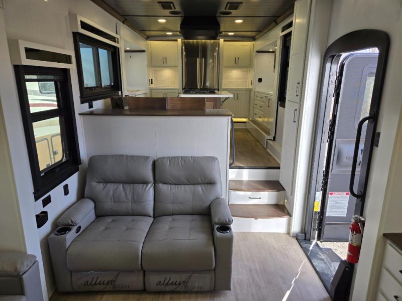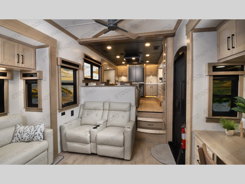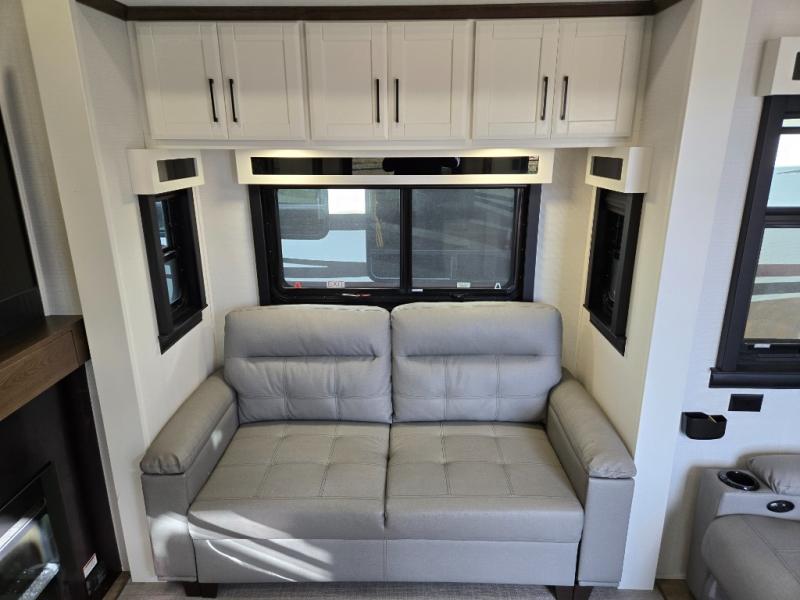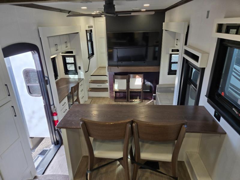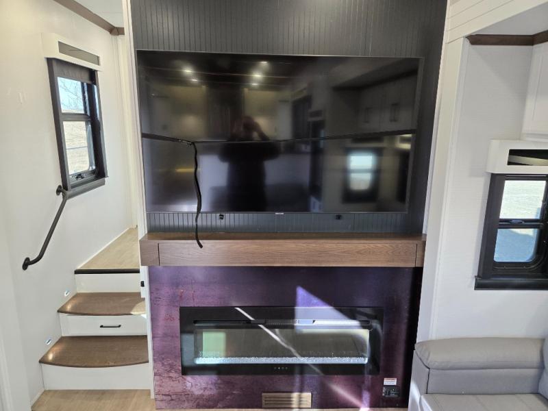 Load up and head out with this RiverStone toy hauler! You will have a great time enjoying the fresh outdoor air while you also enjoy the shade that comes from the 11' 6" and 18' electric awnings with LED lights. There is an exterior TV that you can watch if you don't have any other games you want to play, and you can access the below-floor garage by using the Zero Gravity ramp door in the back. If you don't need the desk to get some work done, you can switch it out for the optional E-Z glide sofa bed, and you already have a standard E-Z glide sofa bed sitting across from the desk. The fireplace keeps the living area cozy, and the dinette with two free-standing chairs in the kitchen overlooks the living area to give you another place to sit down and socialize.