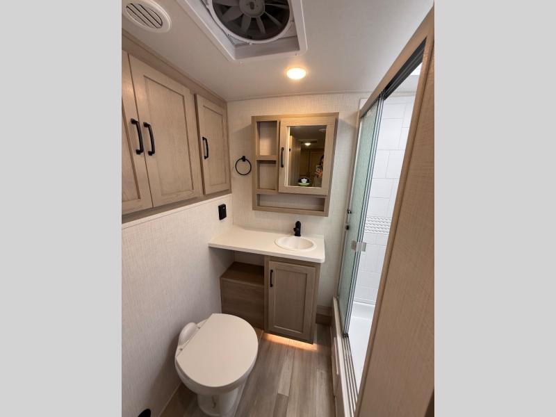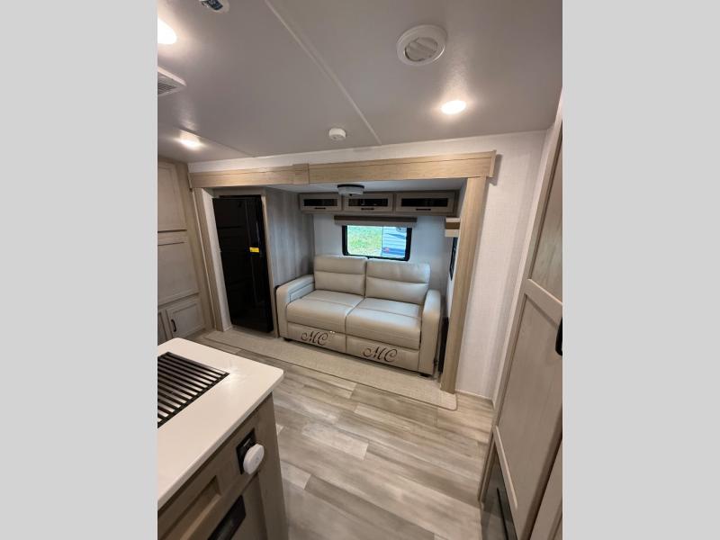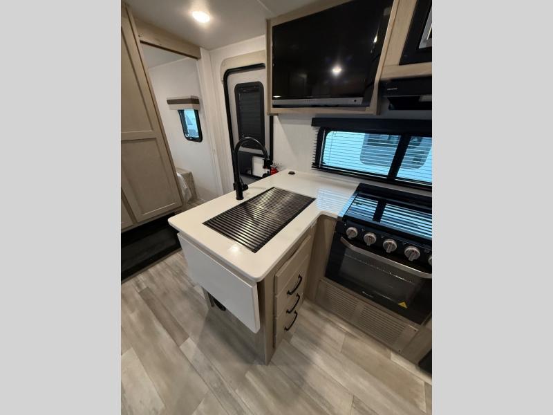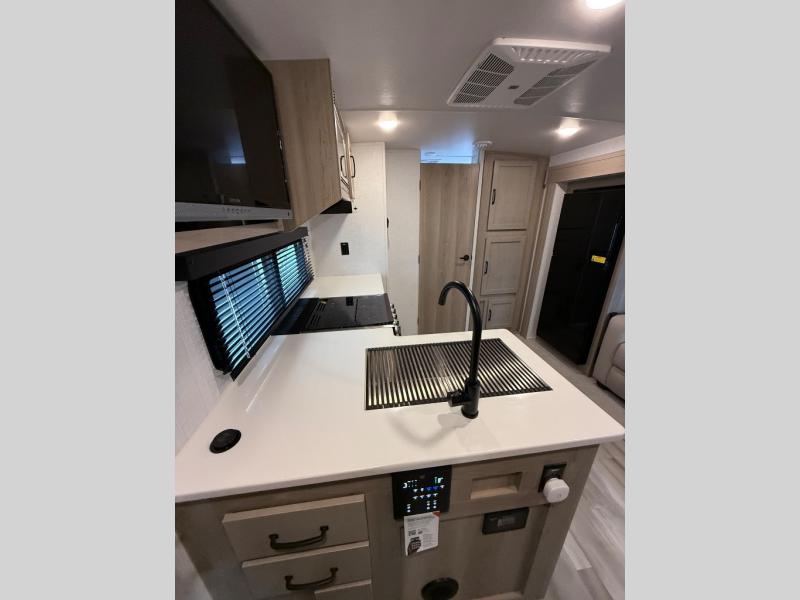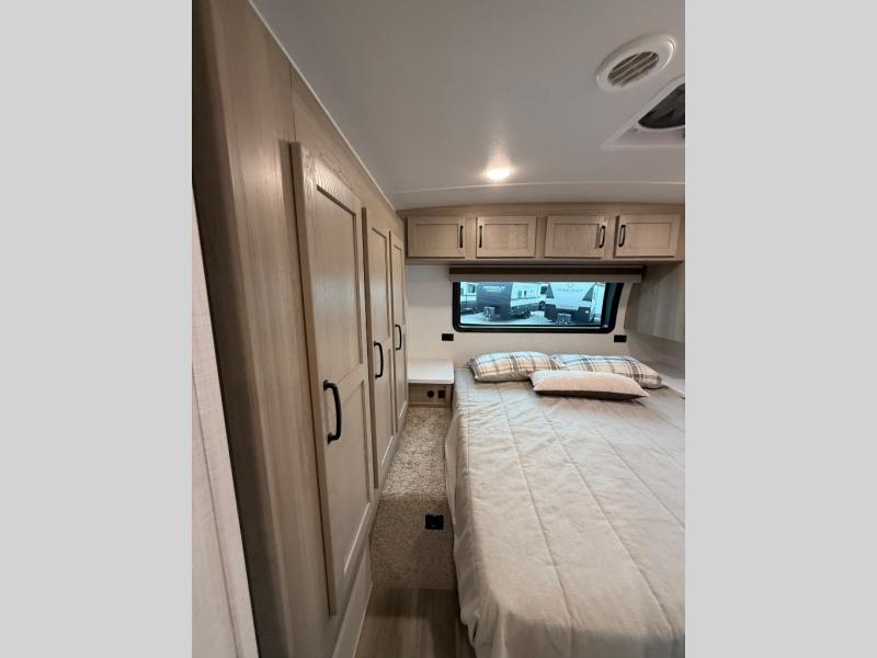 This is the perfect travel trailer for two people looking for comfortable camping trips! You will have your own RV queen bed to sleep on in the front private bedroom, and an optional TV can be added if you enjoy the morning news in bed. Breakfast can be made on the three burner cooktop, or head outdoors to cook on the outside kitchen. The theater seating with a table will provide a place to relax and dine together, and the spacious full rear bath will allow you to clean up before you head out for the day. This model includes plenty of storage space, including two pantries, a wardrobe slide out in the bedroom, plus a drop-frame pass-through storage for larger camp gear!