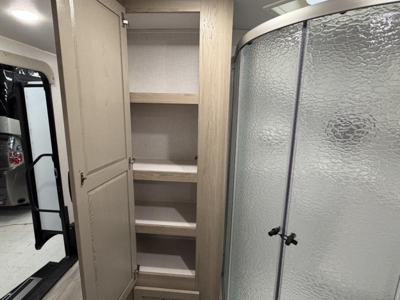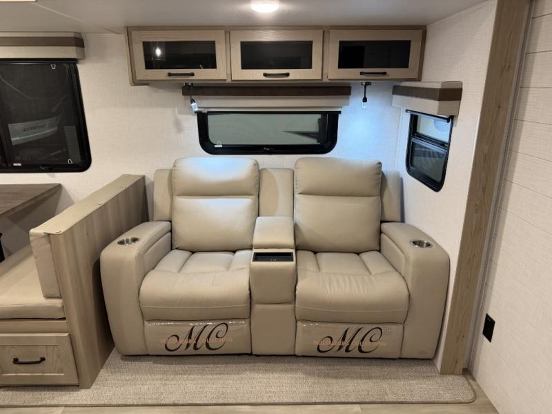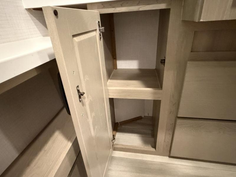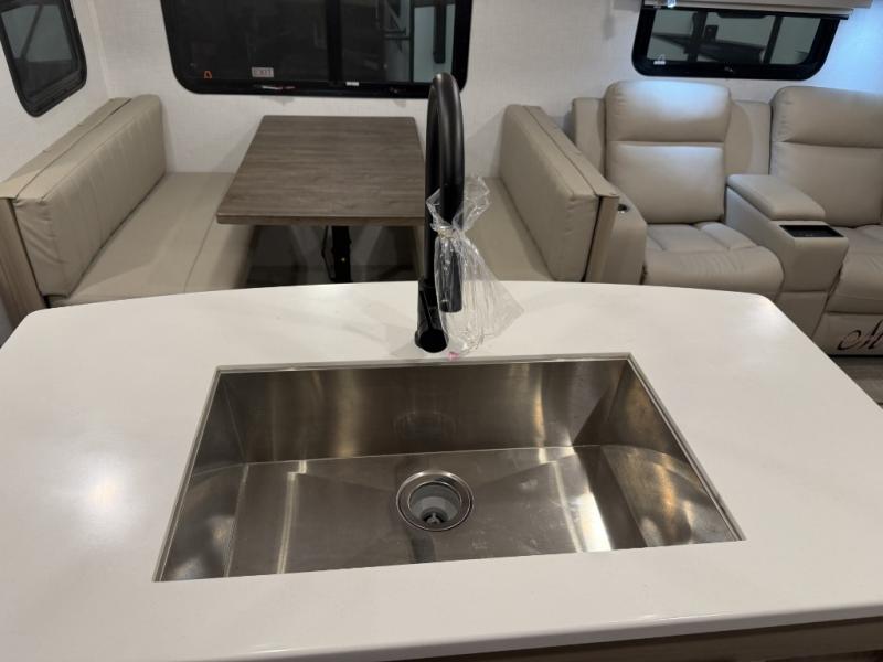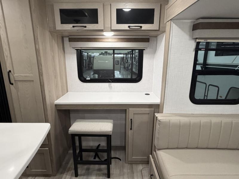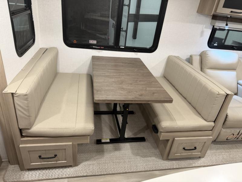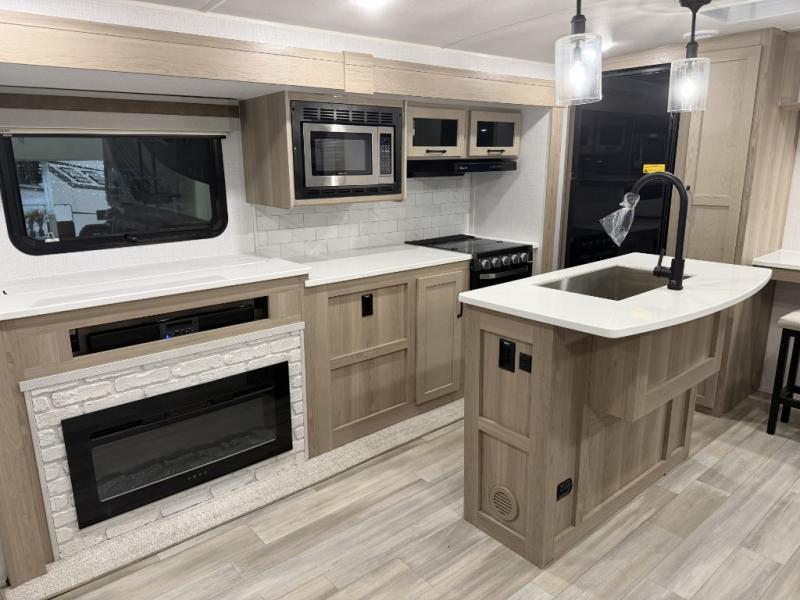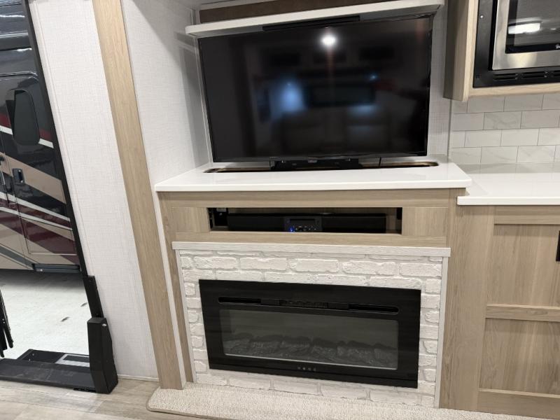 Hike the trails, fish the lake, and relax indoors after the cook whips up a meal with full amenities in the rear kitchen. Here, you'll find a kitchen island, a large pantry, and a desk area that can used to get some work done. The 44" booth dinette allows you to eat your meals together and watch the Smart TV with a fireplace below, and this can be optioned out for a hide-a-bed sofa. The theater seating is another comfortable place to relax, and the double entry bathroom is convenient especially at night. This model also includes an outside kitchen, two power awnings, plus Solid Step entry steps!