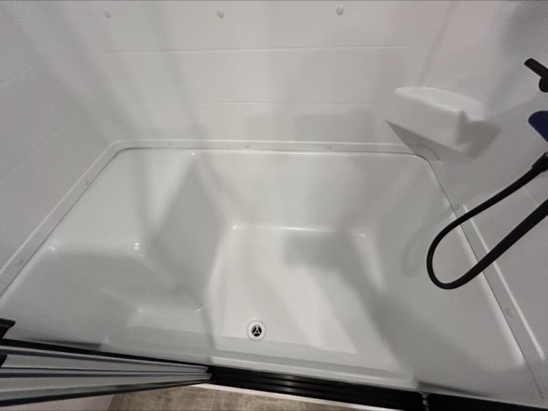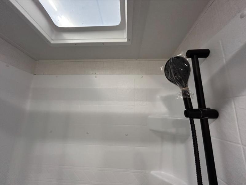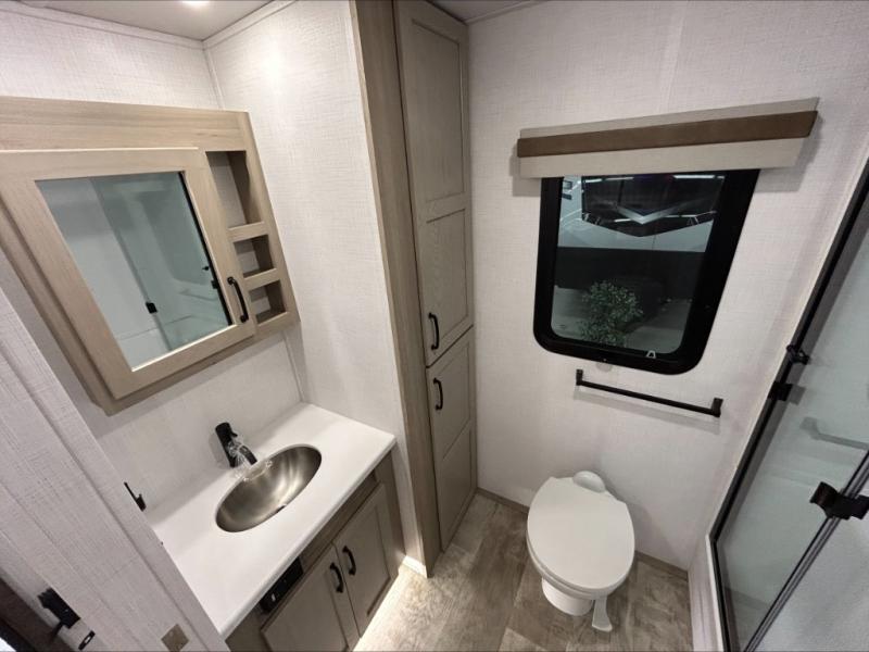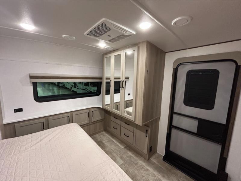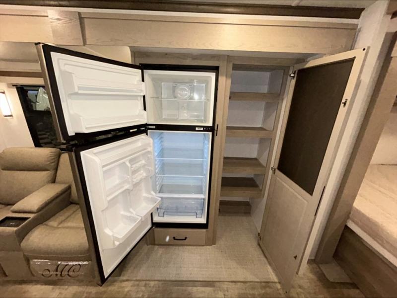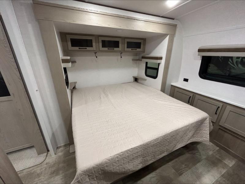 Head to the lake in this cozy couple's trailer with at-home comforts. The large front bedroom includes its own exterior entry door for convenience, plus there is a wardrobe for your clothes and washer and dryer prep. The large slide out in the main living area will allow you to relax in comfort on the theatre seat, and the entertainment center with a Smart TV will allow you to watch your favorite movies at night. There is a counter with stools here where you can dine at each day, and the pantry provides a place to store the snacks. This model also includes a full rear bath for added privacy, and the shower with a seat adds luxury!