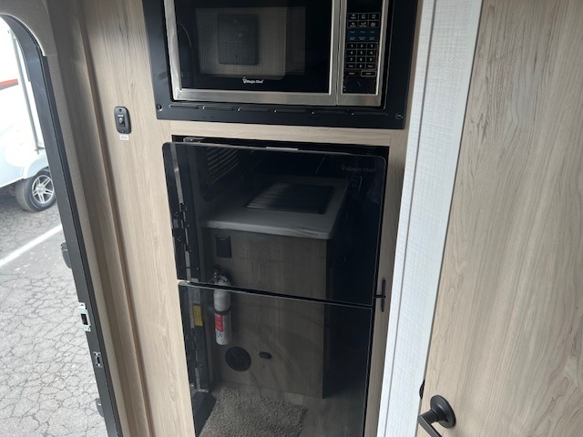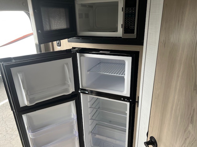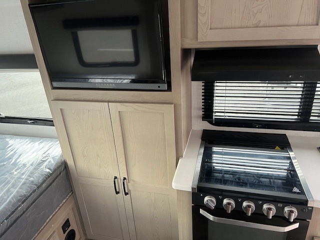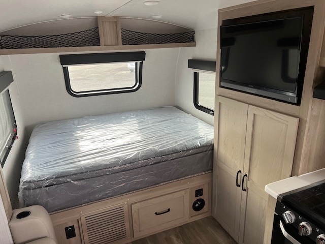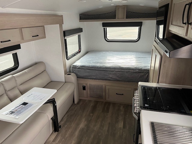 This is the perfect couple's trailer, so sneak away for a weekend in the woods. There is a 72" sofa with cupholders with a table that will be perfect for meals times and relaxing. This model includes a 32" 12V TV to keep you busy on those rainy days, and the queen bed will provide a great night's rest. This model also includes an outside griddle and an 11' power awning so you can enjoy those nice days outdoors!