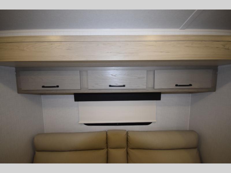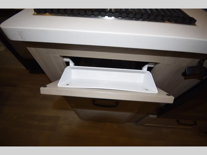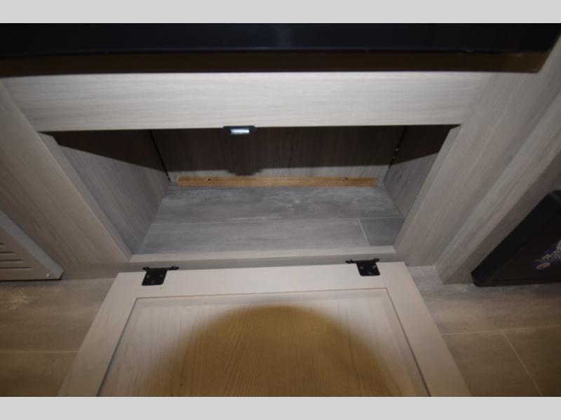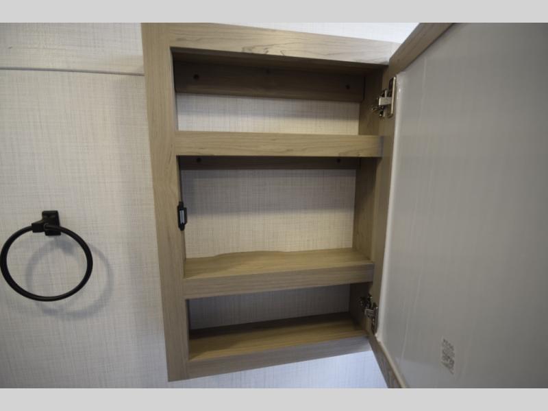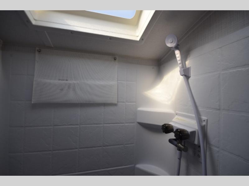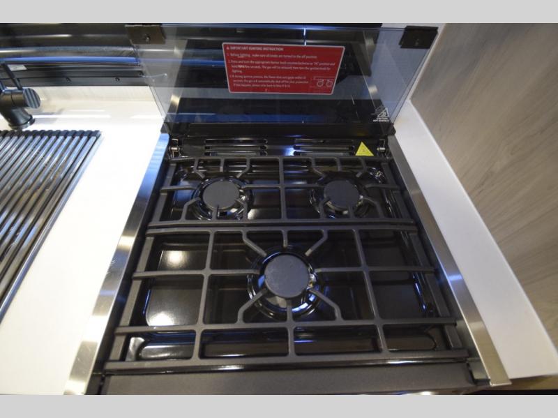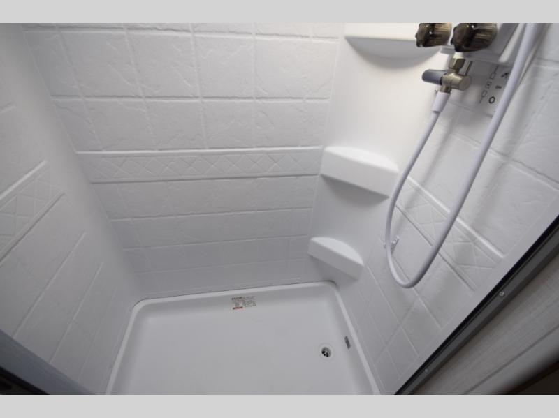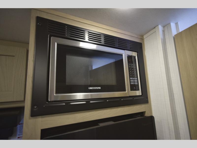 Need to freshen up? The full rear bath includes a roomy shower and a linen closet for extra towels and toiletries. Mealtime is easy with a three-burner cooktop, microwave oven, and an outdoor griddle so you can sizzle breakfast with the sunrise or grill burgers after a long hike.