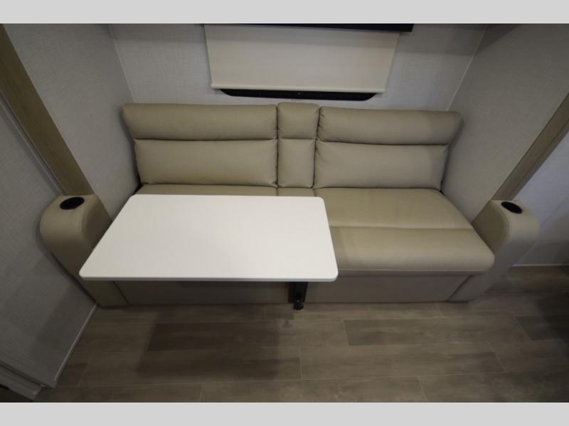 Step inside to a smart, space-saving layout that feels anything but cramped. The front bedroom features a walk-around full-size bed, perfect for stretching out after a day of exploration. Kick back and unwind on the 72" sofa slide-out, complete with a removable table and built-in cupholders—ideal for movie nights on the 32" 12V TV or enjoying a meal indoors when the weather keeps you inside.