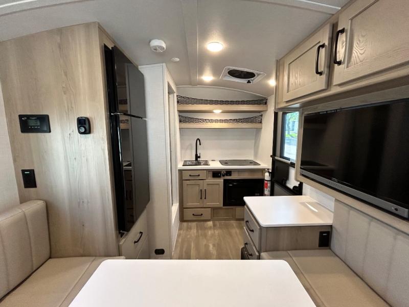 Whether you enjoy weekend trips to the woods or camping long term at the lake, this travel trailer will be perfect for your crew. There is a U-shaped dinette that can convert to sleeping space, plus a 26" x 74" bunk for an additional guest or two. You can prepare meals each day on the recessed cooktop or in the gas oven, and there is a 12V refrigerator for perishables. This model also includes an outside kitchen with a griddle, an On The Go ladder, plus a pass-through storage for fishing gear!