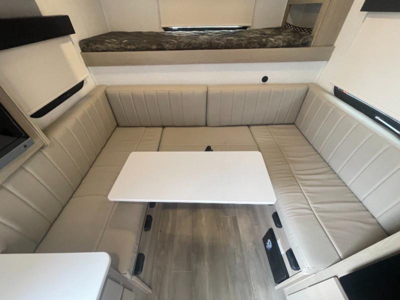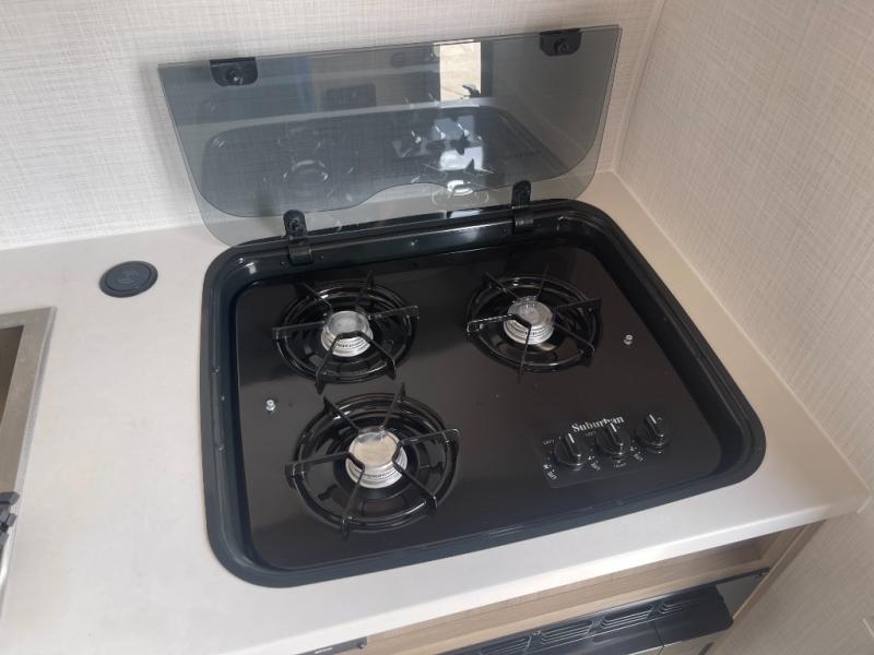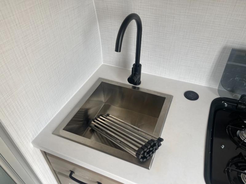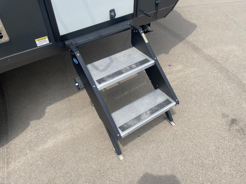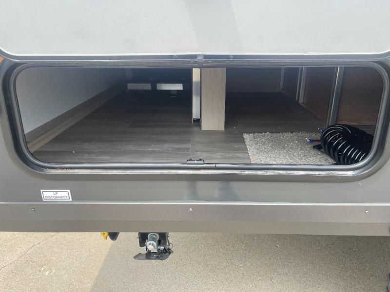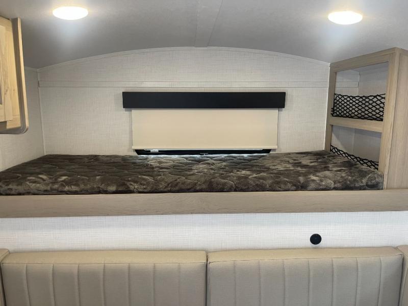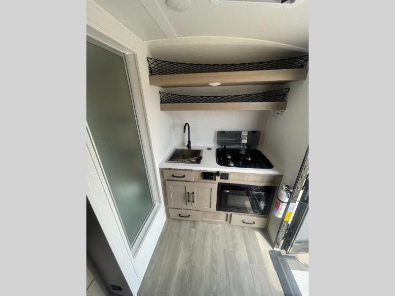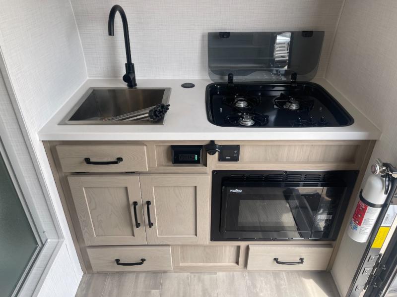 Whether you enjoy weekend trips to the woods or camping long term at the lake, this travel trailer will be perfect for your crew. There is a U-shaped dinette that can convert to sleeping space, plus a 26" x 74" bunk for an additional guest or two. You can prepare meals each day on the recessed cooktop or in the gas oven, and there is a 12V refrigerator for perishables. This model also includes an outside kitchen with a griddle, an On The Go ladder, plus a pass-through storage for fishing gear!