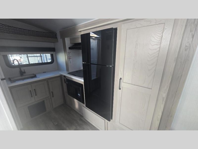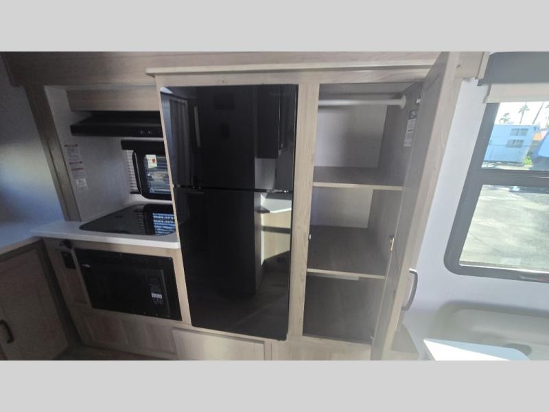 It's easy to see why this model is know a the "Swiss Army Knife" of RVs. It may be the smallest walkable trailer in the lineup, but it doesn't skim on features. The twin beds convert to a king-size bed for your comfort, and there is even a 32" 12V TV to enjoy in the evenings. The kitchen includes a three burner cooktop, a convection microwave, plus a 12V refrigerator for perishables. You'll find overhead compartments for your valuables, and exterior storage for your hiking gear!