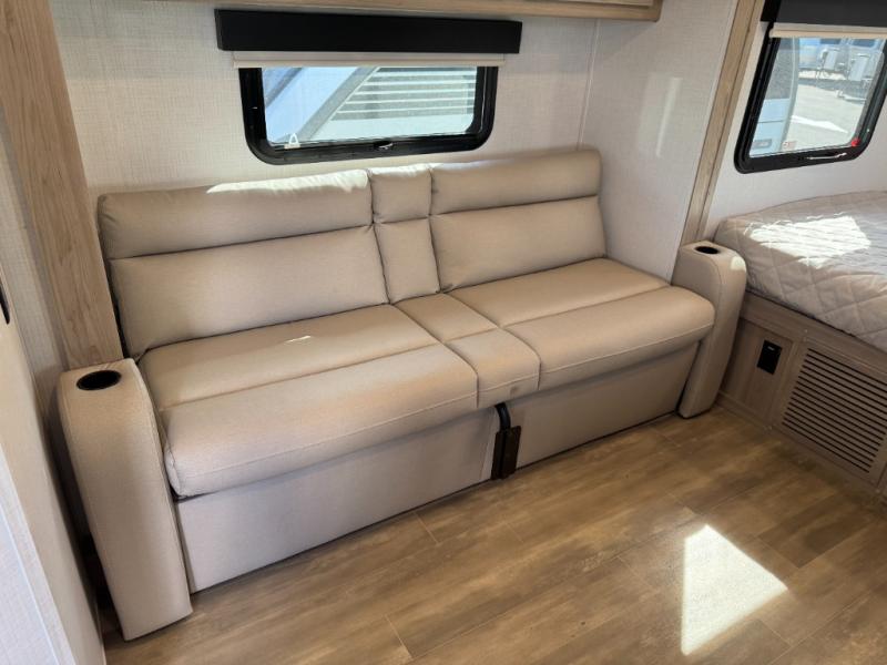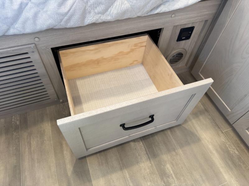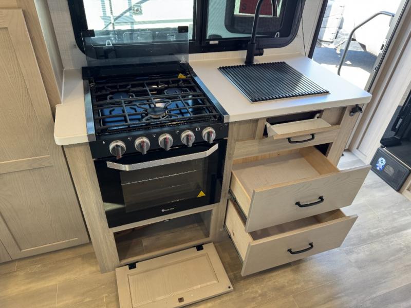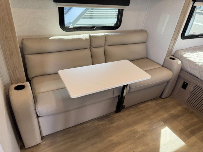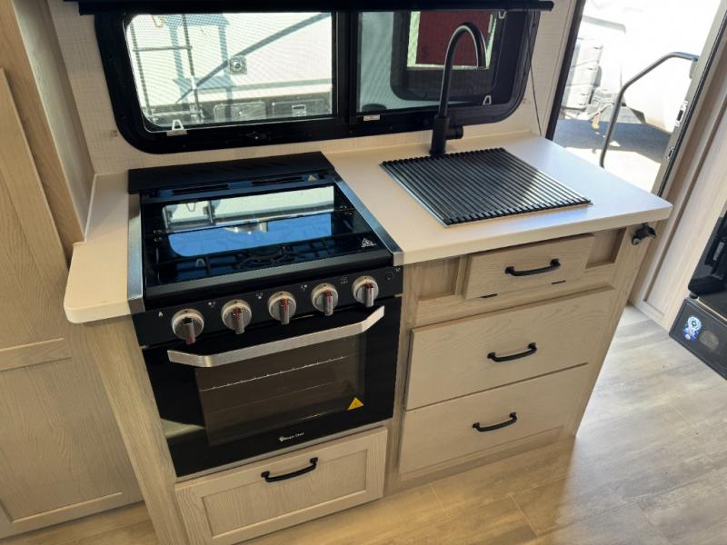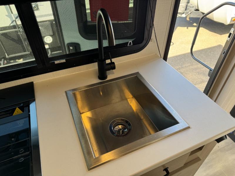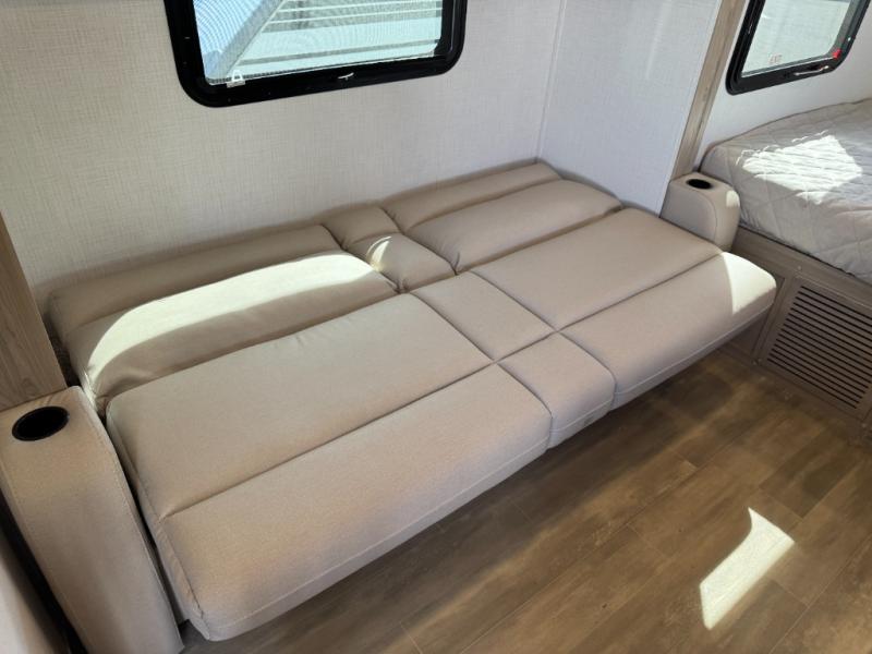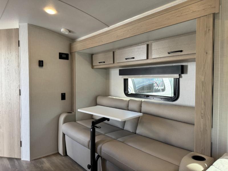 This is the perfect couple's trailer, so sneak away for a weekend in the woods. There is a 72" sofa with cupholders with a table that will be perfect for meals times and relaxing. This model includes a 32" 12V TV to keep you busy on those rainy days, and the queen bed will provide a great night's rest. This model also includes an outside griddle and an 11' power awning so you can enjoy those nice days outdoors!