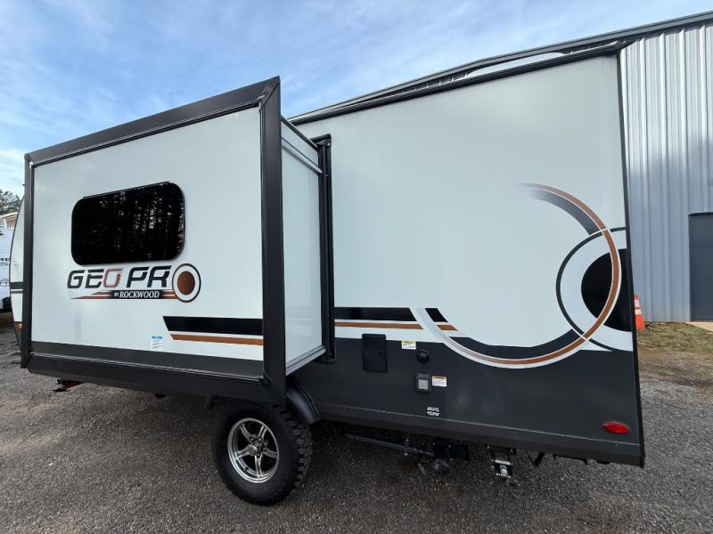 With any Rockwood GEO Pro travel trailer by Forest River you will enjoy easy towing, durable construction, and off-road capabilities with larger 15" tires and a lift kit! Package A includes a 200W solar panel and an 1800W inverter to go off-grid when you want, a tire pressure monitoring system and Key Alike door and compartment locks, plus a power awning to relax outdoors. Each model is constructed with complete composite wall construction for added strength and durability, and the torsion axle, Rubber-Ryde suspension will make towing easier than ever. Inside, you'll find sleek roller shades and hidden hinge cabinet doors, a 12V refrigerator and a microwave, plus a 20,000 BTU furnace to keep you warm during the colder camping months.