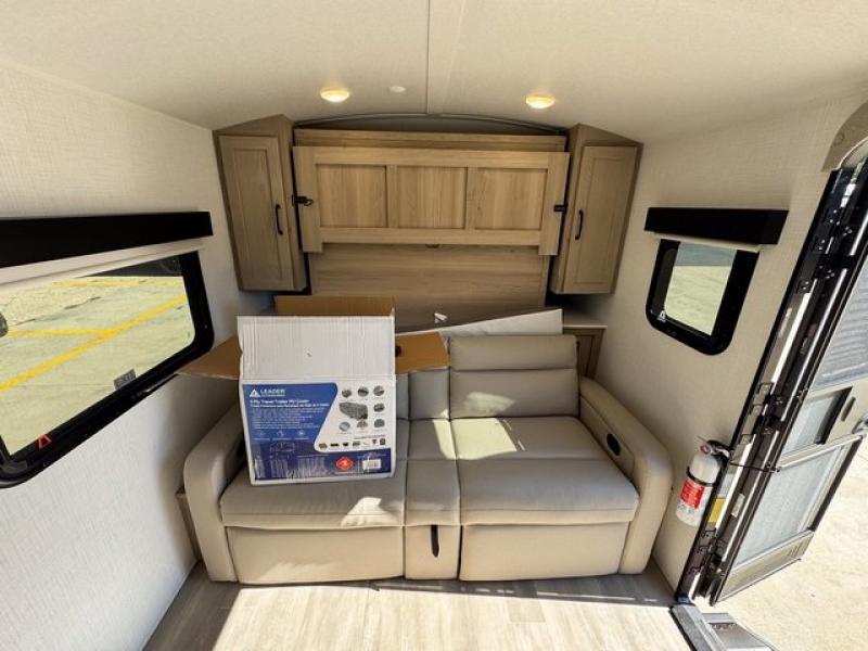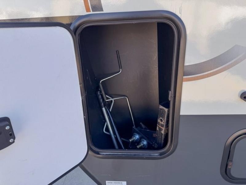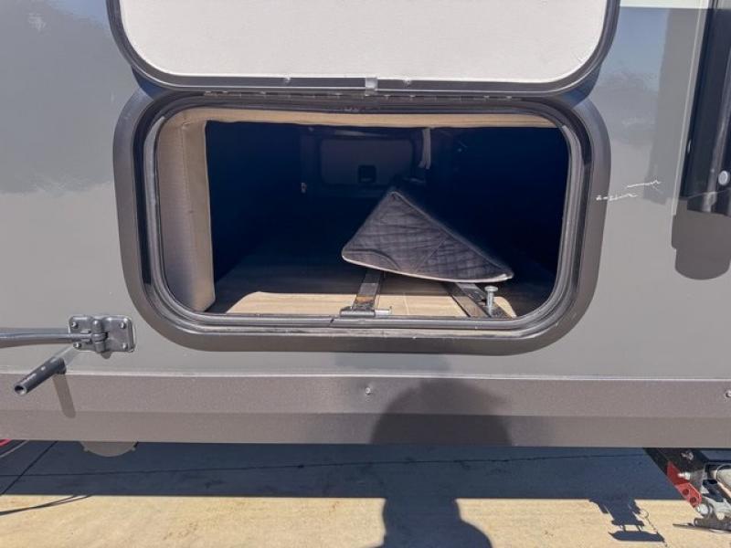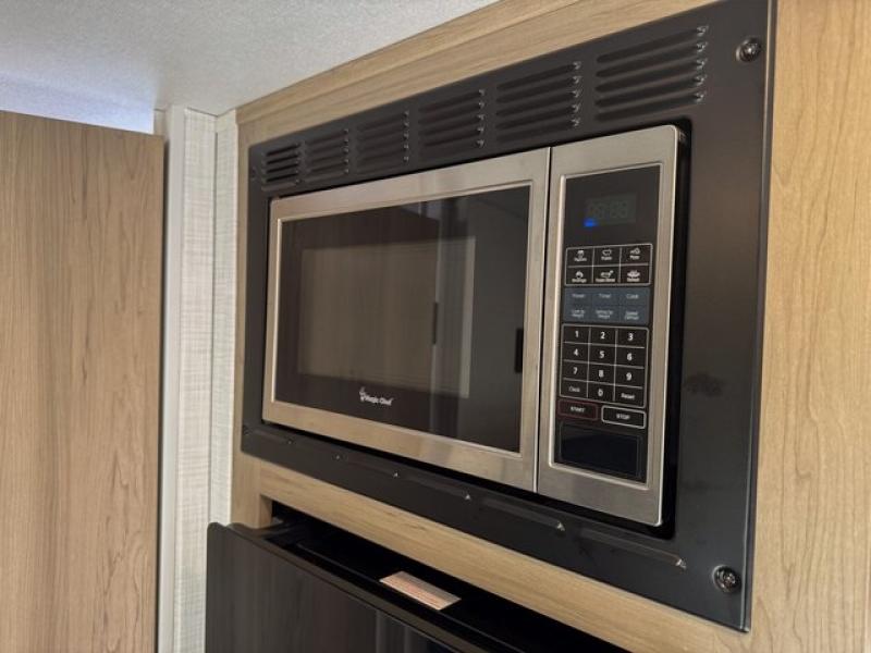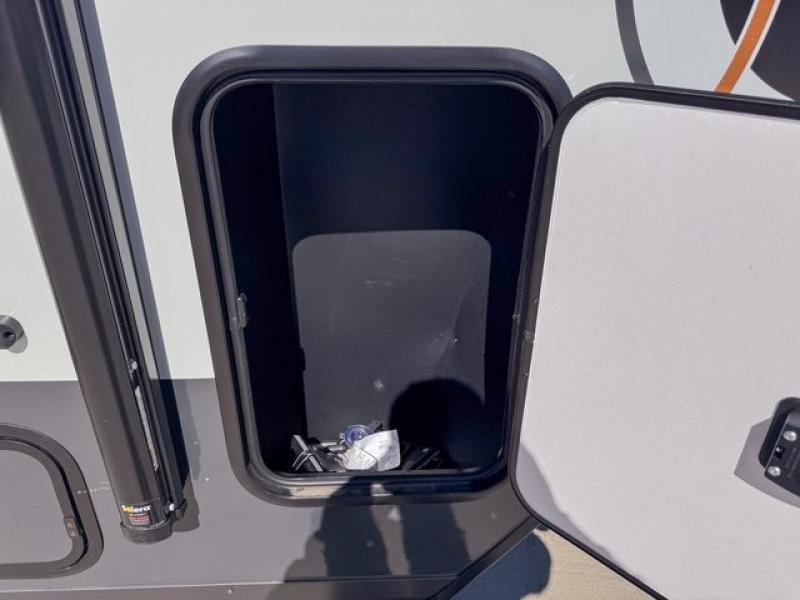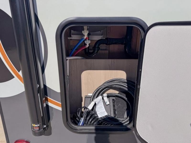 You will love how versatile this travel trailer is thanks to the Murphy bed up front. After you've had a great night's rest, just fold it up to relax on the 72" sofa. This will give the chef more space in the morning to prepare breakfast on the three burner cooktop or in the microwave oven. There is a 32" booth dinette to dine at, or you may just want to take your plate outdoors under the 14' power awning. The full rear bath includes a large linen closet to store clean towels and there is a Showermiser Water Saver you are sure to appreciate. You will appreciate a pass-through storage, plus additional exterior storage so you can bring along hiking gear, water tubes, and fishing poles! The optional Power Package available on this model includes three 200W solar panels, a 30 Amp solar charge controller, two Mastervolt smart remotes, and more off-grid features!