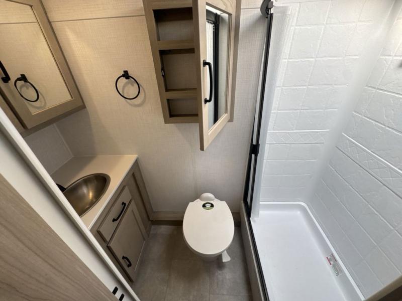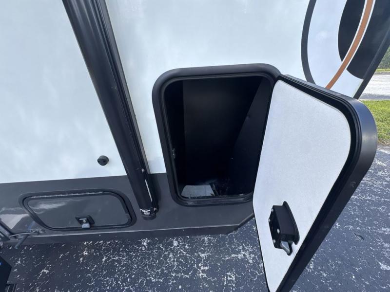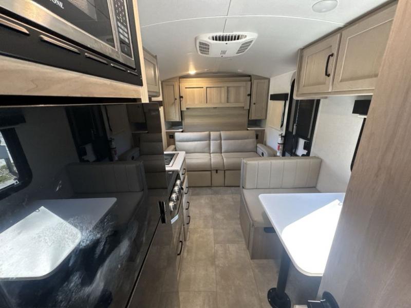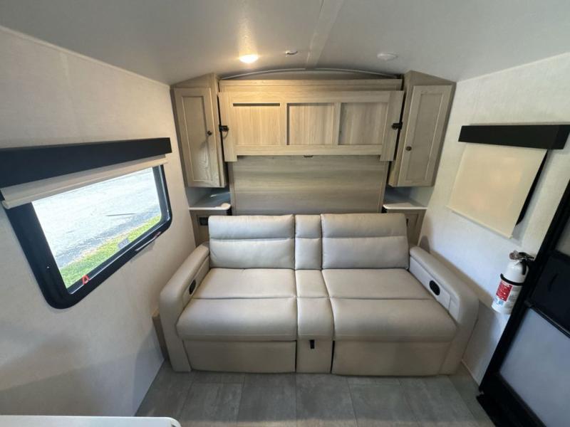 You will love how versatile this travel trailer is thanks to the Murphy bed up front. After you've had a great night's rest, just fold it up to relax on the 72" sofa. This will give the chef more space in the morning to prepare breakfast on the three burner cooktop or in the microwave oven. There is a 32" booth dinette to dine at, or you may just want to take your plate outdoors under the 14' power awning. The full rear bath includes a large linen closet to store clean towels and there is a Showermiser Water Saver you are sure to appreciate. You will appreciate a pass-through storage, plus additional exterior storage so you can bring along hiking gear, water tubes, and fishing poles! The optional Power Package available on this model includes three 200W solar panels, a 30 Amp solar charge controller, two Mastervolt smart remotes, and more off-grid features!