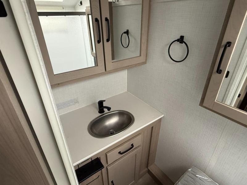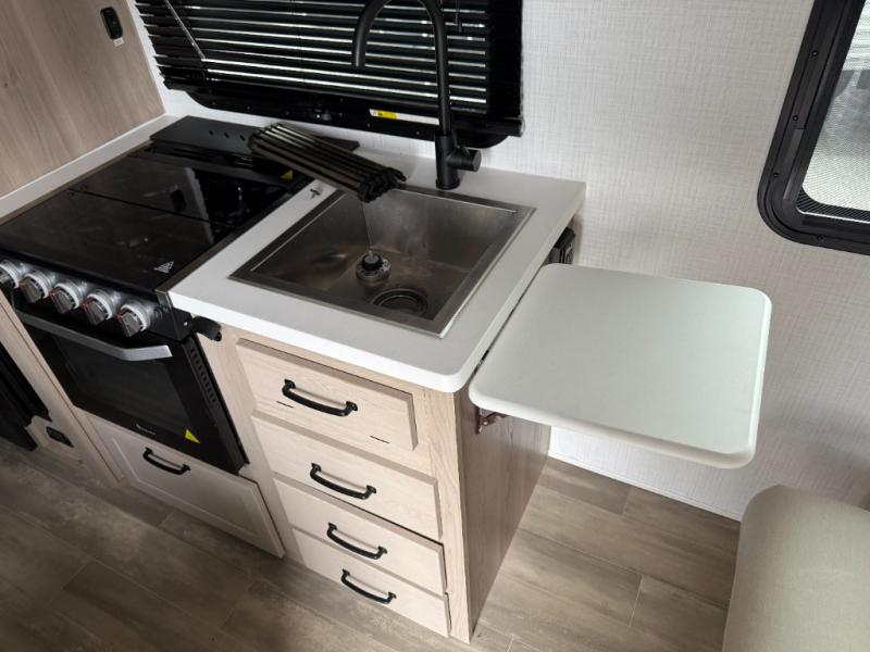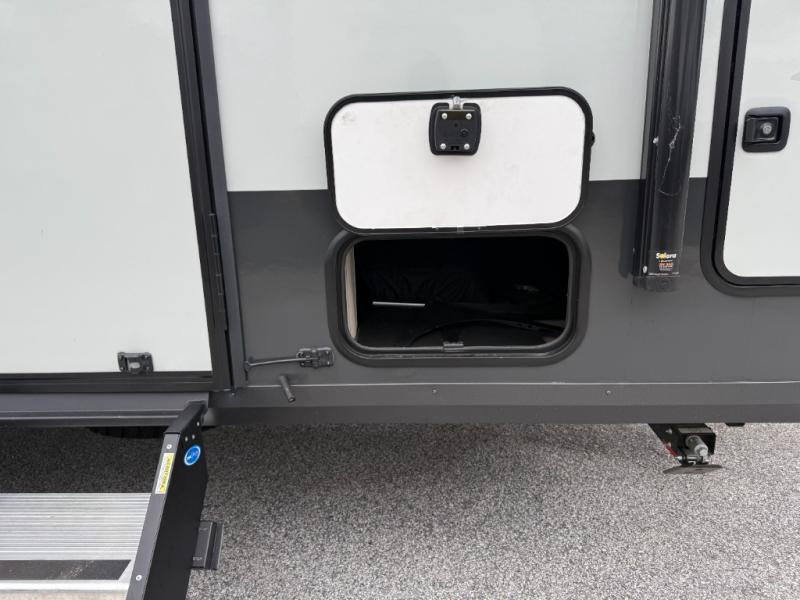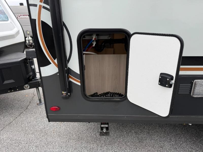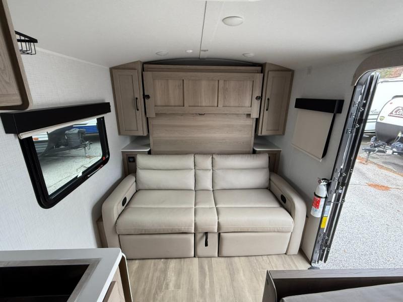 You will love how versatile this travel trailer is thanks to the Murphy bed up front. After you've had a great night's rest, just fold it up to relax on the 72" sofa. This will give the chef more space in the morning to prepare breakfast on the three burner cooktop or in the microwave oven. There is a 32" booth dinette to dine at, or you may just want to take your plate outdoors under the 14' power awning. The full rear bath includes a large linen closet to store clean towels and there is a Showermiser Water Saver you are sure to appreciate. You will appreciate a pass-through storage, plus additional exterior storage so you can bring along hiking gear, water tubes, and fishing poles! The optional Power Package available on this model includes three 200W solar panels, a 30 Amp solar charge controller, two Mastervolt smart remotes, and more off-grid features!