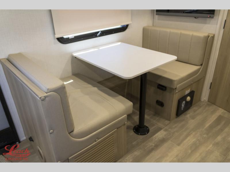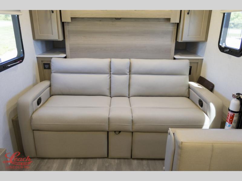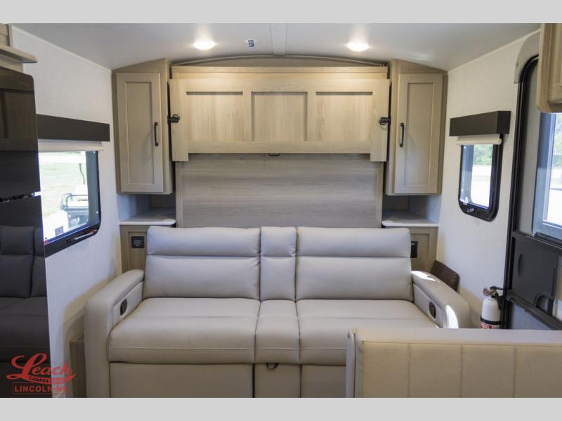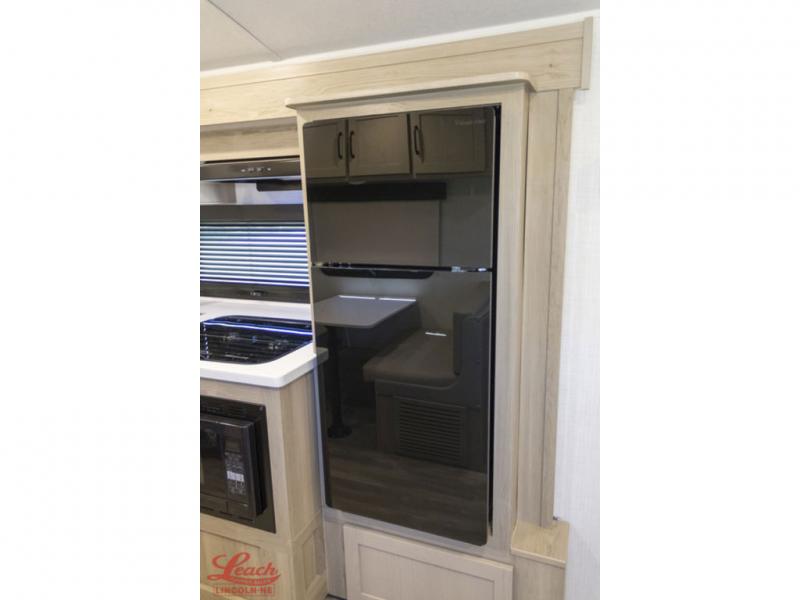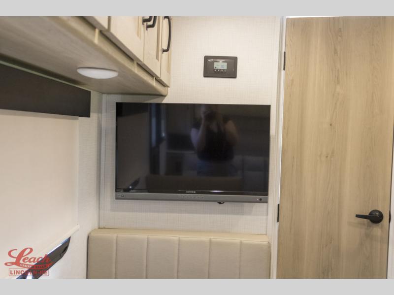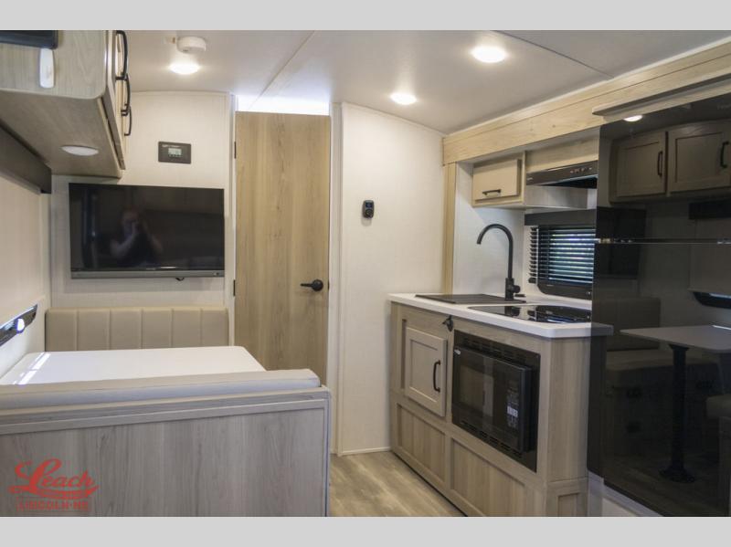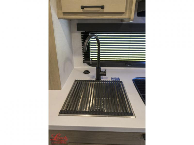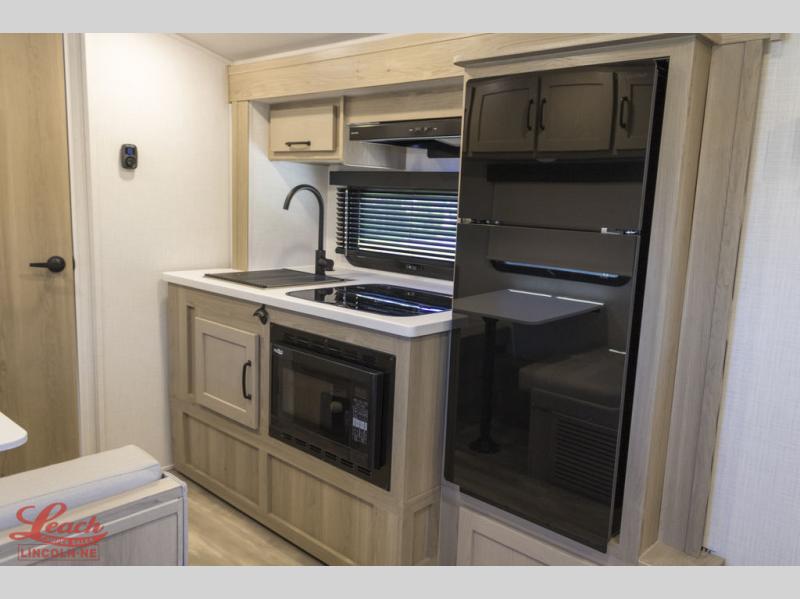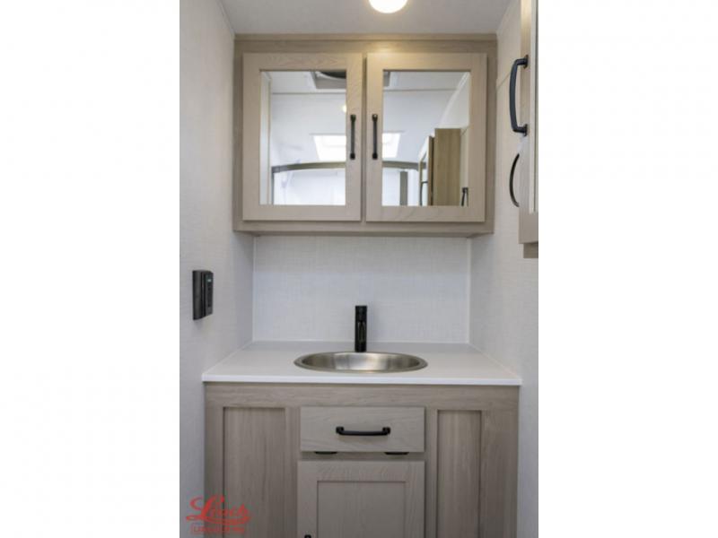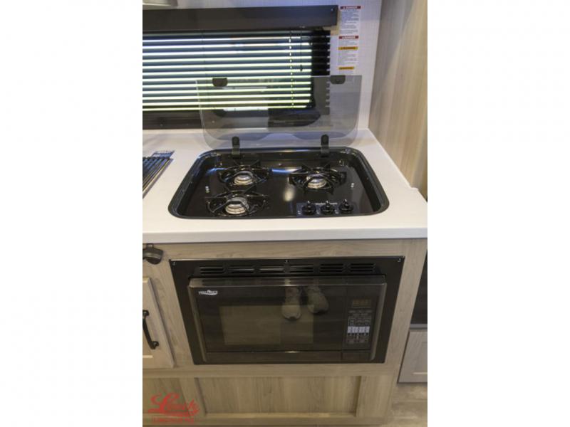 Comfortable sleeping space, convenient seating space, and a full rear bath makes this couple's trailer the one! You will love being able to relax on the sofa during the day, and sleep on the Murphy bed at night. There is a single slide out that will provide you more space to move around or cook meals, and the full bath includes a large shower so you won't feel cramped. If it's a rainy day you can watch movies on the 32" 12V TV, and if it's nice out, sit under the 14' power awning and cook lunch on the outside griddle. The possibilities are endless with this couple's trailer! The optional Power Package available on this model includes three 200W solar panels, a 30 Amp solar charge controller, two Mastervolt smart remotes, and more off-grid features!