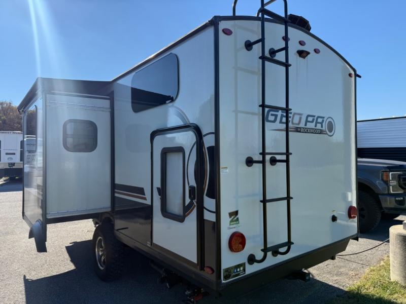 With any Rockwood GEO Pro travel trailer by Forest River you will enjoy easy towing, durable construction, and off-road capabilities with larger 15" tires and a lift kit! Package A includes a 200W solar panel and an 1800W inverter to go off-grid when you want, a tire pressure monitoring system and Key Alike door and compartment locks, plus a power awning to relax outdoors. Each model is constructed with complete composite wall construction for added strength and durability, and the torsion axle, Rubber-Ryde suspension will make towing easier than ever. Inside, you'll find sleek roller shades and hidden hinge cabinet doors, a 12V refrigerator and a microwave, plus a 20,000 BTU furnace to keep you warm during the colder camping months.