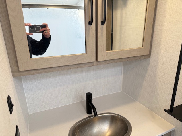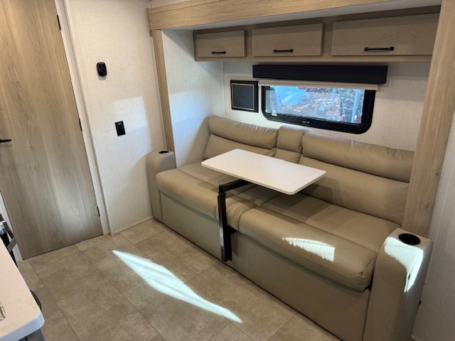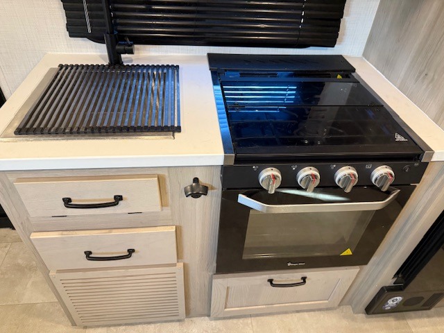 This travel trailer will feel more like home with its front bedroom and walk-around full-size bed. You'll enjoy the 32" 12V TV as you relax on the 72" sofa with a table and cupholders. The full rear bath includes a spacious shower to clean up in each day and there is a linen closet for clean towels. When you're ready to prepare dinner you'll have a three burner cooktop and microwave oven indoors, and a griddle outdoors! And don't forget the exterior storage allows you to bring along beach toys and tackle boxes. The optional Power Package available on this model includes three 200W solar panels, a 30 Amp solar charge controller, two Mastervolt smart remotes, and more off-grid features!