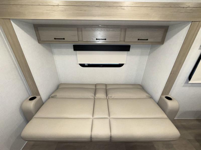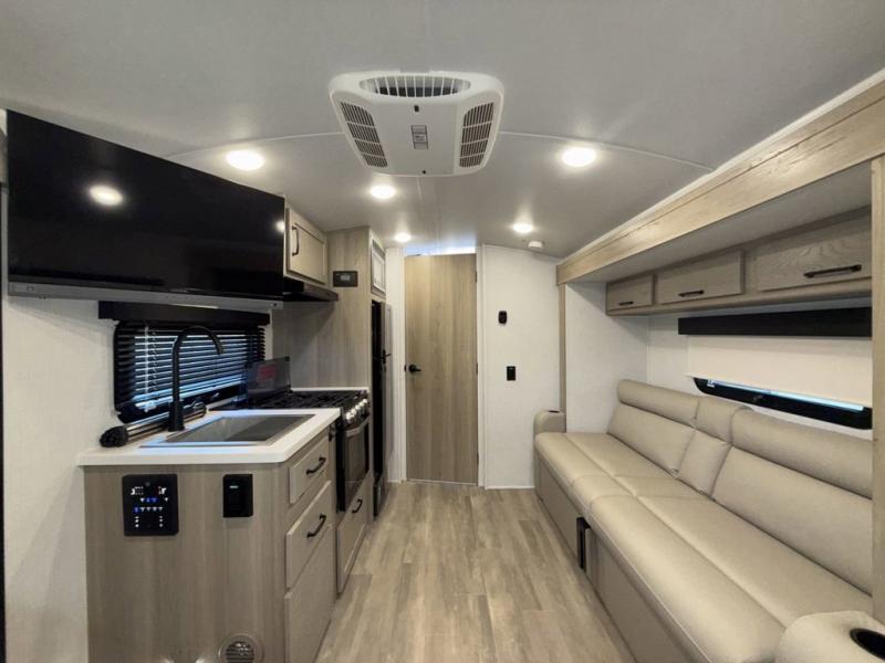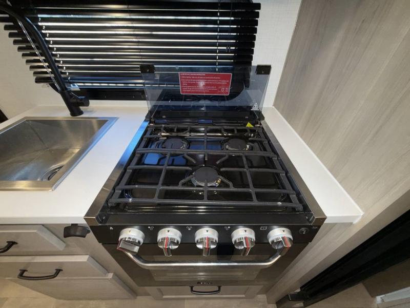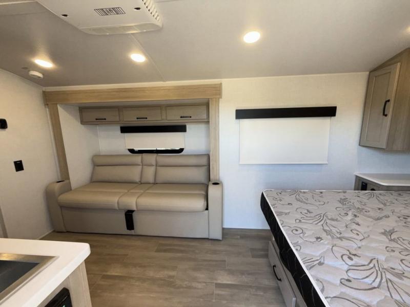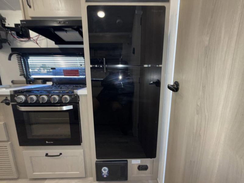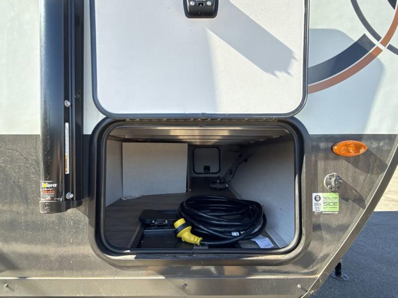 This travel trailer will feel more like home with its front bedroom and walk-around full-size bed. You'll enjoy the 32" 12V TV as you relax on the 72" sofa with a table and cupholders. The full rear bath includes a spacious shower to clean up in each day and there is a linen closet for clean towels. When you're ready to prepare dinner you'll have a three burner cooktop and microwave oven indoors, and a griddle outdoors! And don't forget the exterior storage allows you to bring along beach toys and tackle boxes. The optional Power Package available on this model includes three 200W solar panels, a 30 Amp solar charge controller, two Mastervolt smart remotes, and more off-grid features!