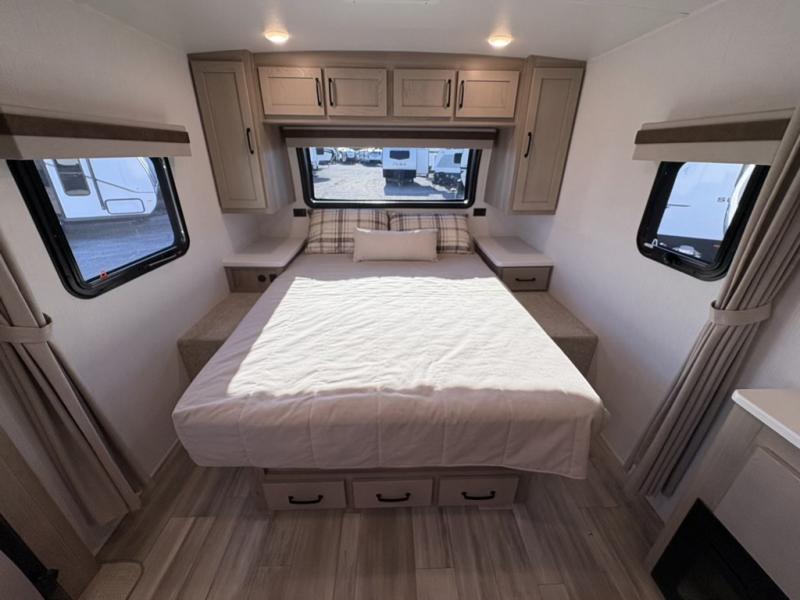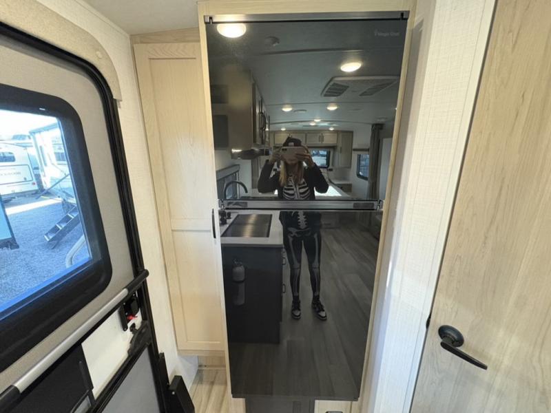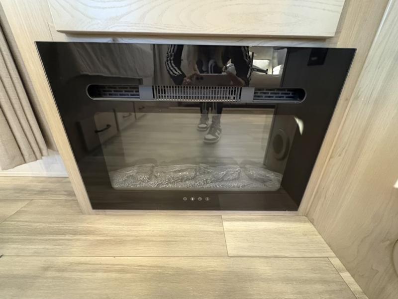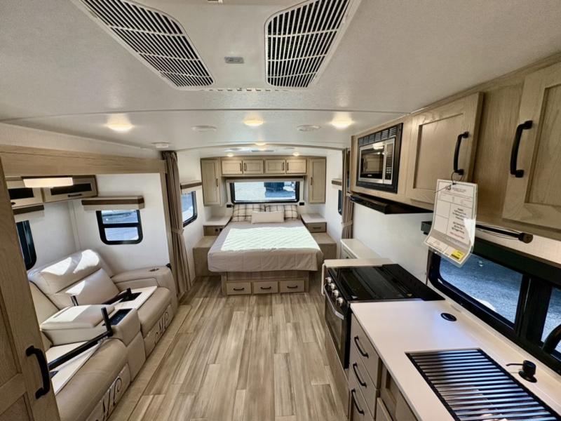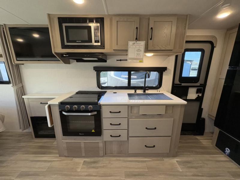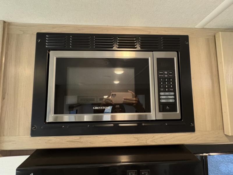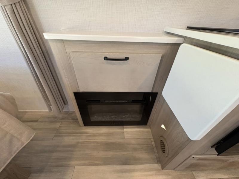 Enjoy the camping season with your spouse, friend, or significant other in this cozy travel trailer for two. Each morning, you can have your coffee on the 67" theater seats with a table within the slide out, then head outdoors to make pancakes on the outdoor griddle with an LP hookup. The interior kitchen includes a three burner cooktop, a microwave oven, plus a 12 volt refrigerator for perishables. An entertainment center with a fireplace will make your space feel more like home, and what's better than sleeping on your own queen bed with dual bedroom wardrobes for your clothes!?