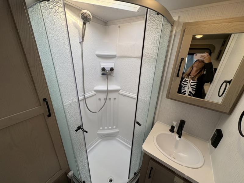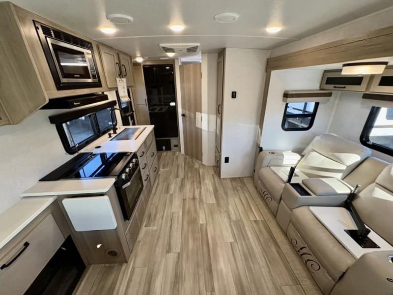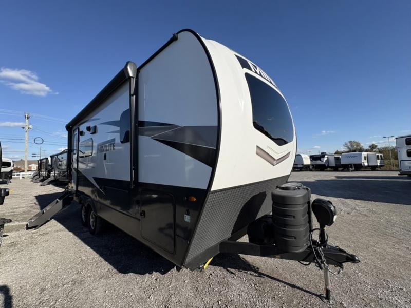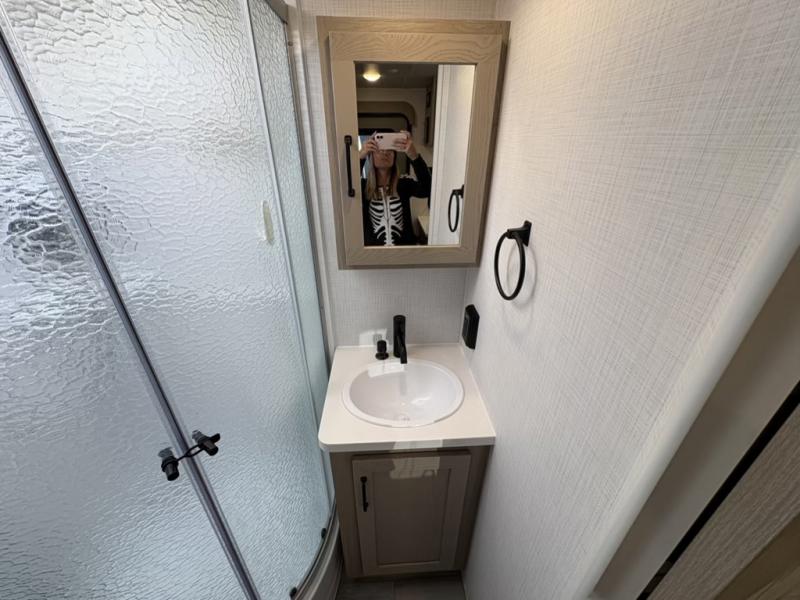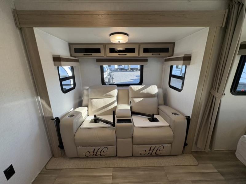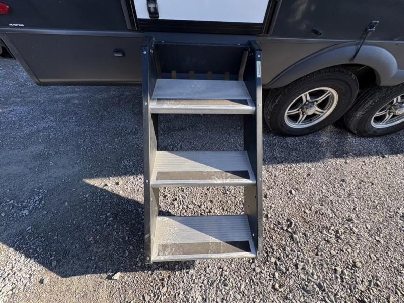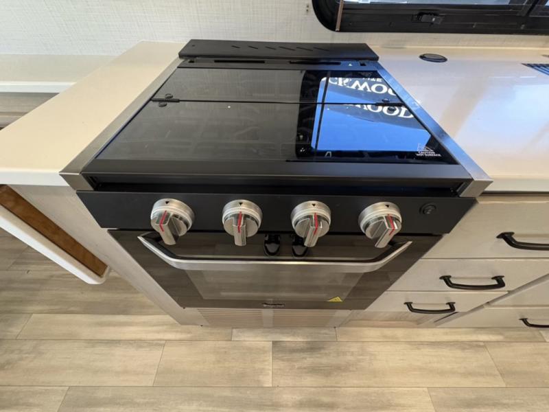 Enjoy the camping season with your spouse, friend, or significant other in this cozy travel trailer for two. Each morning, you can have your coffee on the 67" theater seats with a table within the slide out, then head outdoors to make pancakes on the outdoor griddle with an LP hookup. The interior kitchen includes a three burner cooktop, a microwave oven, plus a 12 volt refrigerator for perishables. An entertainment center with a fireplace will make your space feel more like home, and what's better than sleeping on your own queen bed with dual bedroom wardrobes for your clothes!?