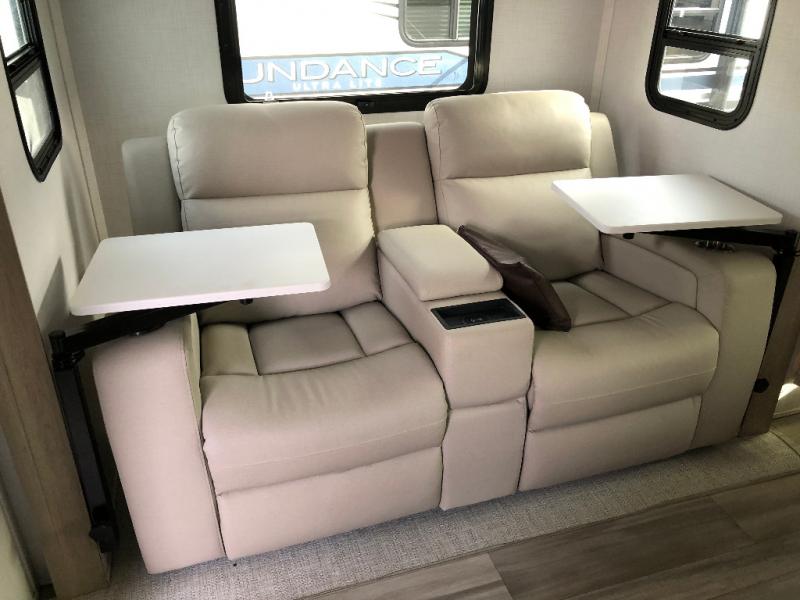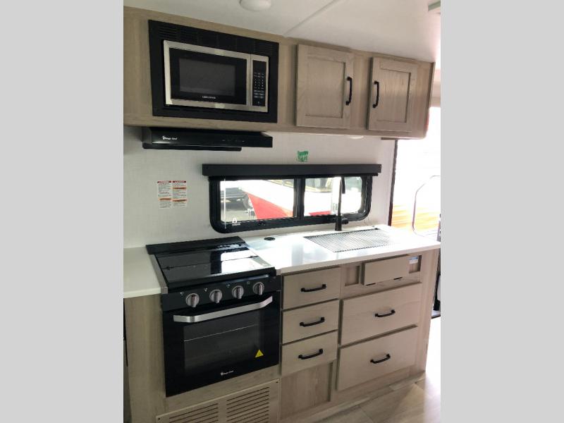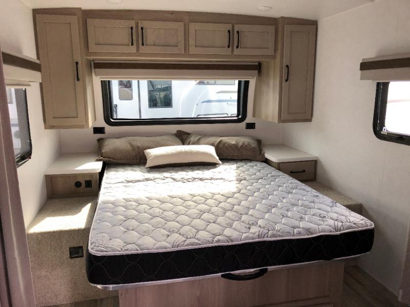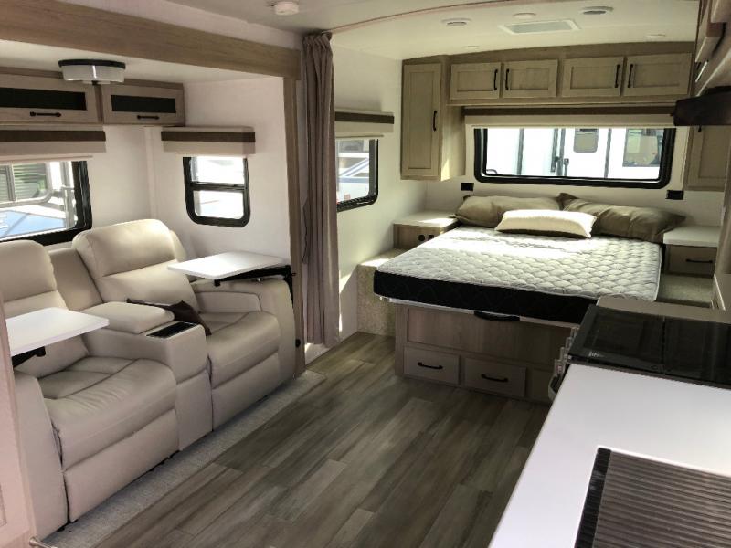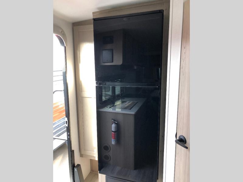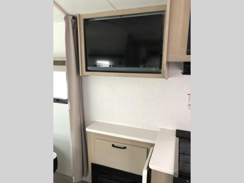 Enjoy the camping season with your spouse, friend, or significant other in this cozy travel trailer for two. Each morning, you can have your coffee on the 67" theater seats with a table within the slide out, then head outdoors to make pancakes on the outdoor griddle with an LP hookup. The interior kitchen includes a three burner cooktop, a microwave oven, plus a 12 volt refrigerator for perishables. An entertainment center with a fireplace will make your space feel more like home, and what's better than sleeping on your own queen bed with dual bedroom wardrobes for your clothes!?